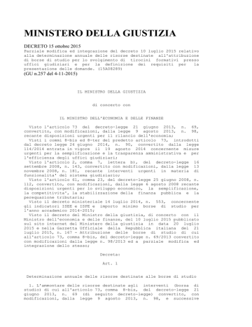 MINISTERO DELLA GIUSTIZIA DECRETO 15 ottobre 2015 Parziale modifica ed integrazione del decreto 10 luglio 2015 relativo alla determinazione annuale delle risorse destinate all'attribuzione di borse di studio per lo svolgimento di tirocini formativi presso uffici giudiziari e per la definizione dei requisiti per la presentazione delle domande. (15A08289) (GU n.257 del 4-11-2015) IL MINISTRO DELLA GIUSTIZIA di concerto con IL MINISTRO DELL'ECONOMIA E DELLE FINANZE Visto l'articolo 73 del decreto-legge 21 giugno 2013, n. 69, convertito, con modificazioni, dalla legge 9 agosto 2013, n. 98, recante disposizioni urgenti per il rilancio dell'economia; Visti i commi 8-bis ed 8-ter del predetto articolo 73, introdotti dal decreto legge 24 giugno 2014, n. 90, convertito dalla legge 114/2014 entrata in vigore il 19 agosto 2014 concernente misure urgenti per la semplificazione e la trasparenza amministrativa e per l'efficienza degli uffici giudiziari; Visto l'articolo 2, comma 7, lettera b), del decreto-legge 16 settembre 2008, n. 143, convertito con modificazioni, dalla legge 13 novembre 2008, n. 181, recante interventi urgenti in materia di funzionalita' del sistema giudiziario; Visto l'articolo 61, comma 23, del decreto-legge 25 giugno 2008, n. 112, convertito, con modificazioni, dalla legge 6 agosto 2008 recante disposizioni urgenti per lo sviluppo economico, la semplificazione, la competitivita', la stabilizzazione della finanza pubblica e la perequazione tributaria; Visto il decreto ministeriale 14 luglio 2014, n. 553, concernente gli indicatori ISEE e ISPE e importo minimo borse di studio per l'anno accademico 2014-2015; Visto il decreto del Ministro della giustizia, di concerto con il Ministro dell'economia e delle finanze, del 10 luglio 2015 pubblicato sul sito internet del Ministero della giustizia in data 20 luglio 2015 e nella Gazzetta Ufficiale della Repubblica italiana del 21 luglio 2015, n. 167 - Attribuzione delle borse di studio di cui all'articolo 73, comma 8-bis, del decreto-legge n. 69/2013 convertito con modificazioni dalla legge n. 98/2013 ed a parziale modifica ed integrazione dello stesso; Decreta: Art. 1 Determinazione annuale delle risorse destinate alle borse di studio 1. L'ammontare delle risorse destinate agli interventi (borsa di studio) di cui all'articolo 73, comma 8-bis, del decreto-legge 21 giugno 2013, n. 69 (di seguito decreto-legge) convertito, con modificazioni, dalla legge 9 agosto 2013, n. 98, e successive modifiche, e' determinato, per l'anno 2015, nei limiti di € 8.000.000 nell'ambito delle risorse di cui all'articolo 2, comma 7, lettera b), del decreto-legge 16 settembre 2008, n. 143, convertito, con modificazioni, dalla legge 13 novembre 2008, n. 181, stanziate sul capitolo 1537 dello stato di previsione della spesa del Ministero della giustizia. 2. Il Ministro della giustizia provvede ai sensi dell'articolo 1, comma 1304, delle legge 27 dicembre 2006, n. 296, alle occorrenti variazioni di bilancio a valere sul fondo di cui al citato capitolo 1537 in favore del pertinente capitolo di gestione. Art. 2 Requisiti per l'attribuzione delle borse di studio 1. Le borse di studio sono attribuite, ai sensi del successivo articolo 3, ai soggetti che ne fanno richiesta nei termini e secondo le modalita' indicate nei seguenti commi. L'accesso al beneficio della borsa di studio ha luogo, fino ad esaurimento delle risorse disponibili per ciascun semestre, secondo l'ordine di graduatoria, formata, a norma dell'articolo 3, in base al valore crescente dell'ISEE calcolato per le prestazioni erogate agli studenti nell'ambito del diritto allo studio universitario. 2. La domanda di assegnazione della borsa di studio deve contenere, a pena di inammissibilita' e con dichiarazione resa ai sensi del decreto del Presidente della Repubblica 28 dicembre 2000, n. 445 e successive modificazioni: a) le generalita' e i dati anagrafici del richiedente; b) il codice fiscale; c) la data di inizio del tirocinio; d) il valore dell'indicatore ISEE calcolato per le prestazioni erogate agli studenti nell'ambito del diritto allo studio universitario; e) l'indirizzo di posta elettronica ordinaria a cui l'interessato intende ricevere ogni comunicazione relativa alla borsa di studio. 3. Alla domanda di cui al comma 2 deve essere allegata l'attestazione dell'ISEE calcolato per le prestazioni erogate agli studenti nell'ambito del diritto allo studio universitario. 4. La domanda, firmata per esteso, deve essere presentata dall'interessato all'ufficio giudiziario della giustizia ordinaria o amministrativa presso il quale e' svolto il tirocinio formativo entro il termine perentorio di 30 giorni dalla pubblicazione del presente decreto correttivo sul sito internet del Ministero della giustizia, per l'assegnazione della borsa di studio relativamente all'attivita' svolta nel primo semestre 2015. Entro il medesimo termine deve essere presentata la domanda anche se l'attivita' formativa si e' gia' conclusa alla data di entrata in vigore del presente decreto. Con la disposizione di cui al presente comma sono riaperti i termini previsti dall'articolo 2, comma 4, del decreto del Ministro della giustizia, di concerto con il Ministro dell'economia e delle finanze, del 10 luglio 2015, pubblicato sul sito internet del Ministero della giustizia in data 20 luglio 2015 e nella Gazzetta Ufficiale della Repubblica italiana del 21 luglio 2015, n. 167. 5. I tirocinanti che hanno iniziato l'attivita' formativa entro il 30 giugno 2015 sebbene non abbiano presentato la domanda a norma del comma 4, possono presentare, entro il termine perentorio del 31 dicembre 2015 la domanda di assegnazione della borsa di studio per concorrere alla ulteriore graduatoria di cui all'articolo 3, comma 5 e relativa all'attivita' svolta dal 1° luglio al 31 dicembre 2015. Entro il medesimo termine di cui al periodo precedente possono presentare la domanda anche i tirocinanti che hanno iniziato l'attivita' formativa in data successiva al 30 giug