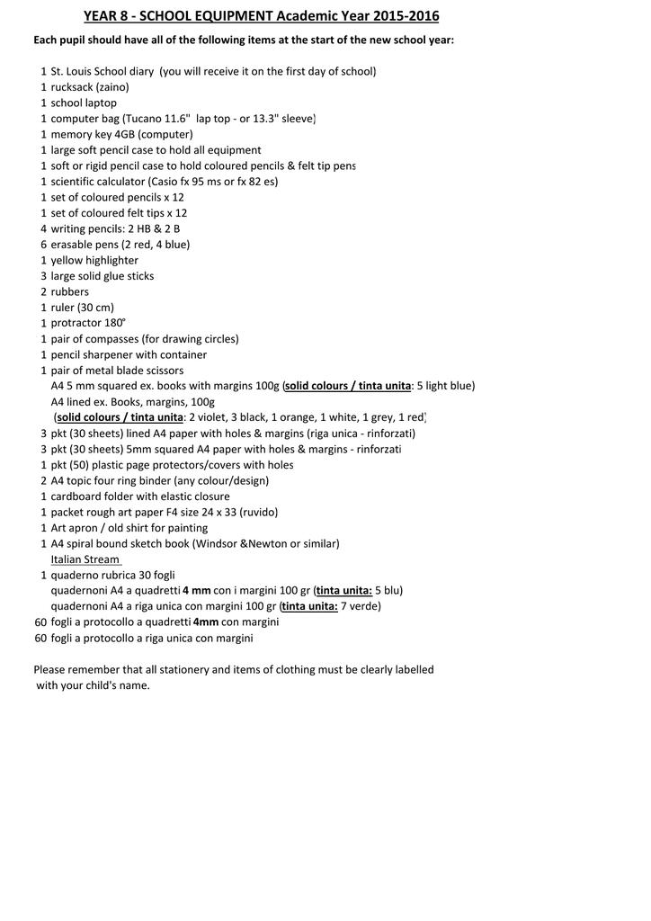 YEAR 8 - SCHOOL EQUIPMENT Academic Year 2015-2016 Each pupil should have all of the following items at the start of the new school year: 1 1 1 1 1 1 1 1 1 1 4 6 1 3 2 1 1 1 1 1 3 3 1 2 1 1 1 1 1 60 60 St. Louis School diary (you will receive it on the first day of school) rucksack (zaino) school laptop computer bag (Tucano 11.6" lap top - or 13.3" sleeve) memory key 4GB (computer) large soft pencil case to hold all equipment soft or rigid pencil case to hold coloured pencils & felt tip pens scientific calculator (Casio fx 95 ms or fx 82 es) set of coloured pencils x 12 set of coloured felt tips x 12 writing pencils: 2 HB & 2 B erasable pens (2 red, 4 blue) yellow highlighter large solid glue sticks rubbers ruler (30 cm) protractor 180° pair of compasses (for drawing circles) pencil sharpener with container pair of metal blade scissors A4 5 mm squared ex. books with margins 100g (solid colours / tinta unita: 5 light blue) A4 lined ex. Books, margins, 100g (solid colours / tinta unita: 2 violet, 3 black, 1 orange, 1 white, 1 grey, 1 red) pkt (30 sheets) lined A4 paper with holes & margins (riga unica - rinforzati) pkt (30 sheets) 5mm squared A4 paper with holes & margins - rinforzati pkt (50) plastic page protectors/covers with holes A4 topic four ring binder (any colour/design) cardboard folder with elastic closure packet rough art paper F4 size 24 x 33 (ruvido) Art apron / old shirt for painting A4 spiral bound sketch book (Windsor &Newton or similar) Italian Stream quaderno rubrica 30 fogli quadernoni A4 a quadretti 4 mm con i margini 100 gr (tinta unita: 5 blu) quadernoni A4 a riga unica con margini 100 gr (tinta unita: 7 verde) fogli a protocollo a quadretti 4mm con margini fogli a protocollo a riga unica con margini Please remember that all stationery and items of clothing must be clearly labelled with your child's name.
