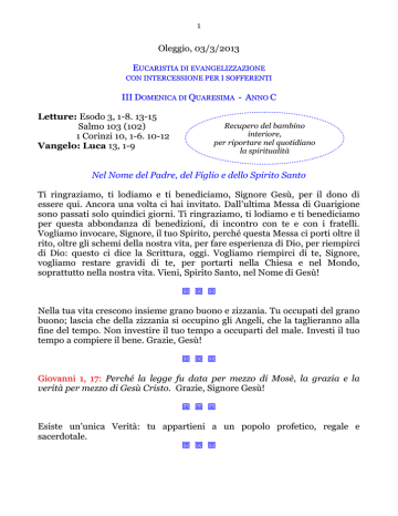 1 Oleggio, 03/3/2013 EUCARISTIA DI EVANGELIZZAZIONE CON INTERCESSIONE PER I SOFFERENTI III DOMENICA DI QUARESIMA - ANNO C Letture: Esodo 3, 1-8. 13-15 Salmo 103 (102) 1 Corinzi 10, 1-6. 10-12 Vangelo: Luca 13, 1-9 Recupero del bambino interiore, per riportare nel quotidiano la spiritualità Nel Nome del Padre, del Figlio e dello Spirito Santo Ti ringraziamo, ti lodiamo e ti benediciamo, Signore Gesù, per il dono di essere qui. Ancora una volta ci hai invitato. Dall’ultima Messa di Guarigione sono passati solo quindici giorni. Ti ringraziamo, ti lodiamo e ti benediciamo per questa abbondanza di benedizioni, di incontro con te e con i fratelli. Vogliamo invocare, Signore, il tuo Spirito, perché questa Messa ci porti oltre il rito, oltre gli schemi della nostra vita, per fare esperienza di Dio, per riempirci di Dio: questo ci dice la Scrittura, oggi. Vogliamo riempirci di te, Signore, vogliamo restare gravidi di te, per portarti nella Chiesa e nel Mondo, soprattutto nella nostra vita. Vieni, Spirito Santo, nel Nome di Gesù! Nella tua vita crescono insieme grano buono e zizzania. Tu occupati del grano buono; lascia che della zizzania si occupino gli Angeli, che la taglieranno alla fine del tempo. Non investire il tuo tempo a occuparti del male. Investi il tuo tempo a compiere il bene. Grazie, Gesù! Giovanni 1, 17: Perché la legge fu data per mezzo di Mosè, la grazia e la verità per mezzo di Gesù Cristo. Grazie, Signore Gesù! Esiste un’unica Verità: tu appartieni a un popolo profetico, regale e sacerdotale. 2 ATTO PENITENZIALE In questa Messa, pregheremo ancora per l’Albero Genealogico: è stata una richiesta del Signore, sia per diverse persone, che si sono assentate la volta scorsa, sia perché c’è più bisogno, in questo tempo di Seminario per l’Effusione dello Spirito Santo, di sanare il nostro Albero Genealogico, di sanare gli anniversari, i dispersi, le persone non amate. Quello che mi ha fatto capire il Signore, pregando per l’Albero Genealogico è il perdono da dare. Scioglietelo e lasciatelo andare! Siamo invitati a lasciare andare e perdonare. Questa mattina, durante la Messa, il Signore mi diceva proprio di non combattere la zizzania, ma di impiegare il tempo, per lavorare sul grano buono. Questo messaggio è per me e per voi. Non perdiamo il tempo a portare rancori o a combattere il male. Il buio si scaccia, accendendo la luce. Accenditi, sii luce. Adesso passerò con l’acqua benedetta e chiederemo al Signore la forza. Dopo l’assoluzione, anticiperemo il segno della pace. Sentivo: Se dunque presenti la tua offerta sull’altare e lì ti ricordi che tuo fratello ha qualche cosa contro di te, lascia lì il tuo dono davanti all’altare e vai prima a riconciliarti con tuo fratello, poi torna ad offrire il dono. (Matteo 5, 23-24) Ci sono persone, che si sono relazionate male nella nostra vita; è inutile che le teniamo ancora nel cuore. Abbracciamole e lasciamole andare. Ti ringraziamo, Signore Gesù, ti lodiamo e ti benediciamo, perché vogliamo entrare in questo perdono cosmico, universale, dove lasciamo andare le persone, che abbiamo tenuto in ceppi e catene, persone, che abbiamo tenuto con rancore, perché credevamo che fosse giusto così. Signore, grazie, perché ci dici che noi non dobbiamo combattere la zizzania, dobbiamo lasciarla lì; provvederanno gli Angeli. Signore, durante questo passaggio dell’acqua benedetta, donaci forza. Nel Battesimo noi prendiamo autorità. Al di là del rito, noi abbiamo l’autorità di figli di Dio. In sacrestia ci hai detto: Voi siete dei. Noi abbiamo la forza di Dio, con la quale abbiamo la capacità di perdonare, di essere più forti di qualsiasi offesa e di lasciare andare. Per questo, vogliamo rinverdire la grazia del Battesimo con questa benedizione dell’acqua, per lasciare andare ed essere, come Dio, al di sopra del bene e del male, essere in questa dimensione di Eternità e di Amore pieno. Passa in mezzo a noi, Signore Gesù, con questa acqua benedetta! 3 OMELIA Lode! Lode! Lode! Amen! Alleluia! Gloria al Signore, sempre! Amen! Lode! Lode! Lode! Oltre Ci sono canzoni, che sono la colonna sonora della nostra vita. Ci sono passi della Scrittura, che sono colonna spirituale della nostra vita. Fra questi c’è il passo della prima lettura, che abbiamo ascoltato, dove Mosè decide di andare OLTRE. La nostra avventura, come Fraternità, parte proprio da questo passo, quando, un giorno, abbiamo deciso di rompere gli schemi della religione e andare oltre il cammino consueto. Per questo motivo, il giornalino si intitola: In quei giorni Il passo inizia con l’espressione “In quei giorni”, che è un termine tecnico, per avvisare il lettore che sta leggendo un passo di liberazione. In quei giorni, mentre Mosè stava pascolando il gregge di Ietro, suo suocero, sacerdote di Madian, condusse il bestiame oltre il deserto e arrivò al monte di Dio, l’Oreb. Scopriamo il personaggio di Mosè Chi è Mosè? Perché si trova all’estero? Che cosa sta facendo? Vediamo la sua storia pregressa. Poiché è un brano di liberazione, se anche noi vogliamo fare questo passo e andare oltre, dobbiamo usare le stesse dinamiche di Mosè. Per certo, sappiamo che gli Ebrei non sono mai stati in Egitto. Allora abbiamo letto una storia inventata? Visto che il brano si trova nella Bibbia, che è un libro sacro, la quale è scritta in Ebraico, che è lingua sacra, c’è un messaggio, che dobbiamo prendere per la nostra vita di oggi. Gli Ebrei sono arrivati in Egitto, attraverso Giuseppe, diventato Vicerè, e ormai morto; anche il vecchio Faraone è morto. Così gli Ebrei hanno perso gli appoggi politici e religiosi. Ospiti in terra straniera, vengono trattati male dal Faraone, che assume dei sovrintendenti ai lavori e opprime il popolo, facendo costruire due città deposito, due “città ghetto”, sul delta del Nilo: Pitom e Ramses (città che non esistono). In Ebraico antico, il nome di quelle città significa: DOVE LE PORTE SONO CHIU