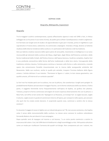 SOPHIA VARI Biografia, Bibliografia, Esposizioni Biografia Tra le maggiori scultrici contemporanee, questa affascinante signora è nata nel 1940 a Vari, in Attica (villaggio da cui ha preso il suo nome d'arte), da padre greco (Peter Canellopoulos) e madre ungherese. Si è formata con lunghi anni di studio e di apprendistato in giro per il mondo, prima in Inghilterra e poi soprattutto in Francia dove, sedicenne, ha cominciato a dipingere. Vivendo a Parigi, diviene un’attenta studiosa delle diverse tendenze della scultura e in particolare del Cubismo e del Surrealismo. Dal suo talento creativo nascono delle opere piene di sensualità, movimento e intelligenza in cui sono riconoscibili gli elementi della scultura dei Maya, degli Egizi, degli Olmec dell’America centrale e delle forme tradizionali delle Cicladi, dell’Antica Grecia e dell’epoca barocca. Scultrice completa, Sophia Vari è una profonda conoscitrice delle forme dell’arte tradizionale e della loro storia. Consapevole della tradizione artistica classica, l'artista greca continua a lavorare sulla forma e sulla volumetria, creando opere che armonizzano l'eredità rinascimentale con la ricerca delle avanguardie artistiche del Novecento. Nelle sue sculture, anche in quelle più astratte, traspare l’incisiva bellezza della figura umana. L’artista dichiara il suo intento: “Permeare le figure e i colori, la loro stessa geometria, con qualità umane, all’interno di un contesto spaziale”. La Vari non ha iniziato però con la scultura, ma con la pittura, che caratterizza i lunghi anni parigini: fu probabilmente Rubens ad esercitare il maggior fascino, con le forme voluttuose delle sue donne. D'altra parte, il soggetto femminile torna frequentemente nell'opera di Sophia, sia grafica che plastica. Tuttavia, proprio la forma cominciava ad esigere di essere espressa diversamente che con la pittura: a New York, nel 1976, la Vari sente che "dipingere è un'illusione, un trompe l'oil : io voglio toccare, voglio il volume, voglio essere in grado di camminare intorno all'opera, per comporre nello spazio, per provare che quel che ho creato esiste davvero. E scoprendo queste cose, cominciai a sentire che io stessa esistevo". Fu durante il viaggio di nozze in Egitto con un industriale greco nel ’78, non ancora ventenne, che Sophia colse il senso della monumentalità della scultura. Lo stesso anno conosce lo scultore colombiano Fernando Botero che poi diverrà il suo compagno. Dopo quindici anni di impegno col marmo e col bronzo, "a un certo punto cominciai a sentire la mancanza del colore. Così, dal 1994 decisi di dedicarmi a degli assemblaggi su tela. Vidi questa soluzione come un modo per ricollocare l'armonia dei quadri col design. Non componevo più con i volumi, ma con il colore, mantenendo una consapevolezza scultorea della forma". Tuttavia, il colore interviene anche in modo decisamente suggestivo ed efficace sull'armonia della scultura, compiendo quel connubio tra le due espressioni artistiche che consente alla Vari di trasferire il colore sulle diverse superfici, piegando così le diverse superfici alle esigenze dei toni. Ambasciatrice della Cultura greca, dal 1985 passa almeno tre mesi l'anno a Pietrasanta, in Versilia, terra d'arte e di marmi. Un'influenza notevole è esercitata su di lei dall'arte italiana. Giotto e Piero della Francesca hanno ispirato la Vari con la loro preferenza per le forme semplici e per l'economia del dettaglio. Ancor più evidente è quella esercitata dalle grandi, sensuali, vitali sculture manieriste, a volte fantastiche, del Giambologna, mentre un ruolo a parte spetta a Donatello, scoperta decisiva per un nuovo modo di guardare alle fonti d'ispirazione della scultura di Sophia Vari, il corpo e l'interazione erotica tra i corpi. Nell'estate del 2003, una mostra nella Piazza del Duomo a Pietrasanta ha ospitato diverse nuove sculture policrome, spesso di notevoli dimensioni. Caratteristica saliente è stavolta il recupero del colore nella scultura, modulato e armonizzato con il progetto formale. La fusione dei bronzi e l'applicazione delle vernici bicolori, complemento ed esaltazione della patina, è stata fatta a Pietrasanta, mentre la policromia ricercata deriva da quella del Partenone e dell'antica statuaria greca. Sophia Vari ha un enorme successo nel 2004 con tre importanti retrospettive: al Benaki Museum di Atene, all’Olympic Games e al National Art Gallery in Malesia. Nello stesso anno le sue grandi sculture vengono esposte in Piazza Esedra a Roma. Nel 2005 è presente in Spagna con tre mostre personali: a Granada, a Siviglia, a Gerona e in Francia con un’esposizione di sculture monumentali nel quartiere di Saint-Germain-des-Prés a Parigi. Più di recente, Sophia Vari si è rivelata anche nel campo del design dei gioielli e dei semipreziosi, lasciandosi suggestionare con successo da materiali diversi, come argento, avorio, oro e corallo. Nel 2007 la Galleria d’Arte Contini di Venezia le dedica una personale. L’evento culturale dell’estate 2008 a Montecarlo è l’esposizione di quindici sculture monumentali di Sophia Vari presso i Giardini della Piazza del Casinò . Nel 2012 inaugurano due mostre personali dell’artista greca, la prima presso la Galleria d’Arte Contini di Venezia , la seconda presso il Palazzo della Borsa di Genova. Nel 2013 Sophia Vari espone al Pera Museum di Istanbul in Turchia, mentre nel 2014 espone in Grecia presso il museo di arte contemporanea della Fondazione Basil & Elise Goulandris nell’isola di Andros. L’artista attualmente vive e lavora tra Parigi, l’Italia, il Messico e New York. Bibliografia 2014 Kyriakos Koutsomallis: Sophia Vari: The sensualism of a temperate post-cubist beauty, Basil & Elise Goulandris Foundation Museum of Contemporary Art, “Sophia Vari”, Skira, catalogo della mostra Sophia Vari, Louisa Guinness Gallery, London, catalogo della mostra 2013 Suna, Inan & Ipek Kirac, Marisa Oropesa, Marcel Paquet, Sophia Vari – Scup