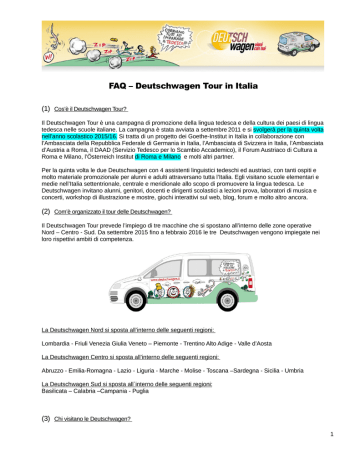 FAQ – Deutschwagen Tour in Italia (1) Cos’è il Deutschwagen Tour? Il Deutschwagen Tour è una campagna di promozione della lingua tedesca e della cultura dei paesi di lingua tedesca nelle scuole italiane. La campagna è stata avviata a settembre 2011 e si svolgerà per la quinta volta nell’anno scolastico 2015/16. Si tratta di un progetto dei Goethe-Institut in Italia in collaborazione con l’Ambasciata della Repubblica Federale di Germania in Italia, l’Ambasciata di Svizzera in Italia, l’Ambasciata d’Austria a Roma, il DAAD (Servizio Tedesco per lo Scambio Accademico), il Forum Austriaco di Cultura a Roma e Milano, l’Österreich Institut di Roma e Milano e molti altri partner. Per la quinta volta le due Deutschwagen con 4 assistenti linguistici tedeschi ed austriaci, con tanti ospiti e molto materiale promozionale per alunni e adulti attraversano tutta l’Italia. Egli visitano scuole elementari e medie nell’Italia settentrionale, centrale e meridionale allo scopo di promuovere la lingua tedesca. Le Deutschwagen invitano alunni, genitori, docenti e dirigenti scolastici a lezioni prova, laboratori di musica e concerti, workshop di illustrazione e mostre, giochi interattivi sul web, blog, forum e molto altro ancora. (2) Com’è organizzato il tour delle Deutschwagen? Il Deutschwagen Tour prevede l’impiego di tre macchine che si spostano all’interno delle zone operative Nord – Centro - Sud. Da settembre 2015 fino a febbraio 2016 le tre Deutschwagen vengono impiegate nei loro rispettivi ambiti di competenza. La Deutschwagen Nord si sposta all’interno delle seguenti regioni: Lombardia - Friuli Venezia Giulia Veneto – Piemonte - Trentino Alto Adige - Valle d’Aosta La Deutschwagen Centro si sposta all’interno delle seguenti regioni: Abruzzo - Emilia-Romagna - Lazio - Liguria - Marche - Molise - Toscana –Sardegna - Sicilia - Umbria La Deutschwagen Sud si sposta all`interno delle seguenti regioni: Basilicata – Calabria –Campania - Puglia (3) Chi visitano le Deutschwagen? 1 Il Deutschwagen Tour è rivolto in prima linea alle scuole elementari e medie. Con le lezioni prova si cerca di avvicinare in modo giocoso alla lingua tedesca gli alunni che ancora non sanno il tedesco o che ne hanno scarse conoscenze. L’iscrizione deve avvenire previa messa a conoscenza e autorizzazione del dirigente scolastico. (4) La visita della Deutschwagen è onerosa? No, la visita è gratuita. (5) Come si svolge questa visita? La Deutschwagen visita le scuole con un assistente linguistico, molte idee creative e materiali promozionali sviluppati appositamente (fumetti, volantini ecc.). La lezione prova si basa principalmente su diversi giochi linguistici, gare, esercizi ecc. Durante ogni visita potranno essere tenute al massimo due lezioni tipo con due classi diversi. Una lezione prova, a cui partecipano al massimo 30 alunni, dura circa 45 minuti. Il coinvolgimento delle classi scelte è da concordare precedentemente con l’assistente linguistico. Una prima impressione di una tale visita si può ricavare dal nostro blog dedicato al Deutschwagen Tour, che gli assistenti linguistici inseriscono quotidianamente. (6) A che ora ha luogo la visita della Deutschwagen? Normalmente, la visita ha luogo la mattina. L’ora precisa viene stabilita insieme all’assistente linguistico una volta fatta l’iscrizione. Si può concordare anche una visita di pomeriggio. Vi preghiamo di tenere conto che l’assistente linguistico si presenterà prima dell’inizio della lezione tipo, in modo da avere il tempo per i preparativi necessari. (7) Chi deve essere presente alla visita della Deutschwagen? La lezione di prova è esclusivamente per gli alunni e prevede la presenza di un insegnante di riferimento. Qualora partecipassero alla lezione alunni diversamente abili, dovranno essere presenti anche gli insegnanti di sostegno. Dopo la lezione tipo, se richiesto, l’assistente linguistico incontrerà volentieri i genitori interessati. In ogni caso, nell’ambito della visita si dovrebbe prevedere un colloquio con il dirigente scolastico. (8) Come si richiede la visita della Deutschwagen? Le scuole interessate possono richiedere la visita della Deutschwagen compilando il modulo di richiesta online. Siete pregati di indirizzare la Vostra richiesta alla Deutschwagen competente per la Vostra regione (vedi sopra) selezionando il relativo modulo. Esso deve essere compilato in tutte le sue parti dal dirigente scolastico. (9) Cosa succede dopo l’iscrizione sul sito? Il modulo di richiesta viene inoltrato direttamente all’assistente linguistico competente per la Vostra zona che riceve e raccoglie tutte le richieste per la sua Deutschwagen. Successivamente si metterà in contatto con Voi per stabilire un appuntamento e chiarire di persona tutti dettagli organizzativi. (10) A cosa servono le dichiarazioni di consenso (liberatorie) durante la visita della Deutschwagen? 2 Insieme agli alunni durante la visita della Deutschwagen l’assistente linguistico si presta a fare foto e/o riprese video che verranno utilizzate prevalentemente nel blog dedicato alla Deutschwagen. Se nel modulo d’iscrizione ritenete che sia opportuno fare queste foto e/o queste riprese, Vi impegnate a consegnare all’assistente linguistico in occasione della visita della Deutschwagen le relative liberatorie dei genitori di tutti gli alunni che partecipano alla lezione tipo. Solo se si avranno tutte le liberatorie firmate dai rispettivi genitori si potrà conservare il ricordo di questa eccezionale visita tramite i video e le foto per le pubblicazioni, il blog e il sito web del Deutschwagen Tour gestito dal Goethe-Institut. Qualora, con nostro rammarico, Vi opponiate alla realizzazione di foto e video, potete barrare la casella corrispondente nel modulo di richiesta. (11) Cosa si deve preparare per la visita della Deutschwagen e a cosa bisogna fare attenzione? - - Vi preghiamo di concordare con l’assistente linguistico dove può esser