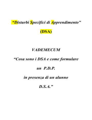 “Disturbi Specifici di Apprendimento” (DSA) VADEMECUM “Cosa sono i DSA e come formulare un P.D.P. in presenza di un alunno D.S.A.” COSA SONO I D.S.A. (=disturbi specifici di apprendimento)? Questi disturbi non si riassumono nella sola dislessia anche se questo tipo di DSA è forse il più diffuso e famoso, infatti: DISLESSIA DISTURBI SPECIFICI DI APPRENDIMENTO (DSA) DISORTOGRAFIA DISGRAFIA DISCALCULIA Difficoltà di automatizzazione della decodifica da grafema a fonema (decifrazione del testo scritto); disturbo non diagnosticabile con sicurezza prima della fine della seconda elementare; grazie alle neuroscienze negli ultimi quattro anni si è potuto stabilire che si tratta di una compromissione neurologica in presenza di un Q.I. nella/sopra la norma di origine fonologica a trasmissione ereditaria. Difficoltà a tradurre con precisione il linguaggio in codice scritto; la scrittura presenta errori tipici e frequenti strettamente ortografici (accenti, uso dell’H, elisioni, doppie) ma anche omissione, sostituzione, ripetizione di sillabe o parti di parola. La disortografia si associa alla dislessia nell’85% dei casi. Cattiva grafia al punto che il disgrafico, ricevendo un’enorme frustrazione, non è in grado di decodificare neppure ciò che lui stesso ha scritto. Si suddivide in due tipi di difficoltà: compromissione della capacità di acquisire le procedure di calcolo e incapacità di riconoscere i simboli matematici; deficit a livello dell’alfabeto numerico e quindi incapacità di scrivere/interpretare correttamente i numeri e il loro codice di composizione; disturbo non diagnosticabile con sicurezza prima della fine della terza elementare. I DSA, quindi, non sono malattie perché non è possibile una guarigione, ma disturbi ovvero caratteristiche stabili del soggetto che possono essere compensate, evolvere ma comunque permangono come tratto soggettivo; si pongono perciò tra l’handicap e l’essere normodotati); va anche precisato che nei DSA, per le loro peculiarità, si distinguono una FASE ABILITATIVA, attraverso trattamenti logopedici, nel corso della scuola primaria e una FASE COMPENSATIVA, anche attraverso strumenti tecnologici, dalla scuola secondaria di primo grado. Va subito precisato che in ambito scolastico esistono due percorsi che non vanno confusi, che hanno una legislazione, una documentazione e una modalità di essere affrontati differenti ma ugualmente obbligatori: DISABILITA’ D.S.A. Alunni certificati in base alla legge 104/92 ai quali viene attribuito di anno in anno l’insegnante di sostegno in base ad una certificazione medico-legale e una DIAGNOSI FUNZIONALE stilata da un medico dell’ULSS o di un Ente pubblico riconosciuto; per questi alunni va elaborato un PEI (piano educativo individualizzato) ad inizio anno scolastico e PDF periodici, così come stabilito dalla Legge-quadro sull’handicap n°104 del febbraio 1992. Alunni diagnosticati (oltre che dall’ULSS e da Ente pubblico riconosciuto, anche da un Ente privato e, in particolare accertato da psicologo, neuropsichiatria o foniatra e poi convalidato da ULSS) per DSA per i quali, in base alla normativa che poi verrà specificata e allegata, è obbligatorio elaborare un PDP (Nota MIUR n° 5744 del 28/5/2009) in qualsiasi momento dell’anno alla scuola venga presentata da parte della famiglia la diagnosi specialistica e che, da quel momento in poi (anche in fase di valutazione sia formativa, sia sommativi e in sede di esame) dovranno essere garantiti quegli strumenti e quei criteri specificamente individuati dal C.d.C.; la famiglia, non solo deve essere al corrente del PDP del figlio, ma deve espressamente sottoscriverlo e riceverne copia protocollata. Solo in caso di comorbilità (ad esempio se si ha in associazione un DDAI, un disturbo del comportamento, ecc.) un DSA può essere certificato in base alla legge 104/92. CHE COS’E’ UN P.D.P.? PDP è uno strumento DIDATTICO perché INDIVIDUA GLI STRUMENTI: permette di trovare gli strumenti e le strategie ad hoc per il singolo, specifico alunno a livello di: STRUMENTI DISPENSATIVI STRUMENTI COMPENSATIVI CRITERI DI VERIFICA CRITERI DI VALUTAZIONE per by-passare la difficoltà specifica di lettura, scrittura, calcolo e, quindi EDUCATIVO perché FA EMERGERE IL “VERO” ALUNNO: permette di andare oltre la difficoltà specifica, per mirare all’intelligenza, attraverso l’adozione di strumenti adatti e, quindi, evitare tutta una serie di difficoltà collaterali (sequenzialità, memorizzazione, disnomia, ecc.) che, se non compensate, aggravano la disabilità specifica. PERCHE’ SI DEVE REDIGERE UN PDP? Questo documento di progettazione condiviso serve a: creare una personalizzazione “su misura” del percorso formativo dell’alunno; monitorarne l’andamento e, al bisogno, di adattare l’ipotesi di lavoro iniziale; facilita il reperimento delle modalità didattiche attivate (IL COME); favorisce il lavoro collegiale perché va redatto dall’intero C.d.C., in presenza del Dirigente scolastico. Quindi deve basarsi sulla condivisione nel programmare, nel processo di insegnamento/apprendimento, nel valutare…); facilita il passaggio di notizie al cambio di docente e –se esplicitamente autorizzato dalla famiglia- al cambio di ciclo scolastico (non c’è, infatti, a differenza dell’handicap, passaggio obbligato della documentazione tra livelli scolastici). Va inoltre sottolineato che, comunque, è un documento previsto e richiesto per legge e che, se sono presenti le condizioni (diagnosi di DSA protocollata a scuola) è obbligatorio redigerlo e condividerlo con la famiglia che, non vedendo tutelata la situazione specifica del proprio figlio, potrebbe/dovrebbe ricorrere al TAR. CHI REDIGE IL PDP? L’intero C.d.C. coinvolto (o team docenti per la Scuola Primaria/Infanzia); i genitori che danno informazioni al C.d.C. su come lavora a casa perché sia fissato un metodo condiviso con la scuola e indicazioni per l’individuazione degli strum