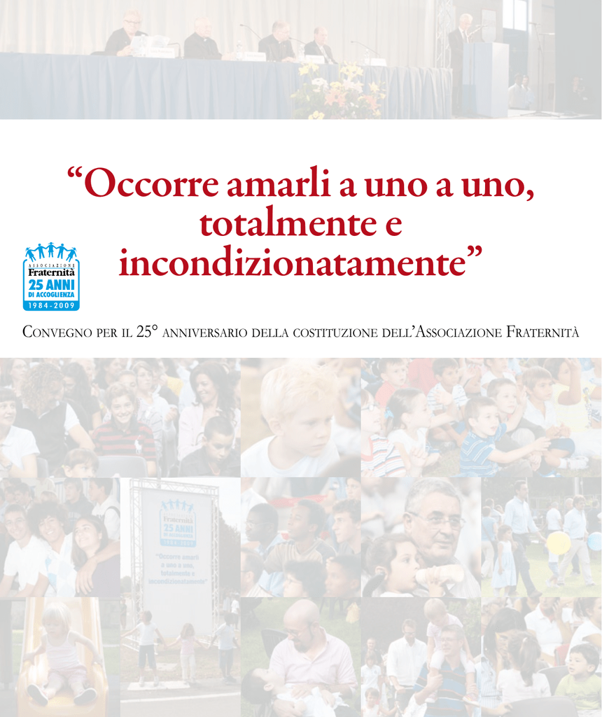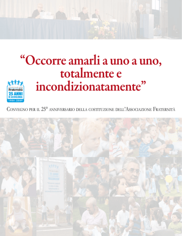“Occorre amarli a uno a uno, totalmente e incondizionatamente” Convegno per il 25° anniversario della costituzione dell’Associazione Fraternità [Il messaggio di] Julián Carrón 25° anniversario Associazione Fraternità Crema, 12 settembre 2009 Carissimi, la festa per i vostri 25 anni vi trovi più grati e più certi della ragione per cui ogni giorno portate il peso di un amore gratuito verso coloro che vi sono affidati: la sorpresa di essere stati abbracciati da Cristo, l’unico che ha avuto pietà del nostro niente fino a dare se stesso perché noi fossimo felici. Questo vuol dire amare incondizionatamente. Un forte abbraccio Julián Carrón Milano, 10 settembre 2009 Foto: Sonzogni Paolo [Introduzione] Mons. Mauro Inzoli Presidente Associazione Fraternità Indice Introduzione pag. 5 . ......................................................... Mons. Mauro Inzoli Presidente Associazione Fraternità Saluto autorità Bruno Bruttomesso .. . . . . . . . . . . . . . . . . . . . . . . . . . . . . . . . . . . . . . . . . . . . . . . . . . . . . . . . . . Presidente Provincia di Cremona Gianni Rossoni .. . . . . . . . . . . . . . . . . . . . . . . . . . . . . . . . . . . . . . . . . . . . . . . . . . . . . . . . . . . . . . . . . . . . pag. 10 Sindaco di Crema Massimiliano Salini . ....................................................... pag. 8 pag. 9 Vice-presidente Regione Lombardia Davide Prosperi . . . . . . . . . . . . . . . . . . . . . . . . . . . . . . . . . . . . . . . . . . . . . . . . . . . . . . . . . . . . . . . . . . Responsabile Regionale di Comunione e Liberazione Interventi Livia Pomodoro .. . . . . . . . . . . . . . . . . . . . . . . . . . . . . . . . . . . . . . . . . . . . . . . . . . . . . . . . . . . . . . . . . . . Presidente Tribunale di Milano Maurizio Sacconi . ............................................................. Ministro del Lavoro, della Salute e delle Politiche Sociali S. Ecc. Mons. Vescovo di Crema Testimonianze Oscar Cantoni ..................................... Marco Ademaj Pietro Arnone Linda Garlati ..................................................................... . ...................................................................... .. . . . . . . . . . . . . . . . . . . . . . . . . . . . . . . . . . . . . . . . . . . . . . . . . . . . . . . . . . . . . . . . . . . . . . . . . François Bambara .. . . . . . . . . . . . . . . . . . . . . . . . . . . . . . . . . . . . . . . . . . . . . . . . . . . . . . . . . . . . Ombretta Tirelli in Merlini Intervento finale S. Em. R. Cardinale Ennio Antonelli Conclusione Galleria fotografica pag. 16 pag. 20 pag. 24 Carmen D’Alessio.. . . . . . . . . . . . . . . . . . . . . . . . . . . . . . . . . . . . . . . . . . . . . . . . . . . . . . . . . . . . . . . pag. 28 pag. 13 .......................................... pag. 35 pag. 39 pag. 43 pag. 44 .. . . . . . . . . . . . . . . . . . . . . pag. 50 . ......................................................... pag. 54 Presidente Pontificio Consiglio per la Famiglia Mons. Mauro Inzoli pag. 33 Presidente Associazione Fraternità . ....................................................................................................... pag. 55 S ono molto lieto di poter dare inizio a questo gesto, che è innanzitutto un gesto di gratitudine per quello che è successo in questi anni. E vi ringrazio ad uno ad uno perché se voi siete qui, a cominciare da Sua Eminenza il Cardinale Antonelli, il nostro vescovo Oscar, alla Presidente del Tribunale di Milano Livia Pomodoro, a tutte le autorità qui presenti, a tutti gli amici, è un segno che il cuore non resta indifferente a ciò che il mistero opera nella storia. E questo è il punto: Dio si è commosso per il nostro niente. Non solo. Dio si è commosso per il nostro tradimento, per la nostra povertà rozza dimentica e traditrice, per la nostra meschinità. Dio si è commosso per la nostra meschinità, che è più ancora che essersi commosso per il nostro niente; ha avuto pietà del tuo niente, ha avuto pietà del tuo odio a me. Mi sono commosso perché tu mi odi, come un padre e una madre che piangono di commozione per l’odio del figlio. Non piangono perche sono colpiti; piangono di commozione, vale a dire di un pianto totalmente determinato dal desiderio del bene del figlio, del destino del figlio, che il figlio cambi per il suo destino, che si salvi. E’ una compassione, una pietà, una passione. E’ per questo che ci scriveva sempre don Giussani qualche anno fa: “siamo ammirati e commossi dal vostro impeto che ha saputo immaginare operazioni di carità con il coraggio giocato dalla fedeltà ai principi della vostra fede. E vi esprimiamo il nostro desiderio di seguire quella fedeltà che anche nelle peggiori situazioni ha saputo costruire quello che nessuno immaginava”. E’ una commossa gratitudine che ci fa essere qui più coscienti del niente che siamo, ma più coscienti di essere stati trascinati, affascinati e trascinati dentro a quel mistero di carità che ci ha raggiunto ad uno ad uno e ci ha abbracciati totalmente e incondizionatamente. Quello che vogliamo oggi è lasciarci di nuovo commuovere dalla carità del mistero, testimoniata da tutti coloro che interverranno quest’oggi, ma non solo, perché dovremmo intervenire tutti; ma dal vivere ora, dal lasciarsi colpire ora, dal lasciarsi investire ora da questo avvenimento di gratuità totale, affinché sia possibile per ciascuno di noi rintracciare una luce che ci permetta di uscire tutti dalla confusione nella quale siamo e di essere più certi che Colui che ci è venuto incontro compie anche nelle circostanze più difficili il nostro destino. Ora chiedo al nostro sindaco di portarci il suo saluto e colgo l’occasione per ringraziare l’amministrazione comunale di averci concesso gli spazi che stiamo utilizzando anche adesso. Grazie signor sindaco. “Occorre amarli a uno a uno, totalmente e incondizionatamente” 5 [Saluto autorità] Bruno Brutto