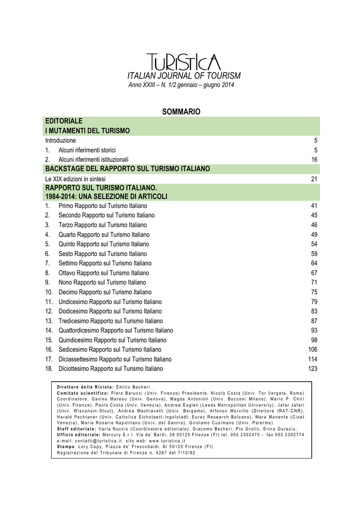 ITALIAN JOURNAL OF TOURISM Anno XXIII – N. 1/2 gennaio – giugno 2014 SOMMARIO EDITORIALE I MUTAMENTI DEL TURISMO Introduzione 1. Alcuni riferimenti storici 2. Alcuni riferimenti istituzionali 5 5 16 BACKSTAGE DEL RAPPORTO SUL TURISMO ITALIANO Le XIX edizioni in sintesi 21 RAPPORTO SUL TURISMO ITALIANO. 1984-2014: UNA SELEZIONE DI ARTICOLI 1. 2. 3. 4. 5. 6. 7. 8. 9. 10. 11. 12. 13. 14. 15. 16. 17. 18. Primo Rapporto sul Turismo Italiano Secondo Rapporto sul Turismo Italiano Terzo Rapporto sul Turismo Italiano Quarto Rapporto sul Turismo Italiano Quinto Rapporto sul Turismo Italiano Sesto Rapporto sul Turismo Italiano Settimo Rapporto sul Turismo Italiano Ottavo Rapporto sul Turismo Italiano Nono Rapporto sul Turismo Italiano Decimo Rapporto sul Turismo Italiano Undicesimo Rapporto sul Turismo Italiano Dodicesimo Rapporto sul Turismo Italiano Tredicesimo Rapporto sul Turismo Italiano Quattordicesimo Rapporto sul Turismo Italiano Quindicesimo Rapporto sul Turismo Italiano Sedicesimo Rapporto sul Turismo Italiano Diciassettesimo Rapporto sul Turismo Italiano Diciottesimo Rapporto sul Turismo Italiano Direttore della Rivista: Emilio Becheri Comitato scientifico: Piero Barucci (Univ. Firenze) Presidente, Nicolò Costa (Univ. Tor Vergata, Rome) Coordinatore, Gavino Maresu (Univ. Genova), Magda Antonioli (Univ. Bocconi Milano), Mario P. Chiti (Univ. Firenze), Paolo Costa (Univ. Venezia), Andrew Eaglen (Leeds Metropolitan University) , Jafar Jafari (Univ. Wisconsin-Stout), Andrea Machiavelli (Univ. Bergamo), Alfonso Morvillo (Direttore IRAT-CNR), Harald Pechlaner (Univ. Cattolica Eichstaett -Ingolstadt; Eurac Research Bolzano), Mara Manente (Ciset Venezia), Maria Rosaria Napolitano (Uni v. del Sannio), Girolamo Cusimano (Univ. Palermo) Staff editoriale: Ilaria Nuccio (Coordinatore editoriale), Giacomo Becheri, Pio Grollo, Erina Guraziu. Ufficio editoriale: Mercury S.r.l. Via de’ Bardi, 39 50125 Firenze (FI) tel. 055 2302470 - fax 055 2302774 e-mail: [email protected] sito web: www.turistica.it Stampa: Lory Copy, Piazza de' Frescobaldi, 8r 50125 Firenze (FI) Registrazione del Tribunale di Firenze n. 4267 del 7/10/92 41 45 46 49 54 59 64 67 71 75 79 83 87 93 98 106 114 123 Da oltre venti anni, Turistica pubblica articoli originali riguardanti l’ambito turistico. I contributi possono provenire da ricerche, analisi, monitoraggi, tesi di laurea e altro nel campo dell’economia, del management e del marketing del settore turistico e dei beni culturali. I Colleghi sono invitati a inviare i loro contributi, riguardanti i sopracitati ambiti, correlati di dati di fonti autorevoli di qualsiasi parte del mondo. Saranno particolarmente graditi studi e ricerche scientifiche, progetti pilota riguardanti lo sviluppo di destinazioni turistiche e/o disseminazioni di progetti europei in ambito turistico. Formato degli articoli La redazione accetta brani in formato .doc e non richiede nessuna particolare impaginazione o l'utilizzo esclusivo di un tipo di font. È importante tuttavia, attenersi alle seguenti regole: Lingua: i contributi possono essere scritti in lingua italiana o in lingua inglese; Lunghezza: fra le 20 e le 60 cartelle di 1.500 battute; Abstract: in inglese, oppure in italiano se l'articolo proposto è in inglese, che non superi le 750 battute (caratteri + spazi). L'abstract deve presentare in modo conciso i risultati della ricerca; Autore: da indicare nella prima pagina, sotto il titolo; Enti: l'eventuale indicazione dell'Ente di appartenenza deve essere riportata a piè di pagina; Paragrafi: l'articolo dovrà essere segmentato in paragrafi titolati e progressivamente numerati. È preferibile non suddividere i paragrafi in più di 2-3 livelli; Grafici: qualora nel testo siano presenti tabelle e grafici, devono essere inviati anche gli originali nel formato .xls. I titoli di tabelle, grafici e figure devono essere esterni; Riferimenti bibliografici: da elencare alla fine del testo in ordine alfabetico secondo il cognome degli autori e nell'ordine cronologico di pubblicazione delle opere. Le recensioni, della lunghezza di una pagina e di max. 1.500 battute, devono essere inviate in formato .doc. Saranno accettate sia in lingua italiana sia inglese purché siano indicati in cima autore, titolo, editore, luogo e anno di pubblicazione e autore della recensione a margine. È altresì gradito l’invio di una scansione e/o versione .pdf della copertina del volume recensito. Dal momento in cui gli articoli vengono accettati per la pubblicazione, gli autori si dichiarano automaticamente d'accordo nel trasferire tutti i diritti di copyright a Mercury S.r.l. Le proposte devono essere inviate in formato elettronico all’indirizzo [email protected]. I contributi saranno vagliati dal Comitato Scientifico. Eventuali richieste di correzione richieste dovranno essere inviate entro tre giorni. Direttore responsabile: Emilio Becheri Registrazione del Tribunale di Firenze n. 4267 del 7/10/92 Abbonamento cartaceo per l’anno 2013 (4 numeri): € 70,00 (vecchi abbonati) € 110,00 (nuovi abbonati) Prezzo di un singolo numero: 32,00 € Il prezzo include le spese di spedizione tramite piego di libri Poste Italiane . I costi di spedizione tramite pacco celere o corriere e/o all’estero saranno addebitati. Metodo di pagamento: c/c postale n. 11101508 intestato a: Mercury s.r.l. – Via de’ Bardi, 39 - 50125 Firenze (IT) o IBAN IT76E0103002827000000537821 MPS (Monte dei Paschi di Siena) Agenzia 30 Via del Corso, 6 50122 Firenze, intestato a Mercury S.r.l. Ordini on-line al sito http://www.turistica.it/section/abbonamenti oppure via e-mail all’ indirizzo [email protected] 1 Gen - Giu 2014 EDITORIALE BACKSTAGE Il Rapporto sul Turismo Italiano è un romanzo, iniziato più di trent’anni fa. È anche un racconto della mia vita perché fin dalla prima edizione ne sono stato il coordinatore, nelle prime tre edizioni insieme al Prof. Piero Barucci, con il quale mi laureai nel 1971; per le ultime tre edizioni (XVII,