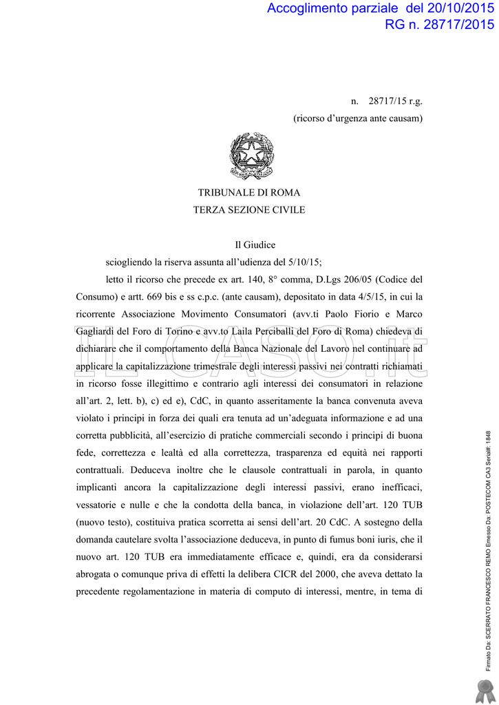 Accoglimento parziale del 20/10/2015 RG n. 28717/2015 n. 28717/15 r.g. (ricorso d’urgenza ante causam) TRIBUNALE DI ROMA TERZA SEZIONE CIVILE Il Giudice sciogliendo la riserva assunta all’udienza del 5/10/15; letto il ricorso che precede ex art. 140, 8° comma, D.Lgs 206/05 (Codice del Consumo) e artt. 669 bis e ss c.p.c. (ante causam), depositato in data 4/5/15, in cui la IL CASO.it ricorrente Associazione Movimento Consumatori (avv.ti Paolo Fiorio e Marco Gagliardi del Foro di Torino e avv.to Laila Perciballi del Foro di Roma) chiedeva di dichiarare che il comportamento della Banca Nazionale del Lavoro nel continuare ad applicare la capitalizzazione trimestrale degli interessi passivi nei contratti richiamati in ricorso fosse illegittimo e contrario agli interessi dei consumatori in relazione all’art. 2, lett. b), c) ed e), CdC, in quanto asseritamente la banca convenuta aveva corretta pubblicità, all’esercizio di pratiche commerciali secondo i principi di buona fede, correttezza e lealtà ed alla correttezza, trasparenza ed equità nei rapporti contrattuali. Deduceva inoltre che le clausole contrattuali in parola, in quanto implicanti ancora la capitalizzazione degli interessi passivi, erano inefficaci, vessatorie e nulle e che la condotta della banca, in violazione dell’art. 120 TUB (nuovo testo), costituiva pratica scorretta ai sensi dell’art. 20 CdC. A sostegno della domanda cautelare svolta l’associazione deduceva, in punto di fumus boni iuris, che il nuovo art. 120 TUB era immediatamente efficace e, quindi, era da considerarsi abrogata o comunque priva di effetti la delibera CICR del 2000, che aveva dettato la precedente regolamentazione in materia di computo di interessi, mentre, in tema di Firmato Da: SCERRATO FRANCESCO REMO Emesso Da: POSTECOM CA3 Serial#: 1848 violato i principi in forza dei quali era tenuta ad un’adeguata informazione e ad una Accoglimento parziale del 20/10/2015 RG n. 28717/2015 periculum in mora, deduceva che il numero dei consumatori, titolari di conto corrente con la convenuta, sia attuali che potenziali, ed interessati dalla suddetta condotta della banca, era estremamente elevato e sussisteva pertanto il requisito della diffusività del comportamento illecito, che la banca continuava a porre in essere, e della necessità della sollecita inibizione dello stesso. Tanto premesso, nel richiamare l’applicazione dell’art. 669 octies, 6° comma, c.p.c. in ordine alla non necessaria introduzione del giudizio di merito, concludeva nei seguenti termini: “ … chiede che, ai sensi dell’art. 669 sexies, 2° comma, c.p.c. il Tribunale, inaudita altera parte, con decreto disponga provvisoriamente per tutti i contratti di conto corrente meglio indicati in premessa (Conto corrente BNL All Inclusive Cash; Conto BNL dedicato ai minori; Conto BNL Forfait; Conto corrente Pensione Protetta; Conto corrente Pensione Facile; Conto corrente Ordinario (Consumatori); Conto Corrente Servizio Bancario di base Open IL CASO.it BNL; BNL In Novo II Conto Start; BNL In Novo II Conto Pratico Web; Conto Life Banker; BNL In Novo II Conto Pratico; BNL Conto Priority; BNL Conto Priority Family; BNL Conto Pratico; Hello! Money; BNL In Novo II Conto Pratico Università; BNL In Novo Conto Pratico Under 30; BNL Conto Priority Sviluppo Raccolta; BNL IN Novo II Conto Pratico Amico) l’inibitoria della capitalizzazione trimestrale degli interessi relativamente al secondo trimestre del 2015 ed inibisca contratto) e di qualsivoglia altra analoga clausola adottata con riferimento agli altri Contratti di Conto Corrente indicati in premessa o in subordine … sentite le parti ex art. 669 sexies, 1° comma, c.p.c., voglia accogliere le seguenti conclusioni: dichiarare che il comportamento posto in essere da BNL Spa, descritto nel presente atto, ed in particolare la capitalizzazione trimestrale degli interessi passivi maturati nell’ambito dei Contratti di Conto Corrente o comunque l’applicazione di interessi anatocistici, è comportamento illegittimo e contrario agli interessi collettivi dei consumatori “ad una adeguata informazione e ad una corretta pubblicità” (art. 2, secondo comma, lett. b, CdC), “all’esercizio di pratiche commerciali secondo principi di buona fede, correttezza e lealtà” (art. 2, secondo comma, lett. c, CdC), “alle correttezza, trasparenza ed equità nei rapporti contrattuali” (art. 2, secondo Firmato Da: SCERRATO FRANCESCO REMO Emesso Da: POSTECOM CA3 Serial#: 1848 provvisoriamente l’uso della clausola n° 10 (presente nelle condizioni generali di Accoglimento parziale del 20/10/2015 RG n. 28717/2015 comma, lett. e, CdC) e comunque costituisce pratica commerciale scorretta ai sensi degli artt. 20 e ss CdC; inibire ai sensi dell’art. 140, lett. a) CdC ogni forma di capitalizzazione degli interessi passivi maturati nell’ambito dei predetti Contratti di Conto Corrente o comunque l’applicazione di interessi anatocistici; inibire la predisposizione, la diffusione e l’utilizzo e l’applicazione della clausola n° 10 (presente nelle condizioni generali di contratto) e di ogni analoga clausola adottata negli altri Contratti di Conto Corrente indicati in premessa; inibire ogni riferimento alla capitalizzazione degli interessi maturati contenuti nei fogli informativi dei Contratti di Conto Corrente; ordinare alla resistente di adottare ex art. 140 lett. b) D.Lgs 206/05 tutte le misure che il Giudicante riterrà idonee per eliminare gli effetti lesivi degli illeciti accertati che la ricorrente indica nei seguenti provvedimenti: ordinare alla resistente la pubblicazione sulla home page del proprio sito internet di un avviso con un estratto dell’emanando provvedimento diretto ad informare tutti i IL CASO.it consumatori che, con decorrenza 1° gennaio 2014, per tutti i Contratti di Conto Corrente è vietata qualsiasi forma di capitalizzazione degli interessi passivi e che ogni correntista ha diritto a ripetere gli interessi anatocistici co