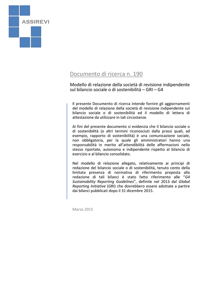ASSIREVI BO Documento di ricerca n. 190 Modello di relazione della società di revisione indipendente sul bilancio sociale o di sostenibilità – GRI – G4 Il presente Documento di ricerca intende fornire gli aggiornamenti del modello di relazione della società di revisione indipendente sul bilancio sociale o di sostenibilità ed il modello di lettera di attestazione da utilizzare in tali circostanze. Ai fini del presente documento si evidenzia che il bilancio sociale o di sostenibilità (o altri termini riconosciuti dalla prassi quali, ad esempio, rapporto di sostenibilità) è una comunicazione sociale, non obbligatoria, per la quale gli amministratori hanno una responsabilità in merito all’attendibilità delle affermazioni nello stesso riportate, autonoma e indipendente rispetto al bilancio di esercizio e al bilancio consolidato. Nel modello di relazione allegato, relativamente ai principi di redazione del bilancio sociale o di sostenibilità, tenuto conto della limitata presenza di normativa di riferimento preposta alla redazione di tali bilanci è stato fatto riferimento alle “G4 Sustainability Reporting Guidelines”, definite nel 2013 dal Global Reporting Initiative (GRI) che dovrebbero essere adottate a partire dai bilanci pubblicati dopo il 31 dicembre 2015. Marzo 2015 Documento di ricerca n. 190 MODELLO DI RELAZIONE DELLA SOCIETÀ DI REVISIONE INDIPENDENTE SUL BILANCIO SOCIALE O DI SOSTENIBILITÀ 1- GRI – G4 SCOPO DEL DOCUMENTO Il presente Documento di ricerca intende fornire gli aggiornamenti del modello di relazione della società di revisione indipendente sul bilancio sociale o di sostenibilità ed il modello di lettera di attestazione da utilizzare in tali circostanze. Ai fini del presente documento si evidenzia che il bilancio sociale o di sostenibilità (o altri termini riconosciuti dalla prassi quali, ad esempio, rapporto di sostenibilità) è una comunicazione sociale, non obbligatoria, per la quale gli amministratori hanno una responsabilità in merito all’attendibilità delle affermazioni nello stesso riportate, autonoma e indipendente rispetto al bilancio di esercizio e al bilancio consolidato. Nel modello di relazione allegato, relativamente ai principi di redazione del bilancio sociale o di sostenibilità, tenuto conto della limitata presenza di normativa di riferimento preposta alla redazione di tali bilanci è stato fatto riferimento alle “G4 Sustainability Reporting Guidelines”, definite nel 2013 dal Global Reporting Initiative (GRI) che dovrebbero essere adottate a partire dai bilanci pubblicati dopo il 31 dicembre 20152. Tali principi, inclusi i supplementi per i differenti settori di attività, risultano essere, sia per qualità di accreditamento con Organismi pubblici e privati, sia per numerosità di applicazione, i più utilizzati in Italia e a livello internazionale. Si ricorda che il modello di relazione della Società di revisione per i bilanci di sostenibilità che fanno riferimento al “GRI-G3 Sustainability Reporting Guidelines” è tuttora definito dal Documento di ricerca n.153. Relativamente ai principi professionali di riferimento, coerentemente con quanto avviene a livello internazionale, per l’attività di verifica dei bilanci sociali o di sostenibilità si fa riferimento al principio “International Standards on Assurance Engagements 3000: Assurance Engagements other than Audits or Reviews of Historical Financial Information”, emanato dall’International Auditing and Assurance Standard Board (IAASB) dell’International Federation of Accountants (IFAC). Nell’ambito delle due diverse tipologie di conclusioni indicate dall’ISAE 3000 per la redazione degli assurance report (in forma positiva come conseguenza di un reasonable assurance engagement ed in forma negativa come conseguenza di un limited assurance engagement) per il 1 2 Ai fini del presente documento “bilancio sociale” e “bilancio di sostenibilità” sono utilizzati come sinonimi. L’adozione delle line guida GRI-G4 sarà invece obbligatoria già da quest’esercizio per le aziende che predispongono il Bilancio di Sostenibilità per la prima volta secondo le linee guida GRI. Documento di ricerca n. 190 Marzo 2015 modello di relazione allegato si è fatto riferimento ad una tipologia di incarico di limited assurance. Infatti, considerando che i bilanci sociali o di sostenibilità sono caratterizzati dalla limitata e recente presenza di disposizioni normative che ne disciplinano la redazione, dalla presenza di un’elevata quantità di informazioni di carattere qualitativo e dalla circostanza di un organico sistema informativo e di controllo interno non sempre presenti, si ritiene che l’attività di revisione in molti casi non potrà essere condotta, salvo con applicazioni limitate ad alcuni indicatori specifici, con il necessario livello di estensione richiesto per poter svolgere un’attività finalizzata all’espressione di una reasonable assurance e di conclusioni in forma positiva. MARZO 2015 "I contenuti del presente documento, aggiornati alla data di elaborazione del documento stesso, riguardano tematiche di carattere generale, senza costituire assistenza e consulenza professionale per singole e concrete fattispecie. Tutti i diritti riservati." 2 Documento di ricerca n. 190 Marzo 2015 Allegato 1 RELAZIONE DELLA SOCIETÀ DI REVISIONE INDIPENDENTE SUL BILANCIO DI SOSTENIBILITÀ Al Consiglio di Amministrazione/Azionisti della ABC S.p.A. Abbiamo svolto un esame limitato (“limited assurance engagement”) del bilancio di sostenibilità della ABC S.p.A. (di seguito la “Società”) [del Gruppo ABC (di seguito il “Gruppo”)] per l’esercizio chiuso al [gg mese anno]. Responsabilità degli Amministratori per il bilancio di sostenibilità Gli Amministratori sono responsabili per la redazione del bilancio di sostenibilità in conformità alle linee guida “G4 Sustainability Reporting Guidelines” definite nel 2013 dal GRI - Global Reporting Ini