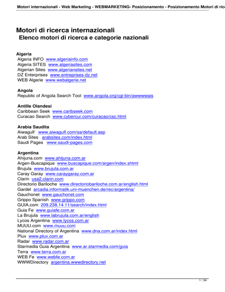Motori internazionali - Web Marketing - WEBMARKETING- Posizionamento - Posizionamento Motori di rice Motori di ricerca internazionali Elenco motori di ricerca e categorie nazionali Algeria Algeria INFO www.algeriainfo.com Algeria SITES www.algeriasites.com Algerian Sites www.algeriansites.net DZ Enterprises www.entreprises-dz.net WEB Algerie www.webalgerie.net Angola Republic of Angola Search Tool www.angola.org/cgi-bin/awwwwais Antille Olandesi Caribbean Seek www.caribseek.com Curacao Search www.cybercur.com/curacao/csc.html Arabia Saudita Aiwagulf www.aiwagulf.com/sa/default.asp Arab Sites arabsites.com/index.html Saudi Pages www.saudi-pages.com Argentina Ahijuna.com www.ahijuna.com.ar Argen-Buscapique www.buscapique.com/argen/index.shtml Brujula www.brujula.com.ar Caray Garay www.caraygaray.com.ar Clarin usa2.clarin.com Directorio Bariloche www.directoriobariloche.com.ar/english.html Gardel arcadia.informatik.uni-muenchen.de/rec/argentina/ Gauchonet www.gauchonet.com Grippo Spanish www.grippo.com GUIA.com 209.238.14.11/search/index.html Guia Fe www.guiafe.com.ar La Brujula www.labrujula.com.ar/english Lycos Argentina www.lycos.com.ar MUUU.com www.muuu.com National Directory of Argentina www.dna.com.ar/index.html Plux www.plux.com.ar Radar www.radar.com.ar Starmedia Guia Argentina www.ar.starmedia.com/guia Terra www.terra.com.ar WEB Fe www.webfe.com.ar WWWDirectory argentina.wwwdirectory.net 1 / 34 Motori internazionali - Web Marketing - WEBMARKETING- Posizionamento - Posizionamento Motori di rice Yahoo Argentina ar.yahoo.com Armenia Armenians Links www.armenians.com/links/index.html HEYGuide www.hyeguide.com Australia AAAMatilda www.aaamatilda.com AAA Search www.aaa.com.au/search/bestmillion AltaVista www.altavista.yellowpages.com.au Anzak Search www.aaamatilda.com/search/anzak Anzwers www.anzwers.com.au AusIndex ausindex.ausweb.net.au Aussie www.aussie.com.au Australian Libraries Search www.nla.gov.au/libraries babyOIL www.dstc.edu.au/projects/babyOIL/babyOIL.htm CitySearch www.citysearch.com.au Cowleys www.cowleys.com.au Excite Australia www.excite.com.au Globe Search www.aaa.com.au/search/globe GOEureka www.goeureka.com.au INFOBahn www.infobahn.com.au/Search/pnn.phtml Kapow www.bam.com.au/kapow LookAbout www.lookabout.com.au Looksmart www.looksmart.com.au Matilda www.aaa.com.au Matilda's Boomerang matilda.aaa.com.au/boomerang MoneyWeb www.moneyweb.com.au Money Web Search www.moneywebsearch.com New S. Wales Search www.aaa.com.au/search/new OZGuide www.ozguide.com OZSearch www.ozsearch.com.au SASeek www.aaa.com.au/search/saseek SunSearch www.aaa.com.au/search/sun Tasmania Online www.tas.gov.au/search/index.htm Telstra White Pages www.whitepages.com.au Telstra Yellow Pages www.yellowpages.com.au The Black Stump www.blackstump.com.au VicFinder www.aaa.com.au/search/vicfind Wazoo www.aaa.com.au/search/wazoo Web Index World www.webindex.net/world/australia WEBHunter www.aaamatilda.com/online/newcastle/webhunter WebSearch www.websearch.com.au WebWombat www.webwombat.com.au Yahoo Australia au.yahoo.com 2 / 34 Motori internazionali - Web Marketing - WEBMARKETING- Posizionamento - Posizionamento Motori di rice Austria Allesklar www.allesklar.at AID www.aid.co.at A-Site www.a-site.at Austrian WebWizard www.webwizard.at . webwizard.at Austria Intersearch austria.intersearch.net Austria-WWW www.austria-www.at Austro Naut www.austronaut.ims.at Austro Search www.austrosearch.com Cyber World www.phone-soft.at/cyber-world/index2.htm Henkel www.henkel.at/sites/index.html Info Point www.infopoint.at Loona Intersearch loona.intersearch.at Mair www.mair.net MSN Web Search search.msn.at Netwing Webindex infobase.netwing.at/webindex Sharelook Austria www.sharelook.at Sharelook Salzburg salzburg.sharelook.at Sharelook Wien wien.sharelook.at Webindex World www.webindex.net/world/austria Bangladesh Asiaco Bangladesh search.asiaco.com/Bangladesh BanglaSearch www.banglasearch.com Hyper mart BDSearch bdsearch.hypermart.net Bahrein AiwaGulf www.aiwagulf.com/bh/default.asp ArabSeek www.arabseek.net Al Bahrain www.albahrain.net Middle East Pages Bahrain bahrain.middle-east-pages.com Belgio Advalvas www.advalvas.be Azimuth www.azimuth.be Belcast www.belcast.be BelSeek belseek.com English www.webwatch.be/FR/default.dlp . www.webwatch.be/NL/default.dlp Erobru www.eurobru.com Essentiel www.ping.be/essentiel Euregio Search www.euregio.net/nederlands/zoeken/index.html Flemish www.euregio.net/deutsch/suchen/index.html . www.euregio.net/francais/chercher/ind ex.html . www.euregio.net/english/se arch/index.html Guide Francité guide.francite.net/guide_belgique.html Hotrade www.hotrate.com 3 / 34 Motori internazionali - Web Marketing - WEBMARKETING- Posizionamento - Posizionamento Motori di rice Ilse www.ilse.be Le Trouv'tout www2.ccim.be Liensutiles www.liensutiles.org Lycos Belgium www.be.lycos.de/nl/home-nl.html . www.be.lycos.de/ form . www.be.lycos.d e/fr/home-fr.html . www-be.lycos.com Rendez Vous www.rendez-vous.be Roadhouse www.roadhouse.be/rh/welcome.html Sharelook Belgium www.sharelook.be Sharelook Bruxelles bruxelles.sharelook.be Sharelook Liege liege.sharelook.be Voila Belgium www.be.voila.com Webbel www.webbel.be/index.asp?lang=NL . www.webbel.be/index.asp?lang=FR . www.w ebbel.be/index.asp?lang=EN Web-Belge www.web-belge.net Web Guide Belgium www.webguide.be Webwatch www.webwatch.be/default.dlp What2Do www.what2do.to Belize Ambergris Cave Search ambergriscaye.com/cgi-localbin/searchit.cgi Belize Net www.belize.net Bielorussia Open.by open.by AC Country www.ac.by/country/index.html Uncle Sam unclesam.hypermart.net Salnikov Tree Index www.gis.minsk.by/salnikov/tree/index.htm Unibel Search search.unibel.by Zubr.com http://www.zubr.com/ Bolivia Costa Rica Pages www.costaricapages.com/tourism-home.htm Bolivian Index www.bolivian.com Buscapique Find www.buscapique.com/busca/index.shtml Starmedia Guia Bolivia www.bo.starmedia.com/guia WWWdirectory bolivia.wwwdirectory.net Bosnia e Erzegovina Bosnia On Line www.bosni
