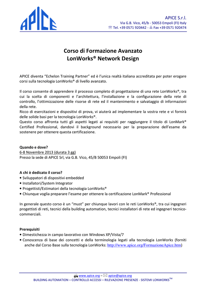APICE S.r.l. Via G.B. Vico, 45/b - 50053 Empoli (FI) Italy ℡ Tel. +39 0571 920442 - Fax +39 0571 920474 Corso di Formazione Avanzato LonWorks® Network Design APICE diventa “Echelon Training Partner” ed è l’unica realtà italiana accreditata per poter erogare corsi sulla tecnologia LonWorks® di livello avanzato. Il corso consente di apprendere il processo completo di progettazione di una rete LonWorks®, tra cui la scelta di componenti e l’architettura, l’installazione e la configurazione della rete di controllo, l’ottimizzazione delle risorse di rete ed il mantenimento e salvataggio di informazioni della rete. Ricco di esercitazioni e dispositivi di prova, vi aiuterà ad implementare la vostra rete e vi fornirà delle solide basi per la tecnologia LonWorks®. Questo corso affronta tutti gli aspetti legati ai requisiti per raggiungere il titolo di LonMark® Certified Professional, dandovi il background necessario per la preparazione dell’esame da sostenere per ottenere questa certificazione. Quando e dove? 6-8 Novembre 2013 (durata 3 gg) Presso la sede di APICE Srl, via G.B. Vico, 45/B 50053 Empoli (FI) A chi è dedicato il corso? • Sviluppatori di dispositivi embedded • Installatori/System Integrator • Progettisti/Estimatori della tecnologia LonWorks® • Chiunque voglia preparare l’esame per ottenere la certificazione LonMark® Professional In generale questo corso è un “must” per chiunque lavori con le reti LonWorks®, tra cui ingegneri progettisti di reti, tecnici della building automation, tecnici installatori di rete ed ingegneri tecnicocommerciali. Prerequisiti • Dimestichezza in campo lavorativo con Windows XP/Vista/7 • Conoscenza di base dei concetti e della terminologia legati alla tecnologia LonWorks (forniti anche dal Corso Base sulla tecnologia LonWorks: http://www.apice.org/FormazioneApice.htm) www.apice.org – [email protected] TM BUILDING AUTOMATION – CONTROLLO ACCESSI – RILEVAZIONE PRESENZE - SISTEMI LONWORKS APICE S.r.l. Via G.B. Vico, 45/b - 50053 Empoli (FI) Italy ℡ Tel. +39 0571 920442 - Fax +39 0571 920474 PROGRAMMA DEL CORSO 1° GIORNO Introduzione e presentazione del corso “LonWorks® Network Design” Terminologia nella tecnologia LonWorks Overview della tecnologia LonWorks - Vantaggi della tecnologia LonWorks - LonMark International - LonTalk Protocol o LonTalk layers o LonTalk standards o Network variables o Configuration properties o Functional blocks o Standard functional profiles - LonWorks Network Services o LNS Server o LNS Clients Selezione dell’architettura e topologia di rete - Descrizione dei passi da seguire per creare un Network Design - Architetture di rete - Spiegazione della differenza tra il monitoring/control e il network management - Topologie di rete (Free topology o Bus topology) - Pianificazione del progetto e strategie di installazione - Scelta del tool per la progettazione Selezione dei componenti dell’infrastruttura di rete - Selezione del mezzo trasmissivo della rete - Selezione dell’interfaccia di rete - Selezione dei router e dei ripetitori LonWorks Installazione fisica della rete - Definizione dell’infrastruttura di rete - Installazione del mezzo trasmissivo (descrizione delle linee guida per le varie topologie di rete) 2° GIORNO Selezione dei dispositivi LonWorks - Criteri di selezione di un dispositivo LonWorks - Descrizione delle funzionalità hardware di un dispositivo - Descrizione delle funzionalità software di un dispositivo - Significato di dispositivo certificato LonMark - Definizione del “device interface file” - Identificazione delle funzionalità essenziali del dispositivo www.apice.org – [email protected] TM BUILDING AUTOMATION – CONTROLLO ACCESSI – RILEVAZIONE PRESENZE - SISTEMI LONWORKS APICE S.r.l. Via G.B. Vico, 45/b - 50053 Empoli (FI) Italy ℡ Tel. +39 0571 920442 - Fax +39 0571 920474 Programmazione della rete - Configurazione dei blocchi funzionali (configurazione dei valori che influiscono sul comportamento del dispositivo; configurazione dei valori che influiscono sul traffico di rete) - Utilizzo di tool per la configurazione delle proprietà o LNS Plug-ins o LonMaker Browser o Software proprietari - Connessione delle variabili di rete Commissionamento dei dispositivi LonWorks - Procedure di commissionamento - Acquisizione del Neuron ID 3° GIORNO Test, ottimizzazioni, documentazione del progetto di rete - Test e verifica delle condizioni dell’infrastruttura di rete - Test e verifica dello stato dei dispositivi - Test e verifica dello stato dei canali di comunicazione - Ottimizzazione delle performance di un dispositivo - Misurazione delle performance di un canale - Ottimizzazione delle performance di un canale - Documentazione delle risorse delle rete - Documentazione della banda utilizzata - Documentazione dello stato dei dispositivi Manutenzione della rete - Back-up del progetto di rete - Sostituzione di dispositivi - Aggiornamento dell’applicazione nei dispositivi - Spostamento dei dispositivi e dei network tool - Ri-sincronizzazione della rete - Network recovery - Merging Networks Configurazione IP Client remoti - IP con reti LonWorks - Internet Protocol (IP) Overview - Transport Services: RNI e IP-852 - Tunneling dei messaggi LonTalk su IP attraverso lo standard IP-852 - Configurazione TCP/IP, Firewall e configurazione delle porte - Lightweight vs. Full Client - i.LON RNI vs. i.LON IP-852 - LonWorks/IP Configuration Server - Requisiti per LNS Server www.apice.org – [email protected] TM BUILDING AUTOMATION – CONTROLLO ACCESSI – RILEVAZIONE PRESENZE - SISTEMI LONWORKS APICE S.r.l. Via G.B. Vico, 45/b - 50053 Empoli (FI) Italy ℡ Tel. +39 0571 920442 - Fax +39 0571 920474 Registrazione e costi Per informazioni relative alla modalità di registrazione ed ai costi: [email protected] Contattateci e scoprirete anche le promozioni dedicate a chi conferma la propria partecipazione! NOTE: Durante il corso saranno svolte una serie di esercit