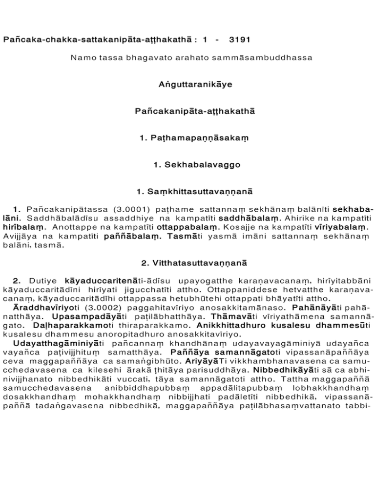 Pañcaka-chakka-sattakanip±ta-aµµhakath± : 1 - 3191 Namo tassa bhagavato arahato samm±sambuddhassa Aªguttaranik±ye Pañcakanip±ta-aµµhakath± 1. Paµhamapaºº±saka½ 1. Sekhabalavaggo 1. Sa½khittasuttavaººan± 1. Pañcakanip±tassa (3.0001) paµhame sattanna½ sekh±na½ bal±n²ti sekhabal±ni. Saddh±bal±d²su assaddhiye na kampat²ti saddh±bala½. Ahirike na kampat²ti hir²bala½. Anottappe na kampat²ti ottappabala½. Kosajje na kampat²ti v²riyabala½. Avijj±ya na kampat²ti paññ±bala½. Tasm±ti yasm± im±ni sattanna½ sekh±na½ bal±ni, tasm±. 2. Vitthatasuttavaººan± 2. Dutiye k±yaduccariten±ti-±d²su upayogatthe karaºavacana½, hir²yitabb±ni k±yaduccarit±d²ni hir²yati jigucchat²ti attho. Ottappaniddese hetvatthe karaºavacana½, k±yaduccarit±d²hi ottappassa hetubh³tehi ottappati bh±yat²ti attho. ¾raddhav²riyoti (3.0002) paggahitav²riyo anosakkitam±naso. Pah±n±y±ti pah±natth±ya. Upasampad±y±ti paµil±bhatth±ya. Th±mav±ti v²riyath±mena samann±gato. Da¼haparakkamoti thiraparakkamo. Anikkhittadhuro kusalesu dhammes³ti kusalesu dhammesu anoropitadhuro anosakkitav²riyo. Udayatthag±miniy±ti pañcanna½ khandh±na½ udayavayag±miniy± udayañca vayañca paµivijjhitu½ samatth±ya. Paññ±ya samann±gatoti vipassan±paññ±ya ceva maggapaññ±ya ca samaªgibh³to. Ariy±y±Ti vikkhambhanavasena ca samucchedavasena ca kilesehi ±rak± µhit±ya parisuddh±ya. Nibbedhik±y±ti s± ca abhinivijjhanato nibbedhik±ti vuccati, t±ya samann±gatoti attho. Tattha maggapaññ± samucchedavasena anibbiddhapubba½ appad±litapubba½ lobhakkhandha½ dosakkhandha½ mohakkhandha½ nibbijjhati pad±let²ti nibbedhik±, vipassan±paññ± tadaªgavasena nibbedhik±, maggapaññ±ya paµil±bhasa½vattanato tabbi- passan± nibbedhik±ti vattu½ vaµµati. Samm± dukkhakkhayag±miniy±ti idh±pi maggapaññ± samm± hetun± nayena vaµµadukkhañca kilesadukkhañca khepayam±n± gacchat²ti samm± dukkhakkhayag±min² n±ma, vipassan±paññ± tadaªgavasena vaµµadukkhañca kilesadukkhañca khepayam±n± gacchat²ti dukkhakkhayag±min². Dukkhakkhayag±miniy± v± maggapaññ±ya paµil±bh±ya sa½vattanatopes± dukkhakkhayag±min²ti veditabb±. Iti imasmi½ sutte pañca bal±ni missak±neva kathit±ni, tath± pañcame. 6. Sam±pattisuttavaººan± 6. Chaµµhe akusalassa sam±patt²ti akusaladhammassa sam±pajjan±, tena saddhi½ samaªgibh±voti attho. Pariyuµµh±ya tiµµhat²ti pariyonandhitv± tiµµhati. 7. K±masuttavaººan± 7. Sattame k±mesu la¼it±ti vatthuk±makilesak±mesu la¼it± abhirat±. Asitaby±bhaªginti tiºal±yana-asitañceva tiºavahanak±jañca. Kulaputtoti ±c±rakulaputto. Oh±y±ti pah±ya. Ala½ (3.0003) vacan±y±ti yutta½ vacan±ya. Labbh±ti sulabh± sakk± labhitu½. H²n± k±m±ti pañcanna½ n²cakul±na½ k±m±. Majjhim± k±m±ti majjhimasatt±na½ k±m±. Paº²t± k±m±ti r±jar±jamah±matt±na½ k±m±. K±m±tveva saªkha½ gacchant²ti k±manavasena k±metabbavasena ca k±m±-icceva saªkha½ gacchanti. Vuddho hot²Ti mahallako hoti. Ala½paññoti yuttapañño. Attaguttoti attan±va gutto rakkhito, att±na½ v± gopetu½ rakkhitu½ samattho. N±la½ pam±d±y±ti na yutto pamajjitu½. Saddh±ya akata½ hot²ti ya½ saddh±ya kusalesu dhammesu k±tu½ yutta½, ta½ na kata½ hoti. Sesapadesupi eseva nayo. Anapekkho d±n±ha½, bhikkhave, tasmi½ bhikkhusmi½ hom²ti eva½ saddh±d²hi k±tabba½ katv±va sot±pattiphale patiµµhite tasmi½ puggale anapekkho hom²ti dasseti. Imasmi½ sutte sot±pattimaggo kathito. 8. Cavanasuttavaººan± 8. Aµµhame saddhammeti s±sanasaddhamme. Assaddhoti okappanasaddh±ya ca pakkhandanasaddh±ya c±ti dv²hipi saddh±hi virahito. Cavati nappatiµµh±t²ti imasmi½ s±sane guºehi cavati, patiµµh±tu½ na sakkoti. Iti imasmi½ sutte appatiµµh±nañca patiµµh±nañca kathita½. 9. Paµhama-ag±ravasuttavaººan± 9. Navame n±ssa g±ravoti ag±ravo. N±ssa patissoti appatisso, ajeµµhako an²cavutti. Sesamettha purimasadisameva. 10. Dutiya-ag±ravasuttavaººan± 10. Dasame abhabboti abh±jana½. Vuddhinti va¹¹hi½. Vir³¼hinti vir³¼ham³lat±ya niccalabh±va½. Vepullanti mahantabh±va½. Sesa½ sabbattha utt±namev±ti. Sekhabalavaggo paµhamo. 2. Balavaggo 1. Ananussutasuttavaººan± 11. Dutiyassa (3.0004) paµhame pubb±ha½, bhikkhave, ananussutesu dhammes³ti aha½, bhikkhave, pubbe ananussutesu cat³su saccadhammesu. Abhiññ±vos±nap±ramippatto paµij±n±m²ti cat³su saccesu cat³hi maggehi so¼asavidhassa kiccassa karaºena abhij±nitv± vos±nap±rami½ sabbesa½ kicc±na½ niµµhitatt± katakiccabh±va½ p±ra½ patto paµij±n±m²ti mah±bodhipallaªke attano ±gaman²yaguºa½ dasseti. Tath±gatass±ti aµµhahi k±raºehi tath±gatassa. Tath±gatabal±n²ti yath± tehi gantabba½, tatheva gat±ni pavatt±ni ñ±ºabal±ni. ¾sabha½ µh±nanti seµµhaµµh±na½. S²han±danti abh²tan±da½. Brahmacakkanti seµµhacakka½. Pavattet²ti katheti. 2. K³µasuttavaººan± 12. Dutiye sekhabal±n²ti sekh±na½ ñ±ºabal±ni. Agganti uttama½. Sesabal±ni gop±nasiyo k³µa½ viya saªgaºh±t²ti saªg±hika½. T±neva bal±ni sa½hat±ni karot²ti saªgh±taniya½. 3. Sa½khittasuttavaººan± 13. Tatiye tattha muµµhassacce na kampat²ti satibala½. Uddhacce na kampat²ti sam±dhibala½. 4. Vitthatasuttavaººan± 14. Catutthe satinepakken±ti ettha nepakka½ vuccati paññ±, s± satiy± upak±rakabh±vena gahit±. 5. Daµµhabbasuttavaººan± 15. Pañcame savisayasmi½yeva lokiyalokuttaradhamme kathetu½ kattha ca, bhikkhave, saddh±bala½ daµµhabbanti-±dim±ha. Yath± hi catt±ro seµµhiputt±, r±j±ti r±japañcamesu sah±yesu “nakkhatta½ k²¼iss±m±”ti v²thi½ otiººesu ekassa seµµhiputtassa geha½ gatak±le itare catt±ro (3.0005) tuºh² nis²danti, gehas±mikova “imesa½ kh±dan²ya½ bhojan²ya½ detha, gandham±l±laªk±r±d²ni deth±”ti gehe vic±reti. Dutiyatatiyacatutthass