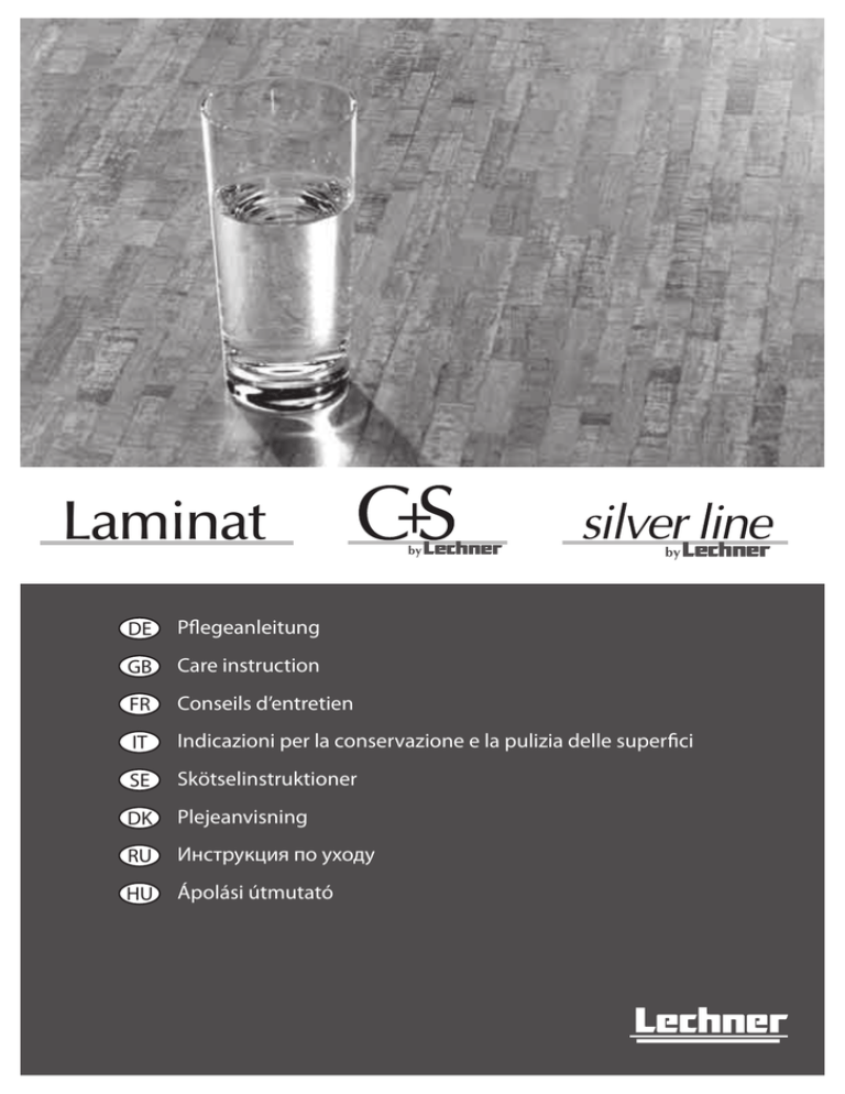 Laminat DE Pflegeanleitung GB Care instruction FR Conseils d’entretien IT Indicazioni per la conservazione e la pulizia delle superfici SE Skötselinstruktioner DK Plejeanvisning RU Инструкция по уходу HU Ápolási útmutató 2 Laminat / C+S by Lechner / silver line by Lechner DE Pflegeanleitung deutsch Seite 4 GB Care instruction english Page 5 FR Conseils d’entretien français Page 6 IT Indicazioni per la conservazione e la pulizia delle superfici italiano SE Skötselinstruktioner svenska Sida 8 DK Plejeanvisning dansk Side 9 RU Инструкция по уходу на русском языке HU Ápolási útmutató magyar Pagina 7 Страницы 10 Oldal 11 Laminat / C+S by Lechner / silver line by Lechner 3 DE GB Sie haben sich für eine Arbeitsplatte bzw. Rückwand aus Schichtstoff entschieden. Für die sogenannte Laminat-Oberfläche werden mehrere Papierschichten mit einem Spezialharz getränkt und miteinander verpresst. Anschließend wird das Laminat auf eine Holz-Trägerplatte verleimt. Reinigung von Schichtstoffarbeitsflächen Die Auswahl an Farben und Dekoren ist bei diesem Material nahezu unbegrenzt, wobei vor allem Holz- und Steinnachbildungen sehr authentisch wirken. (1) Regelmäßige Reinigung ohne schleifende und scheuernde Mittel (z.B. Scheuerpulver, Stahlwolle). Hartnäckige Verschmutzungen Behandlung von hartnäckigen Verschmutzungen (alte Flecken) mit Waschmittel oder aus Waschmittel und Wasser hergestellte Lauge (Einwirkung über Nacht) oder Flüssigreiniger mit feinster Polierkreide (für Hochglanz-Oberflächen nicht geeignet!). Cleaning laminate worktops (1) Feuchtigkeit (wie z.B. stehendes Wasser, feuchter Schwamm) auf den Stoßfugen ist unverzüglich zu entfernen. Clean regularly without abrasive or scrubbing agents (eg scouring powder, steel wool). Nicht zur Reinigung verwenden: • Möbelpolituren, fett- und wachshaltige Reinigungsmittel neigen dazu, Strukturierungen der Oberfläche zu füllen und eine schmutzbindende Schicht aufzubauen und dürfen daher nicht verwendet werden. The selection of colours and patterns of this material are virtually unlimited, the most usual often depict very authentic wood and stone reproductions. Please note! (1) (1) Moisture (such as standing water, damp sponges) in a jointed area must be removed immediately. Light deposits Clean with paper wipes, soft cloth, sponge or similar (dry or wet). (2 a) (2 a+b) Zum Abstellen von heißen Kochgeräten sowie für Schneidarbeiten empfehlen wir die Verwendung eines geeigneten Untersetzers. Normal dirt Remove with warm water, cloth, sponge or brush and commercial cleaning products without abrasive ingredients (such as glass cleaner) – depending on the degree of staining – rinse and dry completely. Stubborn stains Treat stubborn stains (old stains) with a detergent or detergent and water, leave to soak (overnight) or use liquid cleaner with a fine polishing ingredient (not suitable for high-gloss surfaces!). (2 b) (2 a) (2 a+b) When placing hot pots and pans or chopping, we recommend the use of a suitable surface protector. (2 b) Remove grease, oil, wax, etc., with organic solvents. Entfernung von Fett, Öl, Wachs etc. mit organischen Lösungsmitteln. Schattierungen und Schlieren entstehen durch Reinigen mit organischen Lösungsmitteln, bei Benutzung von kaltem Wasser, gebrauchten Tüchern oder Fensterledern, daher Nachspülen mit warmem Wasser und Trocknen mit Papierwischtüchern. The so-called laminate surface consists of several layers of paper impregnated with a special resin which are pressed together, this is subsequently glued to a chipboard core. Bitte beachten! Leichte Verschmutzungen Reinigung mit Papierwischtuch, weichem Tuch, Schwamm o.Ä. (trocken oder feucht). Normale Verschmutzungen Entfernung mit warmen Wasser, Tuch, Schwamm oder Bürste und handelsüblichen Reinigungsmitteln ohne scheuernde Bestandteile (wie z.B. Glasreiniger) – je nach Verschmutzungsgrad einwirken lassen – später restlos entfernen. You have chosen a high quality laminated work top. Reinigung von silver line-Rückwänden silver line-Rückwände sollten mit einem weichen Tuch und einem milden Reinigungsmittel, das keine schleifenden Bestandteile enthalten darf, gesäubert werden. Längere Einwirkzeiten von Flüssigkeiten auf der Oberfläche vermeiden. Es empfiehlt sich eine Reinigung in Richtung des Dekorverlaufes / Strukturrichtung (wenn vorhanden), sonst können Kratzer auf der Oberfläche entstehen. Shades and streaks caused by cleaning with organic solvents, use cold water, old towels or chamois leather, then rinse with warm water and dry with paper wipes. Do not use for cleaning: • Furniture polish, grease or anything with wax ingredients, these agents tend to fill the structure of the surface and build a dirt-binding layer. • Strong acids or acid salts. • Chlorine-containing and aggressive cleaners, such as Cillit Bang and Lime-Descaler. Cleaning silver line backwalls silver line backwalls should be cleaned with a soft cloth and a mild detergent that does not contain abrasive substances. Avoid prolonged exposure to liquids on the surface. We recommend cleaning in the direction of the decorative pattern / structure direction (if any), otherwise scratches may show on the surface. • Keine Verwendung von Reinigungsmitteln, die starke Säuren oder saure Salze enthalten. • Keine chlorhaltigen und aggressiven Reiniger, wie z.B. Cillit Bang und Antikalk, verwenden. 4 Laminat / C+S by Lechner / silver line by Lechner Laminat / C+S by Lechner / silver line by Lechner 5 FR IT Vous avez choisi un plan de travail ou une crédence en stratifié. Pour la fabrication d’une surface en stratifié, plusieurs couches de papier trempées dans une résine spéciale sont compressées puis, après durcissement, collées sur une plaque de support en bois. Nettoyage des plans de travail en stratifié Abbiamo deciso di realizzare piani di lavoro e pannelli in laminato. Ce matériau per