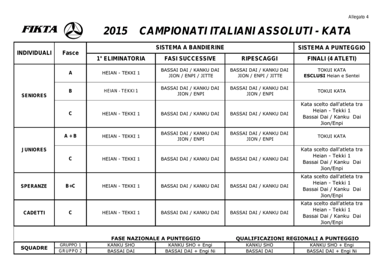 Allegato 4 2015 INDIVIDUALI CAMPIONATI ITALIANI ASSOLUTI - KATA SISTEMA A BANDIERINE Fasce SISTEMA A PUNTEGGIO 1° ELIMINATORIA FASI SUCCESSIVE RIPESCAGGI FINALI (4 ATLETI) A HEIAN - TEKKI 1 BASSAI DAI / KANKU DAI JION / ENPI / JITTE BASSAI DAI / KANKU DAI JION / ENPI / JITTE TOKUI KATA ESCLUSI Heian e Sentei B HEIAN - TEKKI 1 BASSAI DAI / KANKU DAI JION / ENPI BASSAI DAI / KANKU DAI JION / ENPI TOKUI KATA SENIORES C HEIAN - TEKKI 1 BASSAI DAI / KANKU DAI BASSAI DAI / KANKU DAI Kata scelto dall'atleta tra Heian - Tekki 1 Bassai Dai / Kanku Dai Jion/Enpi A+B HEIAN - TEKKI 1 BASSAI DAI / KANKU DAI JION / ENPI BASSAI DAI / KANKU DAI JION / ENPI TOKUI KATA BASSAI DAI / KANKU DAI Kata scelto dall'atleta tra Heian - Tekki 1 Bassai Dai / Kanku Dai Jion/Enpi BASSAI DAI / KANKU DAI Kata scelto dall'atleta tra Heian - Tekki 1 Bassai Dai / Kanku Dai Jion/Enpi BASSAI DAI / KANKU DAI Kata scelto dall'atleta tra Heian - Tekki 1 Bassai Dai / Kanku Dai Jion/Enpi JUNIORES C SPERANZE CADETTI B+C HEIAN - TEKKI 1 HEIAN - TEKKI 1 C HEIAN - TEKKI 1 GRUPPO 1 KANKU SHO BASSAI DAI BASSAI DAI / KANKU DAI BASSAI DAI / KANKU DAI BASSAI DAI / KANKU DAI FASE NAZIONALE A PUNTEGGIO SQUADRE GRUPPO 2 KANKU SHO + Engi BASSAI DAI + Engi Ni QUALIFICAZIONI REGIONALI A PUNTEGGIO KANKU SHO BASSAI DAI KANKU SHO + Engi BASSAI DAI + Engi Ni