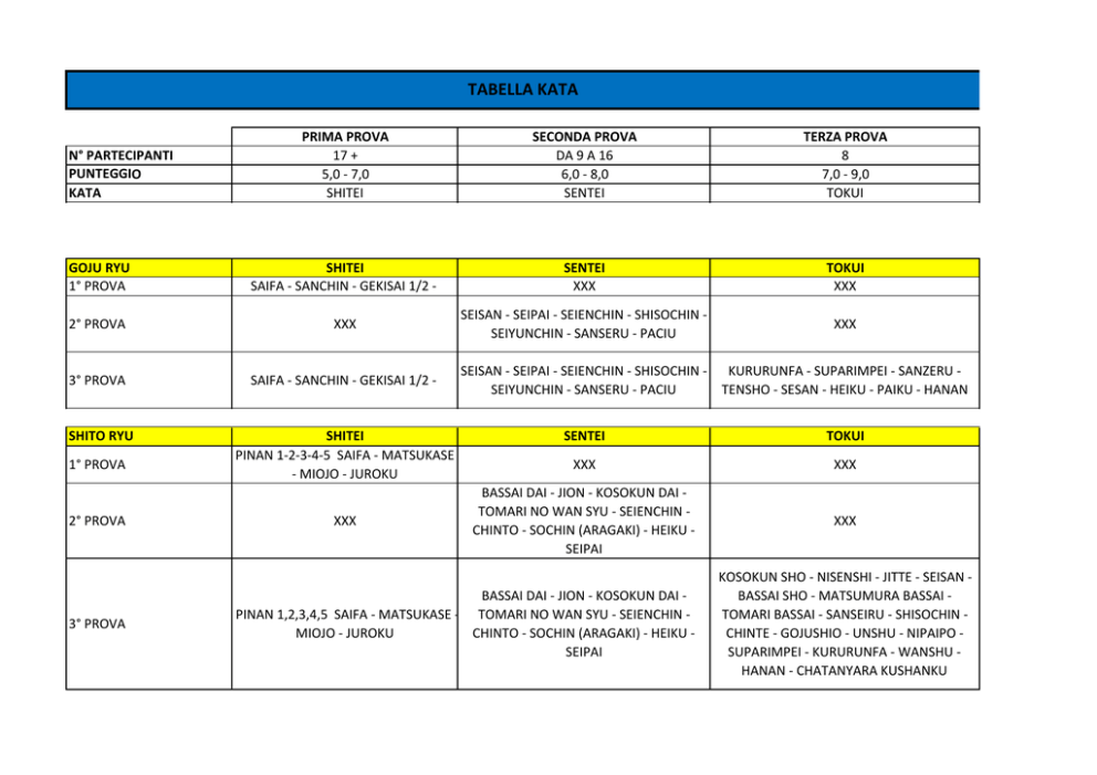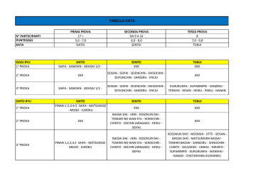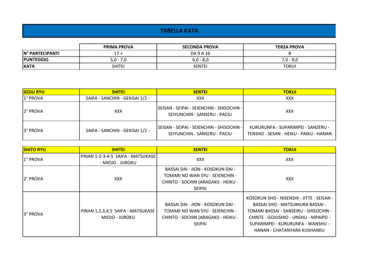 TABELLA KATA PRIMA PROVA 17 + 5,0 ‐ 7,0 SHITEI SECONDA PROVA DA 9 A 16 6,0 ‐ 8,0 SENTEI TERZA PROVA 8 7,0 ‐ 9,0 TOKUI GOJU RYU 1° PROVA SHITEI SAIFA ‐ SANCHIN ‐ GEKISAI 1/2 ‐ SENTEI XXX TOKUI XXX 2° PROVA XXX SEISAN ‐ SEIPAI ‐ SEIENCHIN ‐ SHISOCHIN ‐ SEIYUNCHIN ‐ SANSERU ‐ PACIU XXX 3° PROVA SAIFA ‐ SANCHIN ‐ GEKISAI 1/2 ‐ SHITO RYU SHITEI PINAN 1‐2‐3‐4‐5 SAIFA ‐ MATSUKASE ‐ MIOJO ‐ JUROKU N° PARTECIPANTI PUNTEGGIO KATA 1° PROVA 2° PROVA 3° PROVA XXX SEISAN ‐ SEIPAI ‐ SEIENCHIN ‐ SHISOCHIN ‐ KURURUNFA ‐ SUPARIMPEI ‐ SANZERU ‐ SEIYUNCHIN ‐ SANSERU ‐ PACIU TENSHO ‐ SESAN ‐ HEIKU ‐ PAIKU ‐ HANAN SENTEI TOKUI XXX XXX BASSAI DAI ‐ JION ‐ KOSOKUN DAI ‐ TOMARI NO WAN SYU ‐ SEIENCHIN ‐ CHINTO ‐ SOCHIN (ARAGAKI) ‐ HEIKU ‐ SEIPAI XXX BASSAI DAI ‐ JION ‐ KOSOKUN DAI ‐ PINAN 1,2,3,4,5 SAIFA ‐ MATSUKASE ‐ TOMARI NO WAN SYU ‐ SEIENCHIN ‐ CHINTO ‐ SOCHIN (ARAGAKI) ‐ HEIKU ‐ MIOJO ‐ JUROKU SEIPAI KOSOKUN SHO ‐ NISENSHI ‐ JITTE ‐ SEISAN ‐ BASSAI SHO ‐ MATSUMURA BASSAI ‐ TOMARI BASSAI ‐ SANSEIRU ‐ SHISOCHIN ‐ CHINTE ‐ GOJUSHIO ‐ UNSHU ‐ NIPAIPO ‐ SUPARIMPEI ‐ KURURUNFA ‐ WANSHU ‐ HANAN ‐ CHATANYARA KUSHANKU SHOTOKAN 1° PROVA 2° PROVA 3° PROVA WADO RYU 1° PROVA SHITEI HEIAN 1‐2‐3‐4‐5‐ TEKKI SHODAN XXX HEIAN 1‐2‐3‐4‐5‐ TEKKI SHODAN SHITEI PINAN 1‐2‐3‐4‐5‐ ‐ NAIHANCHI 2° PROVA XXX 3° PROVA PINAN 1‐2‐3‐4‐5‐ ‐ NAIHANCHI SENTEI XXX BASSAI DAI ‐ ENPI ‐ JION ‐ KANKU DAI ‐ HANGETSU ‐ JITTE TOKUI XXX XXX TEKKI NIDAN ‐ TEKKI SANDAN ‐ GANKAKU ‐ BASSAI SHO ‐ KANKU SHO ‐ SOCHIN ‐ BASSAI DAI ‐ ENPI ‐ JION ‐ KANKU DAI ‐ NIJUSHIHO ‐ GOJUSHIO DAI ‐ GOJUSHIO SHO ‐ HANGETSU ‐ JITTE WANKAN ‐ CHINTE ‐ UNSU ‐ MEIKIO ‐ JIIN SENTEI XXX KUSHANKU ‐ NISEISHI ‐ JION ‐ BASSAI (PASSAI) ‐ JITTE ‐ SEISHAN ‐ WANCHU ‐ ROAI KUSHANKU ‐ NISEISHI ‐ JION ‐ BASSAI (PASSAI) ‐ JITTE ‐ SEISHAN ‐ WANCHU ‐ ROAI TOKUI XXX XXX CHINTO ‐ UNSU ‐ SUPARIMPEI