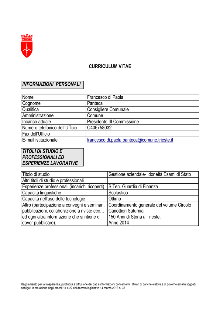 CURRICULUM VITAE INFORMAZIONI PERSONALI Nome Cognome Qualifica Amministrazione Incarico attuale Numero telefonico dell’Ufficio Fax dell’Ufficio E-mail istituzionale Francesco di Paola Panteca Consigliere Comunale Comune Presidente III Commissione O406758032 [email protected] TITOLI DI STUDIO E PROFESSIONALI ED ESPERIENZE LAVORATIVE Titolo di studio Altri titoli di studio e professionali Esperienze professionali (incarichi ricoperti) Capacità linguistiche Capacità nell’uso delle tecnologie Altro (partecipazione a convegni e seminari, pubblicazioni, collaborazione a riviste ecc… ed ogni altra informazione che si ritiene di dover pubblicare). Gestione aziendale- Idoneità Esami di Stato S.Ten. Guardia di Finanza Scolastico Ottimo Coordinamento generale del volume Circolo Canottieri Saturnia 150 Anni di Storia a Trieste. Anno 2014 Regolamento per la trasparenza, pubblicità e diffusione dei dati e informazioni concernenti i titolari di cariche elettive e di governo ed altri soggetti obbligati in attuazione degli articoli 14 e 22 del decreto legislativo 14 marzo 2013 n. 33
