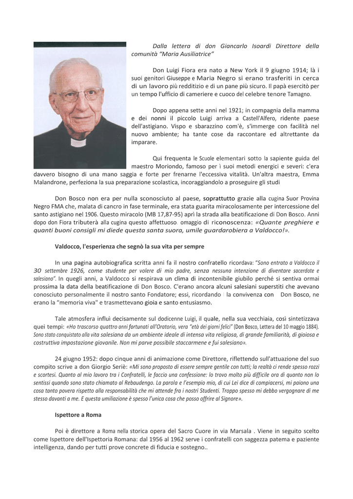 Dalla lettera di don Giancarlo Isoardi Direttore della comunità “Maria Ausiliatrice” Don Luigi Fiora era nato a New York il 9 giugno 1914; là i suoi genitori Giuseppe e Maria Negro si erano trasferiti in cerca di un lavoro più redditizio e di un pane più sicuro. Il papà esercitò per un tempo l'ufficio di cameriere e cuoco del celebre tenore Tamagno. Dopo appena sette anni nel 1921; in compagnia della mamma e dei nonni il piccolo Luigi arriva a Castell'Alfero, ridente paese dell'astigiano. Vispo e sbarazzino com'è, s'immerge con facilità nel nuovo ambiente; ha tante cose da raccontare ed altrettante da imparare. Qui frequenta le Scuole elementari sotto la sapiente guida del maestro Moriondo, famoso per ì suoi metodi energici e severi: c'era davvero bisogno di una mano saggia e forte per frenarne l'eccessiva vitalità. Un'altra maestra, Emma Malandrone, perfeziona la sua preparazione scolastica, incoraggiandolo a proseguire gli studi Don Bosco non era per nulla sconosciuto al paese, soprattutto grazie alla cugina Suor Provina Negro FMA che, malata di cancro in fase terminale,·era stata guarita miracolosamente per intercessione del santo astigiano nel 1906. Questo miracolo (MB 17,87-95) aprì la strada alla beatificazione di Don Bosco. Anni dopo don Fiora tributerà alla cugina questo affettuoso. omaggio di riconoscenza: «Quante preghiere e quanti buoni consigli mi diede questa santa suora, umile guardarobiera a Valdocco!». Valdocco, l'esperienza che segnò la sua vita per sempre In una pagina autobiografica scritta anni fa il nostro confratello ricordava: “Sono entrato a Valdocco il 30 settembre 1926, come studente per volere di mio padre, senza nessuna intenzione di diventare sacerdote e salesiano”. In quegli anni, a Valdocco si respirava un clima di incontenibile giubilo perché si sentiva ormai prossima la data della beatificazione di Don Bosco. C'erano ancora alcuni salesiani superstiti che avevano conosciuto personalmente il nostro santo Fondatore; essi, ricordando I la convivenza con Don Bosco, ne erano la “memoria viva" e trasmettevano gioia e santo entusiasmo. Tale atmosfera influì decisamente sul dodicenne Luigi, il quale, nella sua vecchiaia, così sintetizzava quei tempi: «Ho trascorso quattro anni fortunati all'Oratorio, vera “età dei giorni felici” (Don Bosco, Lettera del 10 maggio 1884). Sono stato conquistato alla vita salesiana da un ambiente ideale di intensa vita religiosa, di grande familiarità, di gioiosa e costruttiva impostazione giovanile. Non mi parve possibile staccarmene e fui salesiano». 24 giugno 1952: dopo cinque anni di animazione come Direttore, riflettendo sull'attuazione del suo compito scrive a don Giorgio Seriè: «Mi sono proposto di essere sempre gentile con tutti; la realtà ci rende spesso rozzi e scortesi. Quanto al mio lavoro tra i Confratelli, le faccio una confessione: lo trovo molto più difficile ora di quanto non lo sentissi quando sono stato chiamato al Rebaudengo. La parola e l’esempio mio, di cui Lei dice di compiacersi, mi paiono una cosa tanto povera rispetto alla responsabilità che mi attende fra i nostri Studenti. Troppo spesso mi debbo vergognare di me stesso davanti a me. E questa umiliazione è spesso l’unica cosa che posso offrire al Signore». Ispettore a Roma Poi è direttore a Roma nella storica opera del Sacro Cuore in via Marsala . Viene in seguito scelto come Ispettore dell'Ispettoria Romana: dal 1956 al 1962 serve i confratelli con saggezza patema e paziente intelligenza, dando per tutti prove concrete di fiducia e sostegno.. Dalle sue numerose e precise Circolari emerge. la figura di un vero trascinatore. Don Fiora non si accontenta di mezze misure. Esige da sé il meglio e lo sollecita con discrezione e pazienza dai confratelli. C’è un continuo susseguirsi di attività; non è solo un “fare” vorticoso e disordinato. Don Fiora insiste su un "piano annuale di lavoro": lo vuole organizzato, con priorità ben precise, con mete chiaramente definite. Si rivela guida sicura e attenta. Già nel suo primo anno organizza una speciale “festa delle mamme e dei papà che hanno figlioli Salesiani o figlie di Maria Ausiliatrice”. Ricorre nel 1956 il centenario della morte di Mamma Margherita; don Fiora unisce il ricordo della santa mamma di Don Bosco a quello dei Genitori dei Salesiani, "i veri benefattori della nostra Congregazione". Nel 957 organizza varie Giornate di aggiornamento didattico-pedagogico. Desidera "attirare l’attenzione dei Confratelli sull'importantissima missione educativa”. Ricorda: “Non illudiamoci di poter conservare con, facilità la fama di educatori che ci ha procurato Don Bosco (..). Un certo empirismo facilone non è più sufficiente per destare simpatia e ammirazione di fronte a innegabili progressi ormai raggiunti in campo pedagogico o anche solo additati come meta di un sano lavoro educativo" (Circolare del. 14 dicembre 1957). Nel 1958, celebrando il centenario del primo viaggio di Don Bosco a Roma, coglie l'occasione per insistere: “Seguire le orme di Don Bosco a Roma a 100 anni di distanza vuol dire per noi risentire più vicina la sua persona" (Circolare del 1° febbraio 1958). L'anno seguente si vive a Roma un momento di particolare significatività: sta per essere consacrato il maestoso tempio di Don Bosco;-per l'occasione, l'urna del nostro Santo giunge da Torino. Don Fiora non esita ad affermare che “noi dobbiamo tutto a Don Bosco: la vocazione, un esempio vivo di santità, la guida del nostro apostolato giovanile. II buon nome che facilita tanto il nostro lavoro e ne-copre le deficienze. Andando nel suo Tempio per venerare la sua urna cerchiamo di risentire il richiamo della santità e la passione ardente per i giovani. Più che del suo trionfo Don Bosco gioirà del nostro incontro e del dono del nostro cuore” (Circolare del 22aprile 1959). Settembre 1962, don Fiora termina il suo secondo sessennio come Ispettore. Si congeda dai confratelli con