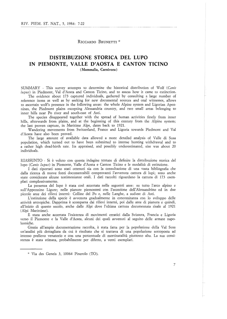 lupus) in Piedmont, Val d'Aosta and Canton Ticino, and to assess how it carne to extinction.
