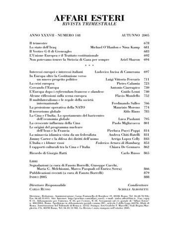 AFFARI ESTERI RIVISTA TRIMESTRALE ANNO XXXVII - NUMERO 148 AUTUNNO 2005 Il trimestre Lo stato dell’Iraq Michael O’Hanlon e Nina Kamp Il Vertice G-8 di Greneagles L’Unione Europea e il Trattato costituzionale Non potevamo tenere la Striscia di Gaza per sempre Ariel Sharon 678 681 683 692 694 * * * Interessi europei e interessi italiani Ludovico Incisa di Camerana In Europa oltre la Costituzione verso un nuovo progetto politico Luigi Vittorio Ferraris La crisi europea Pietro Calamia Cercando l’Europa Antonio Ciarrapico L’Europa dopo i referendum francese e olandese Guido Lenzi Alcune riflessioni sulla scena europea Flavio Mondello Il multilateralismo e le regole della società internazionale Ferdinando Salleo La proiezione operativa della NATO Maurizio Moreno Il terrorismo globale Aldo Rizzo La Cina e l’India. Lo spostamento del baricentro dell’economia globale Luca Paolazzi La crescente influenza della Cina Paolo Migliavacca Le origini del programma nucleare dell’Iran e la Francia Pierluca Pucci Poppi La minaccia islamica vista da un federalista Andrea Chiti-Batelli Jimmy Carter e la difesa dei diritti dell’uomo Arrigo Lopez Celly L’Italia e i khmer rossi Federico Arturo di Homburg I rapporti culturali tra la Cina e l’Italia Chiara De Gennaro Ricordo di Giorgio Ratti Carlo Russo LIBRI Segnalazioni (a cura di Fausto Borrelli, Giuseppe Cucchi, Maria G. Melchionni, Marco Pasquali ed Enrico Serra) Pubblicazioni recenti (a cura di Fausto Borrelli) INDICI 2005 Direttore Responsabile CARLO RUSSO 697 711 723 730 740 752 766 774 785 795 801 814 831 843 853 862 865 866 879 888 Condirettore ACHILLE ALBONETTI Direzione, Redazione, Amministrazione: Largo Fontanella di Borghese 19, 00186 Roma; Tel. 06.68.78.926; Fax 06.68.33.015; Sito Internet: http://geocities.com/affari_esteri; e-mail: [email protected]. Una copia € 11. Abbonamento per l’interno, € 44; per l’estero, € 50. Versamenti sul c/c postale di “Affari Esteri” n. 40612004, Roma. Spedizione in abbonamento postale comma 20C, articolo 2 della Legge 662/96, filiale di Roma. Autorizzazione del Tribunale di Roma n. 12312. Stampa: Arti Grafiche S. Marcello, Viale Regina Margherita 176, 00198 Roma, Tel. 06.85.53.982. La Rivista è stata stampata nell’ottobre 2005. Il trimestre I l centro di crisi, ormai da tre anni, è in Iraq, in Israele e Palestina, in Iran, in Afghanistan, ed anche nella Corea del Nord. Iraq. La situazione non accenna a migliorare. Continuano quotidianamente gli attacchi sanguinosi degli insorti con dozzine di vittime, soprattutto militari e civili iracheni. Dopo difficili negoziati, l’Assemblea, eletta il 30 gennaio 2005, ha approvato, a maggioranza e con l’opposizione dei sunniti, il progetto di Costituzione, che sarà sottoposto a referendum il 15 ottobre 2005. Se il progetto sarà approvato, il 31 dicembre avranno luogo le elezioni legislative. Il Segretario di Stato della Santa Sede, Cardinale Angelo Sodano, ha dichiarato che restare in Iraq è un dovere. Israele e Palestina. Il 15 agosto 2005, dopo 38 anni, Israele si è ritirato dalla Striscia di Gaza ed ha smantellato i suoi ventuno insediamenti. L’abbandono è avvenuto rapidamente e senza la resistenza di migliaia di coloni. Il Presidente israeliano Sharon ha dichiarato per la prima volta all’Assemblea dell’ONU che i palestinesi hanno diritto a un nuovo Stato. Abu Mazen ha fissato per il 25 gennaio 2006 le elezioni legislative in Palestina, inizialmente previste per luglio e, poi, per settembre 2005. Iran. Il nuovo Governo iraniano, istituito a seguito delle elezioni del 17 e 24 giugno 2005, ha respinto la proposta presentata dai Governi di Francia, Germania e Regno Unito, a nome dell’Unione Europea. Ha, quindi, deciso di cancellare la sospensione temporanea della attività nel settore della produzione di uranio arricchito ed ha iniziato la trasformazione di uranio naturale in esafluoruro di uranio negli impianti di Isfahan. Il Consiglio dei Governatori dell’Agenzia Internazionale per l’Energia Atomica (AIEA) delle Nazioni Unite ha approvato a maggioranza il 24 settembre 2005 (22 voti a favore; 1 contrario del Venezuela; 12 astenuti: tra questi Russia e Cina) una Risoluzione presentata dal Regno Unito, che rimprovera all’Iran di non aver rispettato il Trattato di Non Proliferazione Nucleare (TNP), ma prende tempo fino a novembre per cercare una soluzione prima di un eventuale rinvio al Consiglio di Sicurezza dell’ONU, come chiesto dagli Stati Uniti. La Cina e la Russia hanno dichiarato che si opporranno a sanzioni internazionali all’Iran. Questa situazione potrebbe essere molto pericolosa. Corea del Nord. Dopo tredici mesi di stallo, sono ripresi a Pechino i negoziati con Stati Uniti, Cina, Giappone, Russia e Corea del Sud per indurre la Corea del Nord ad abbandonare il programma nucleare militare. Una dichiarazione comune è stata sottoscritta il 19 settembre 2005 con la quale la Corea del Nord pone fine al programma nucleare militare in corso, aderisce nuovamente al TNP e riapre le porte agli ispettori dell’AIEA. I negoziati per un accordo formale riprenderanno in novembre. Importanti punti sono ancora da definire. In particolare, la Corea del Nord richiede preliminarmente la costruzione da parte degli Stati Uniti di una centrale nucleare per la produzione di elettricità. Afghanistan. Il 18 settembre 2005 hanno avuto luogo le elezioni del primo Parlamento afghano dal 1969 e di 34 Consigli provinciali. L’affluenza alle urne è stata buona, malgrado i tentativi della guerriglia di impedire la consultazione elettorale. La situazione generale continua ad essere precaria. Giappone. L’11 settembre 2005 si sono tenute le elezioni legislative anticipate richieste dal Presidente Koizumi, che è stato confermato a larga maggioranza. Germania. Dopo lo scioglimento anticipato del Parlamento, chiesto dal Governo Schröder, il 18 settembre 2005 hanno avuto luogo le elezioni legislative. Contro tutti i pronostici, il Pa