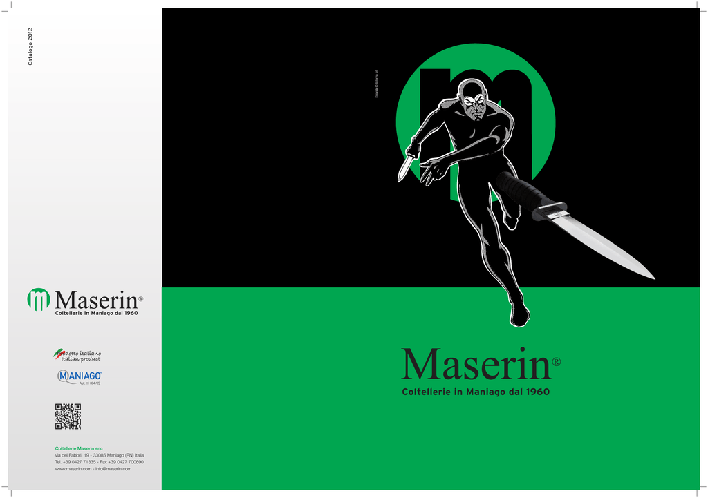 Diabolik © Astorina srl Catalogo 2012 Coltellerie in Maniago dal 1960 Aut. n° 004/05 Coltellerie in Maniago dal 1960 Coltellerie Maserin snc via dei Fabbri, 19 - 33085 Maniago (PN) Italia Tel. +39 0427 71335 - Fax +39 0427 700690 www.maserin.com - [email protected] Design: Coltellerie Maserin Diabolik © Astorina srl 999 line Caratteristiche tecniche Lama: Acciaio inox AISI 440 (160 mm) Guardia: Acciaio inox AISI 420 Lunghezza totale: 275 mm Manico: TPE - Termoplastica Elastomero Fodero: Nylon Peso: 210 gr Technical specifications Blade: AISI 440 Stainless steel (160 mm) Guards: AISI 420 Stainless steel Overall lenght: 275 mm Handle: Ruberized no-slip Sheat: Nylon Weight: 210 gr Per il cinquantesimo anniversario della nascita di Diabolik, una delle figure più amate dagli appassionati di storie a fumetti noir, le Coltellerie Maserin, in collaborazione con la casa editrice Astorina, hanno realizzato una versione “replica” del famoso coltello da lancio del Re del Terrore. Arma preferita dal personaggio nato nel 1962 dalla fantasia delle sorelle Giussani, il pugnale “Diabolik special edition” di Maserin replica le fattezze e lo stile del coltello originale, inseparabile compagno di innumerevoli avventure dell’Uomo dai mille volti. Diabolik is one the characther that people that love ‘noir’ cartoons have loved most. In his fifties anniversary Coltellerie Maserin together with Astorina (editor) have created the copy of the famous throwing knife used by the masked hero. The knife is the only weapon that the character, born in 1962 by Giussani sisters’ creation, has. The ‘Diabolik special edition’ fixed knife imitates the shape and the style of the original knife, that has been the object of the main adventures of masked man, a master in throwing. 1 Favri line Design by Attilio Morotti Caratteristiche tecniche Lama: Acciaio inox N690 (70 mm) Lunghezza aperto: 160 mm Peso: 90 gr Technical specifications Blade: N690 Stainless steel (70 mm) Overall lenght: 160 mm Weight: 90 gr /EB 379 /CO 379 /OL 379 EB: Ebano | Ebony wood CO: Cocobolo | Cocobolo wood OL: Olivo | Olive wood N: G10 nero | Black G10 B: G10 blu | Blue G10 A: G10 arancio | Orange G10 0N G1 / 379 10B /G 379 10A /G 379 2 Consoli line Design by Sergio Consoli Caratteristiche tecniche Lama: Acciaio inox CPMS35VN HRC 60 - Acciaio Damasco (70 mm) Lunghezza aperto: 170 mm Peso: 106 gr Technical specifications Blade: CPMS35VN HRC 60 Stainless steel Damascus steel (70 mm) Overall lenght: 170 mm Weight: 106 gr /RN 402 RN: Radica nera | Black burl RV: Radica verde | Green burl R: Radica | Briar wood EB: Ebano | Ebony wood FA: Faggio | Beech gold OL: Olivo | Olive wood RV 02/ 4 RN / 401 /R 401 /EB 401 /DE 401 /FA 401 Finitura: Lavorazioni artigianali Finishing: Custom well finished L /O 401 Mostrine: Alpacca Bolsters: Nickel silver 3 Atti line Design by Attilio Morotti Caratteristiche tecniche Lama: Acciaio inox CPMS35VN HRC 60 - Acciaio inox Damasco (70 mm) Lunghezza aperto: 160 mm Mostrine: Alpacca Peso: 96 gr Technical specifications Blade: CPMS35VN HRC 60 Stainless steel, Damascus steel (70 mm) Overall lenght: 160 mm Bolsters: Nickel silver Weight: 96 gr /DE 388 /EB 388 /RN 388 RN: Radica nera | Black burl R: Radica | Briar wood EB: Ebano | Ebony wood FA: Faggio | Beech gold OL: Olivo | Olive wood /R 388 /FA Finitura: Lavorazioni artigianali 388 Finishing: Custom well finished /OL 388 4 Atti line Design by Attilio Morotti Caratteristiche tecniche Lama: Acciaio inox CPMS35VN HRC 60 (70 mm) Lunghezza aperto: 160 mm Peso: 76 gr Technical specifications Blade: CPMS35VN HRC 60 Stainless steel (70 mm) Overall lenght: 160 mm Weight: 76 gr /RV 389 /DW 389 /RN 389 /EB 389 RV: Radica verde | Green burl DW: Legno del deserto | Desert wood RN: Radica nera | Black burl EB: Ebano | Ebony wood OL: Olivo | Olive wood /OL 389 Finitura: Lavorazioni artigianali Finishing: Custom well finished 5 Ram line Design: Jean Marc Arnaud 501/BS Lama | Blade: Acciaio inox AUS8 | AUS8 Stainless steel - 70 mm Lunghezza aperto | Overall length: 165 mm Peso | Weight: 76 gr Manico | Handle: Bosso | Box wood 501/OL Manico | Handle: Olivo | Olive wood 501/BO Manico | Handle: Bocote | Bocote wood 501/EB Manico | Handle: Ebano | Ebony wood 6 Aur line Design: Claudio Volpato 436/AL Lama | Blade: Acciaio inox 440 | 440 Stainless steel - 48 mm Lunghezza aperto | Overall length: 120 mm Peso | Weight: 64 gr Manico | Handle: Abalone 436/BO Manico | Handle: Bocote | Bocote wood 436/EB Manico | Handle: Ebano | Ebony wood 436/OL Manico | Handle: Olivo | Olive wood 436/IN Manico | Handle: Acciaio inox 420 420 Stainless steel 7 Arint line Design: Attilio Morotti 387/CR 8 Lama | Blade: Acciaio inox N690, Acciaio inox Damasco N690 Stainless steel, Damascus steel - 55 mm Lunghezza aperto | Overall length: 135 mm Peso | Weight: 86 gr Manico | Handle: Corno biondo | Blond horn 387/DE Manico | Handle: Ebano | Ebony wood 387/BO Manico | Handle: Bocote | Bocote wood 387/EB Manico | Handle: Ebano | Ebony wood 387/OL Manico | Handle: Olivo | Olive wood Gun line Design: Salvatore Puddu 397 Lama | Blade: Acciaio inox N690, Acciaio Damasco inox N690 Stainless steel, Damascus Stainless steel - 85 mm Lunghezza aperto | Overall length: 195 mm Peso | Weight: 116 gr Manico | Handle: Bocote, Olivo, Ebano Bocote wood, Olive wood, Ebony wood Mostrine | Bolsters: Alpacca | Nickel silver 398 Lama | Blade: Acciaio inox N690, N690 Stainless steel - 85 mm Lunghezza aperto | Overall length: 195 mm Peso | Weight: 90 gr Manico | Handle: Bocote, Olivo, Ebano Bocote wood, Olive wood, Ebony wood 397/DE Manico | Handle: Ebano | Ebony wood 397/BO Manico | Handle: Bocote | Bocote wood 397/OL Manico | Handle: Olivo | Olive wood 397/EB Manico | Handle: Ebano | Ebony wood 398/BO Manico | Handle: Bocote | Bocote wood 398/EB Manico | Handle: Ebano | Ebony wood 398/OL Manico | Handle: Olivo | Olive wood 9 Easy line Design: Attilio Morotti 386 385 Manico | Handle: Bocote Bocote wood 385/BO Manico | Handle: Oliv