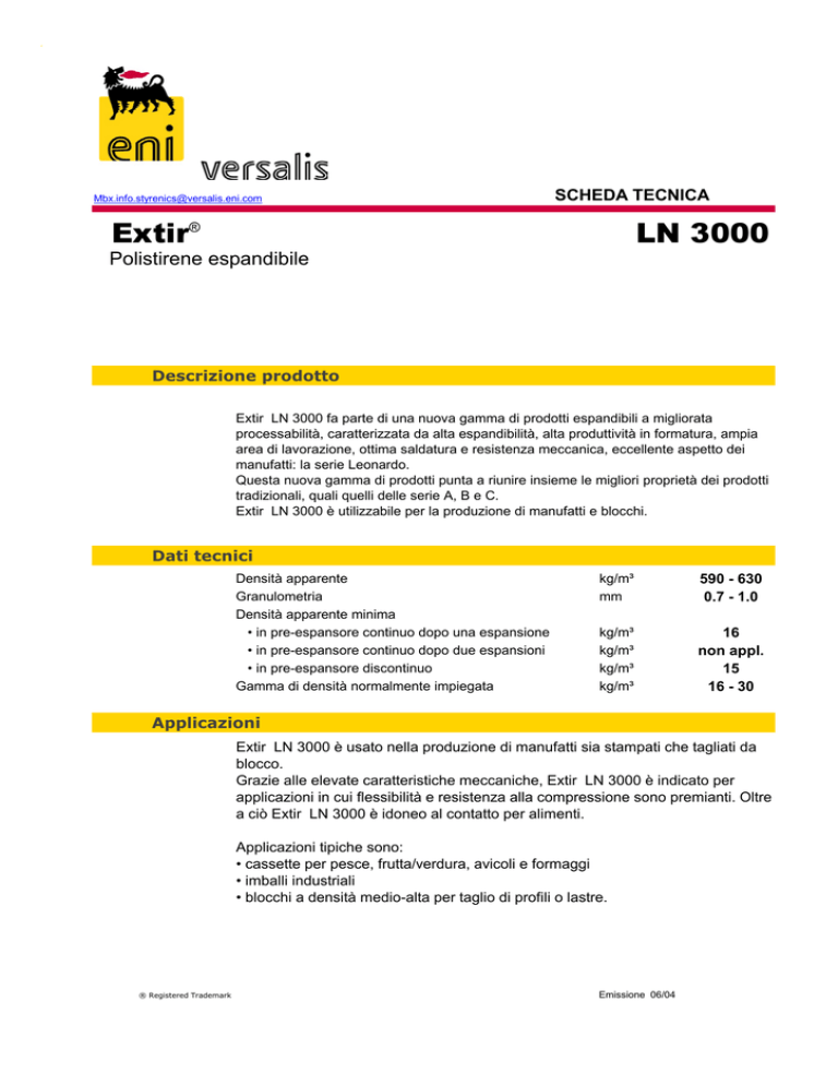 . [email protected] SCHEDA TECNICA Extir® LN 3000 Polistirene espandibile Descrizione prodotto Extir LN 3000 fa parte di una nuova gamma di prodotti espandibili a migliorata processabilità, caratterizzata da alta espandibilità, alta produttività in formatura, ampia area di lavorazione, ottima saldatura e resistenza meccanica, eccellente aspetto dei manufatti: la serie Leonardo. Questa nuova gamma di prodotti punta a riunire insieme le migliori proprietà dei prodotti tradizionali, quali quelli delle serie A, B e C. Extir LN 3000 è utilizzabile per la produzione di manufatti e blocchi. Dati tecnici Densità apparente Granulometria Densità apparente minima • in pre-espansore continuo dopo una espansione • in pre-espansore continuo dopo due espansioni • in pre-espansore discontinuo Gamma di densità normalmente impiegata kg/m³ mm 590 - 630 0.7 - 1.0 kg/m³ kg/m³ kg/m³ kg/m³ 16 non appl. 15 16 - 30 Applicazioni Extir LN 3000 è usato nella produzione di manufatti sia stampati che tagliati da blocco. Grazie alle elevate caratteristiche meccaniche, Extir LN 3000 è indicato per applicazioni in cui flessibilità e resistenza alla compressione sono premianti. Oltre a ciò Extir LN 3000 è idoneo al contatto per alimenti. Applicazioni tipiche sono: • cassette per pesce, frutta/verdura, avicoli e formaggi • imballi industriali • blocchi a densità medio-alta per taglio di profili o lastre. ® Registered Trademark Emissione 06/04 Extir® Polistirene espandibile LN 3000 Processabilità Extir LN 3000 può essere facilmente espanso tra i 16 e i 30 kg/m³, può comunque essere impiegato anche a densità superiore. Il tempo di maturazione è quello della usuale pratica industriale; si suggerisce dalle 6 alle 72 ore a seconda della densità e delle condizioni ambientali. Lo stampaggio su ogni tipo di pressa per EPS è facile, regolare, ed i manufatti prodotti soddisfano le necessità delle applicazioni in un'ampio intervallo di condizioni di vaporizzazione. . Informazioni generali Si raccomanda di conservare il prodotto in luoghi asciutti e ben ventilati a temperatura tra 15 e 20°C. A queste temperature il prodotto imballato in octabin mantiene le proprie caratteristiche per almeno un mese; in fusti metallici questo periodo si estende a sei mesi. Durante la lavorazione del Polistirene Espandibile vanno evitate tutte le possibili cause di innesco quali fiamme libere o scintille e si raccomanda quindi il divieto di fumare. Si consiglia una adeguata messa a terra delle apparecchiature e delle linee di trasporto pneumatico. Per ulteriori informazioni relative alla conservazione, imballaggio e precauzioni durante la lavorazione, si prega di fare riferimento a "Stirenici - Informazioni Tecniche di Prodotto" ed alle "Schede di Sicurezza Extir". Questo tipo risponde per composizione ai requisiti fissati dalla principali Norme per le materie plastiche destinate al contatto con gli alimenti (inclusa la direttiva CEE 90/128). Emissione 06/04 Tutti i valori riportati sono riferiti ai prodotti in versione naturale. I dati, le notizie ed i suggerimenti riportati hanno valore semplicemente indicativo. La Società non assume alcuna responsabilità per i risultati che siano ottenuti con il loro impiego o per la loro utilizzazione in violazione di eventuali brevetti. La Società è comunque disponibile a fornire su richiesta i valori garantiti per i singoli prodotti.