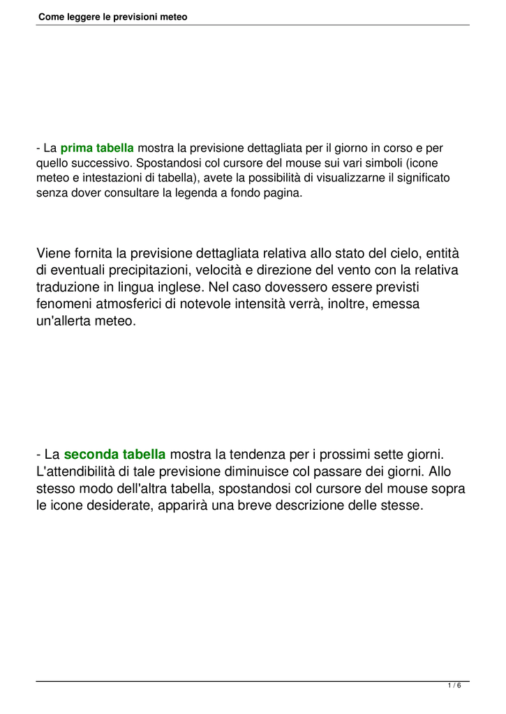 Come leggere le previsioni meteo - La prima tabella mostra la previsione dettagliata per il giorno in corso e per quello successivo. Spostandosi col cursore del mouse sui vari simboli (icone meteo e intestazioni di tabella), avete la possibilità di visualizzarne il significato senza dover consultare la legenda a fondo pagina. Viene fornita la previsione dettagliata relativa allo stato del cielo, entità di eventuali precipitazioni, velocità e direzione del vento con la relativa traduzione in lingua inglese. Nel caso dovessero essere previsti fenomeni atmosferici di notevole intensità verrà, inoltre, emessa un'allerta meteo. - La seconda tabella mostra la tendenza per i prossimi sette giorni. L'attendibilità di tale previsione diminuisce col passare dei giorni. Allo stesso modo dell'altra tabella, spostandosi col cursore del mouse sopra le icone desiderate, apparirà una breve descrizione delle stesse. 1/6 Come leggere le previsioni meteo - La terza tabella mostra un piccolo resoconto del mese in corso con gli estremi rilevati dalla stazione meteorologica di Alzano Lombardo, unitamente al confronto con la media storica di riferimento. - La quarta ed ultima tabella contiente la legenda delle icone meteo utilizzate. State organizzando un evento in zona e volete ricevere una nostra previsione personalizzata? Oppure volete avere altre delucidazioni o previsioni più dettagliate per una ricorrenza/data particolare? Contattateci qui e cercheremo di aiutarvi. 2/6 Come leggere le previsioni meteo Vi ricordiamo, come specificato nella pagina 'note legali', che non siamo in alcun modo responsabili per danni di alcun genere derivanti dall'utilizzo del sito web così come per errate previsioni meteorologiche. BREVE CENNO SULLA REALIZZAZIONE DELLE PREVISIONI METEOROLOGICHE: Le previsioni meteorologiche vengono realizzate ogni giorno da Lunedì a Sabato entro le ore 20 dal 3/6 Come leggere le previsioni meteo nostro previsore. Le previsioni di AlzanoMeteo.it vengono realizzate interpretando i modelli previsionali (nel nostro caso viene utilizzato il modello americano GFS). Brevemente, oggigiorno troviamo due tipologie di previsioni meteorologiche: 1) Automatiche: il metodo più diffuso su internet, si basa sui dati forniti da un modello previsionale i quali vengono tradotti automaticamente in simboli (sole, nubi, temporali, ...) ed estesi ad un'area fino a 30 km². Questo comporta una previsione identica in un'area piuttosto vasta, con tutte le conseguenze del caso. 4/6 Come leggere le previsioni meteo 2) Elaborate da un previsore: vengono interpretate le carte fornite dai vari modelli utilizzando la propria esperienza di anni di osservazione. Il risultato è quello di avere previsioni anche molto dettagliate e senza alcun dubbio più precise rispetto a quelle elaborate automaticamente. 5/6 Come leggere le previsioni meteo 6/6