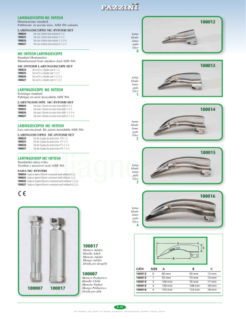 LARINGOSCOPIO MCINTOSH 100012 Illuminazione standard. Fabbricato in acciaio inox AISI 304 satinato. LARINGOSCOPIO MC-INTOSH SET 100024 Set con 3 lame Inox misure 0-1-2. 100025 Set con 3 lame Inox misure 1-2-3. 100026 Set con 4 lame Inox misure 1-2-3-4. 100027 Set con 4 lame Inox misure 0-1-2-3. lama blade lame pale lžíce 0 MCINTOSH LARYNGOSCOPE Standard illumination. Manufactured from stainless steel AISI 304. 100013 MC-INTOSH LARYNGOSCOPE SET 100024 Set w/3 s.s. blades size 0-1-2. 100025 Set w/3 s.s. blades size 1-2-3. 100026 Set w/4 s.s. blades size 1-2-3-4. 100027 Set w/4 s.s. blades size 0-1-2-3. lama blade lame pale lžíce LARYNGOSCOPE MCINTOSH Eclairage standard. Fabrique en acier inoxydable AISI 304. 1 LARYNGOSCOPE MC-INTOSH SET 100024 Set avec 3 lames en acier inox taille 0-1-2. 100025 Set avec 3 lames en acier inox taille 1-2-3. 100026 Set avec 4 lames en acier inox taille 1-2-3-4. 100027 Set avec 4 lames en acier inox taille 0-1-2-3. 100014 lama blade lame pale lžíce LARINGOSCOPIO MCINTOSH Luz convencional. De aciero inoxidable AISI 304. LARINGOSCOPIO MC-INTOSH SET 100024 Set de 3 palas de acero inox n°0-1-2. 100025 Set de 3 palas de acero inox n°1-2-3. 100026 Set de 4 palas de acero inox n°1-2-3-4. 100027 Set de 4 palas de acero inox n°0-1-2-3. 2 100015 diagnostic LARYNGOSKOP MCINTOSH Standardní zdroj svìtla. Vyroben z nerezové oceli AISI 304. lama blade lame pale lžíce SADA MC-INTOSH 100024 Sada se tøemi lžícemi z nerezové oceli velikosti 0,1,2 100025 Sada se tøemi lžícemi z nerezové oceli velikosti 1,2,3 100026 Sada se čtyømi lžícemi z nerezové oceli velikosti 1,2,3,4 100027 Sada se čtyømi lžícemi z nerezové oceli velikosti 0,1,2,3 3 100016 lama blade lame pale lžíce 4 100017 Manico Adulto Handle Adult Manche Adulte Mango Adulto Držák pro dospělé CAT# 100007 100007 100017 100012 100013 100014 100015 100016 Manico Pediatrico Handle Child Manche Enfant Mango Pédiatrico Držák pro dĕti SIZE 0 1 2 3 4 A 80 mm 92 mm 100 mm 130 mm 155 mm 8.34 WE RESERVE THE RIGHT TO CHANGE TECHNICAL SPECIFICATIONS WITHOUT PRIOR NOTICE. B 58 mm 70 mm 78 mm 108 mm 133 mm C 13 mm 14 mm 17 mm 18 mm 18 mm LARINGOSCOPIO MCINTOSH A FIBRE OTTICHE Luce alogena 2,5 V. Fabbricatoin acciaio Inox AISI 304 satinato. La fonte luminosa allʼinterno del manico, asportabile facilmente, semplifica la sterilizzazione delle lame. Tutte le lame ed i manici sono intercambiabili. LARINGOSCOPIO MC-INTOSH A FIBRE OTTICHE SET 100035 Set con 3 lame misura 1-2-3, 100036 Set con 3 lame misura 0-1-2, 100037 Set con 4 lame misura 1-2-3-4, 100038 Set con 4 lame misura size 0-1-2-3, 100039 Lampadina alogena. lama blade lame pale lžíce 100028 0 MCINTOSH LARYNGOSCOPE FIBREOPTIC Plastic case. Halogen illumination. Manufactured from AISI 304 stainless steel matt type, halogen illumination 2,5 V. The bulb is inside the handle in order to simplify the sterilization of the blades. MC-INTOSH LARYNGOSCOPE FIBRE-OPTIC SET 100035 Set w/3 s.s. blades size 1-2-3, with case. 100036 Set w/3 s.s. blades size 0-1-2, with case. 100037 Set w/4 s.s. blades size 1-2-3-4, with case. 100038 Set w/4 s.s. blades size 0-1-2-3, with case. 100039 Halogen bulb. lama blade lame pale lžíce 100029 1 LARYNGOSCOPE MCINTOSH FIBRE OPTIQUE Trousse plastique. Fabrique en acier inox AISI 304 type mat. Eclairage halogène de 2,5 V. Pile dans le manche a fin de rendre plus facile la stérilisation des lames. LARYNGOSCOPE MC-INTOSH FIBRE OPTIQUE SET 100035 Set avec 3 lames inox n° 1-2-3 avec trousse. 100036 Set avec 3 lames inox n° 0-1-2, avec trousse. 100037 Set avec 4 lames inox n° 1-2-3-4,avec trousse. 100038 Set avec 4 lames inox n° 0-1-2-3, avec trousse. 100039 Ampoule halogène. lama blade lame pale lžíce 100030 2 LARINGOSCOPIO MCINTOSH DE FIBRA OPTICA Estuche de plastico. Todas las palas son de acero inoxidable AISI 304, luz halógena de 2,5 V de fibra óptica. La bombilla queda ubicada dentro del mango facilitando la esterilización. LARINGOSCOPIO MC-INTOSH DE FIBRA OPTICA SET 100035 Set de 3 palas inox n° 1-2-3, con estuche. 100036 Set de 3 palas inox n° 0-1-2,con estuche. 100037 Set de 4 palas inoxn° 1-2-3-4, con estuche. 100038 Set de 4 palas inox n° 0-1-2-3, con estuche. 100039 Lampara halógena de recambio. lama blade lame pale lžíce 100031 LARYNGOSKOP S VLÁKNOVOU OPTIKOU 3 Plastový kufřík, halogenový zdroj svĕtla. Vyroben z nerezové oceli AISI 304 s matným povrchem, halogenový zdroj 2,5 V. Žárovka je umístĕna uvnitř držáku pro zjednodušenou sterilizaci lžíce. diagnostic SADA MC-INTOSH S VLÁKNOVOU OPTIKOU lama blade lame pale lžíce 100032 CAT# 100028 100029 100030 100031 100032 SIZE 0 1 2 3 4 A 77 mm 92 mm 112 mm 132 mm 152 mm 100035 100036 100037 100038 100039 Sada se třemi lžícemi z nerezové oceli velikosti 1,2,3 s kufříkem Sada se třemi lžícemi z nerezové oceli velikosti 0,1,2 s kufříkem Sada se čtyřmi lžícemi z nerezové oceli velikosti 1,2,3,4 s kufříkem Sada se čtyřmi lžícemi z nerezové oceli velikosti 0,1,2,3 s kufříkem Náhradní halogenová žárovka • FACILE SOSTITUZIONE DELLA LAMPADINA. • Easy exchange for handle lamp. • Echange facile pour le remplacement du manche à lumière. • Recambio simple del mango con pilas. • Snadná výmìna žárovky v držáku 4 B C 53 mm 68 mm 88 mm 108 mm 128 mm 14 mm 20 mm 23 mm 23 mm 23 mm Manico Adulto Handle Adult Manche Adulte Mango Adulto Držák pro dospělé 100034 8.35 WE RESERVE THE RIGHT TO CHANGE TECHNICAL SPECIFICATIONS WITHOUT PRIOR NOTICE. • FACILE SOSTITUZIONE DELLA FIBRA OTTICA • Easy exchange for optical fiber. • Echange facile pour le remplacement de la fibre optique. • Recambio simple de la fibra óptica. • Snadná výměna optického vlákna LARINGOSCOPIO DI MILLER 100008 Illuminazione standard. Realizzato in acciaio inox AISI 304 satinato. Viene fornito con astuccio morbido nero. LARINGOSCOPIO DI MILLER SET 100022 Set con 3 lame inox misura 0-1-2. 100023 Set con 3 lame inox