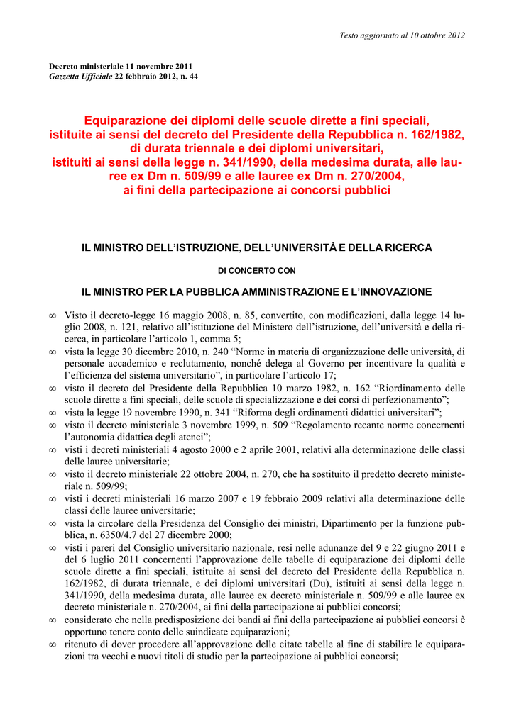 Testo aggiornato al 10 ottobre 2012 Decreto ministeriale 11 novembre 2011 Gazzetta Ufficiale 22 febbraio 2012, n. 44 Equiparazione dei diplomi delle scuole dirette a fini speciali, istituite ai sensi del decreto del Presidente della Repubblica n. 162/1982, di durata triennale e dei diplomi universitari, istituiti ai sensi della legge n. 341/1990, della medesima durata, alle lauree ex Dm n. 509/99 e alle lauree ex Dm n. 270/2004, ai fini della partecipazione ai concorsi pubblici IL MINISTRO DELL’ISTRUZIONE, DELL’UNIVERSITÀ E DELLA RICERCA DI CONCERTO CON IL MINISTRO PER LA PUBBLICA AMMINISTRAZIONE E L’INNOVAZIONE • • • • • • • • • • • • Visto il decreto-legge 16 maggio 2008, n. 85, convertito, con modificazioni, dalla legge 14 luglio 2008, n. 121, relativo all’istituzione del Ministero dell’istruzione, dell’università e della ricerca, in particolare l’articolo 1, comma 5; vista la legge 30 dicembre 2010, n. 240 “Norme in materia di organizzazione delle università, di personale accademico e reclutamento, nonché delega al Governo per incentivare la qualità e l’efficienza del sistema universitario”, in particolare l’articolo 17; visto il decreto del Presidente della Repubblica 10 marzo 1982, n. 162 “Riordinamento delle scuole dirette a fini speciali, delle scuole di specializzazione e dei corsi di perfezionamento”; vista la legge 19 novembre 1990, n. 341 “Riforma degli ordinamenti didattici universitari”; visto il decreto ministeriale 3 novembre 1999, n. 509 “Regolamento recante norme concernenti l’autonomia didattica degli atenei”; visti i decreti ministeriali 4 agosto 2000 e 2 aprile 2001, relativi alla determinazione delle classi delle lauree universitarie; visto il decreto ministeriale 22 ottobre 2004, n. 270, che ha sostituito il predetto decreto ministeriale n. 509/99; visti i decreti ministeriali 16 marzo 2007 e 19 febbraio 2009 relativi alla determinazione delle classi delle lauree universitarie; vista la circolare della Presidenza del Consiglio dei ministri, Dipartimento per la funzione pubblica, n. 6350/4.7 del 27 dicembre 2000; visti i pareri del Consiglio universitario nazionale, resi nelle adunanze del 9 e 22 giugno 2011 e del 6 luglio 2011 concernenti l’approvazione delle tabelle di equiparazione dei diplomi delle scuole dirette a fini speciali, istituite ai sensi del decreto del Presidente della Repubblica n. 162/1982, di durata triennale, e dei diplomi universitari (Du), istituiti ai sensi della legge n. 341/1990, della medesima durata, alle lauree ex decreto ministeriale n. 509/99 e alle lauree ex decreto ministeriale n. 270/2004, ai fini della partecipazione ai pubblici concorsi; considerato che nella predisposizione dei bandi ai fini della partecipazione ai pubblici concorsi è opportuno tenere conto delle suindicate equiparazioni; ritenuto di dover procedere all’approvazione delle citate tabelle al fine di stabilire le equiparazioni tra vecchi e nuovi titoli di studio per la partecipazione ai pubblici concorsi; DECRETA: Articolo 1 I diplomi delle scuole dirette a fini speciali istituite ai sensi del decreto del Presidente della Repubblica 10 marzo 1982, n. 162, riconosciuti al termine di un corso di durata triennale, e i diplomi universitari istituiti ai sensi della legge 19 novembre 1990, n. 341, della medesima durata, sono equiparati alle lauree universitarie delle classi di cui ai decreti ministeriali 4 agosto 2000 e 2 aprile 2001 e alle lauree universitarie delle classi di cui ai decreti ministeriali 16 marzo 2007 e 19 febbraio 2009 ai fini della partecipazione ai pubblici concorsi, secondo le tabelle allegate che fanno parte integrante del presente decreto. Articolo 2 I possessori di diplomi di cui all’articolo 1 del presente decreto afferenti all’area sanitaria, privi di valore abilitante, ai fini dell’equiparazione di cui al predetto articolo 1, devono integrare l’esame finale con la prova scritta e la prova pratica, come previsto dall’articolo 4 del decreto interministeriale del 24 luglio 1996, salvo il caso in cui gli stessi diplomi rientrino tra quelli dichiarati equipollenti dai decreti del Ministro della sanità di concerto con il Ministro dell’università e della ricerca scientifica e tecnologica del 27 luglio 2000. Il presente decreto sarà inviato ai competenti organi di controllo e sarà pubblicato nella Gazzetta Ufficiale della Repubblica italiana. ALLEGATO Tabella 1 - Equiparazioni tra Diplomi delle Scuole dirette a fini speciali Dpr n. 162/1982, Lauree delle classi Dm n. 509/1999 e Lauree delle classi Dm n. 270/2004 DIPLOMI (Dpr 162/1982) LAUREE DELLA CLASSE (Dm 509/1999) LAUREE DELLA CLASSE (Dm 270/2004) Archivistica 13 Scienze dei beni culturali L-01 Beni culturali Assistente sociale 06 Scienze del servizio sociale L-39 Servizio sociale Costume e moda 23 Scienze e tecnologie delle arti figurative, della musica, dello spettacolo e della moda L-03 Discipline delle arti figurative, della musica, dello spettacolo e della moda Esperto in tecnologie tessili 10 Ingegneria industriale L-09 Ingegneria industriale Informatica (didattica a distanza) 26 Scienze e tecnologie informatiche L-31 Scienze e tecnologie Informatiche Logopedista SNT/02 Professioni sanitarie della riabilitazione L/SNT2 Professioni sanitarie della riabilitazione Operatori tecnico-scientifici per i Beni culturali ed ambientali - Settore archeologico 41 Tecnologie per la conservazione e il restauro dei beni culturali L-43 Tecnologie per la conservazione e il restauro dei beni culturali Ortottista/i-assistente/i in oftalmologia SNT/02 Professioni sanitarie della riabilitazione L/SNT2 Professioni sanitarie della riabilitazione Progettista per la nautica da diporto 10 Ingegneria industriale L-09 Ingegneria industriale Relazioni pubbliche 14 Scienze della comunicazione L-20 Scienze della comunicazione Rilevamento e rappresentazione dei beni architettonici 04 Scienze dell’architettura e dell’ingegneria edile L-17 
