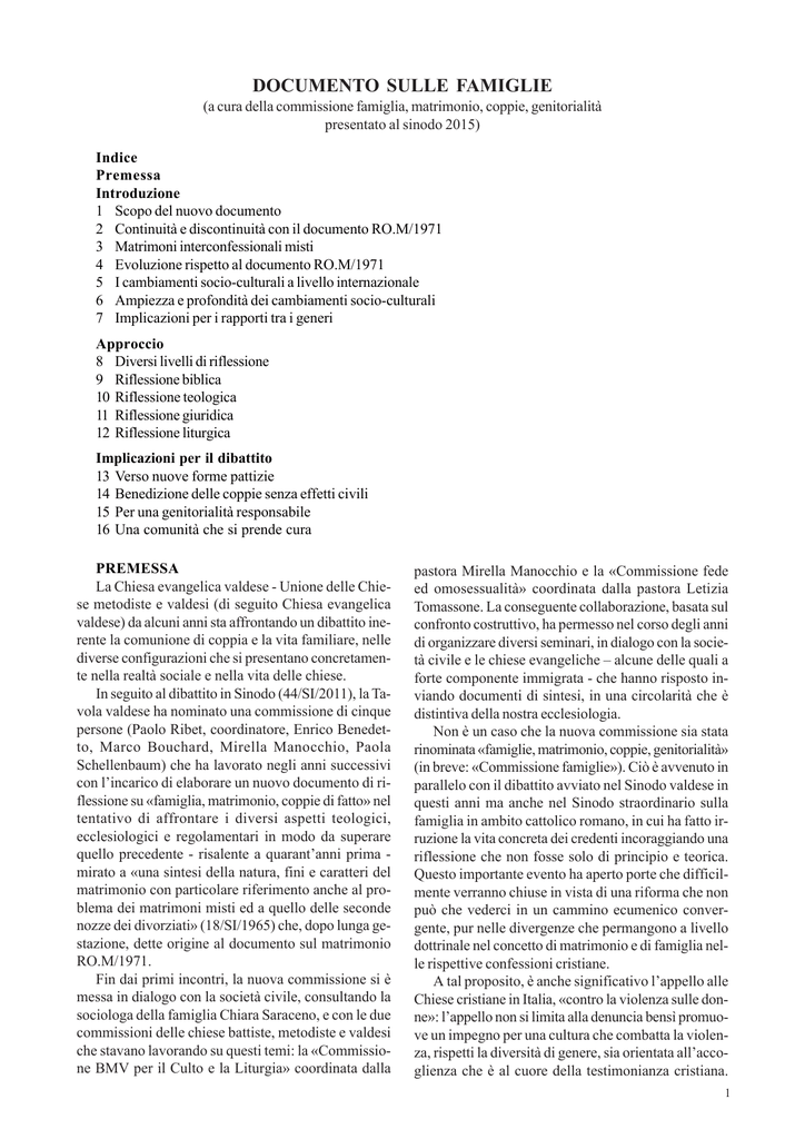 DOCUMENTO SULLE FAMIGLIE (a cura della commissione famiglia, matrimonio, coppie, genitorialità presentato al sinodo 2015) Indice Premessa Introduzione 1 Scopo del nuovo documento 2 Continuità e discontinuità con il documento RO.M/1971 3 Matrimoni interconfessionali misti 4 Evoluzione rispetto al documento RO.M/1971 5 I cambiamenti socio-culturali a livello internazionale 6 Ampiezza e profondità dei cambiamenti socio-culturali 7 Implicazioni per i rapporti tra i generi Approccio 8 Diversi livelli di riflessione 9 Riflessione biblica 10 Riflessione teologica 11 Riflessione giuridica 12 Riflessione liturgica Implicazioni per il dibattito 13 Verso nuove forme pattizie 14 Benedizione delle coppie senza effetti civili 15 Per una genitorialità responsabile 16 Una comunità che si prende cura PREMESSA La Chiesa evangelica valdese - Unione delle Chiese metodiste e valdesi (di seguito Chiesa evangelica valdese) da alcuni anni sta affrontando un dibattito inerente la comunione di coppia e la vita familiare, nelle diverse configurazioni che si presentano concretamente nella realtà sociale e nella vita delle chiese. In seguito al dibattito in Sinodo (44/SI/2011), la Tavola valdese ha nominato una commissione di cinque persone (Paolo Ribet, coordinatore, Enrico Benedetto, Marco Bouchard, Mirella Manocchio, Paola Schellenbaum) che ha lavorato negli anni successivi con l’incarico di elaborare un nuovo documento di riflessione su «famiglia, matrimonio, coppie di fatto» nel tentativo di affrontare i diversi aspetti teologici, ecclesiologici e regolamentari in modo da superare quello precedente - risalente a quarant’anni prima mirato a «una sintesi della natura, fini e caratteri del matrimonio con particolare riferimento anche al problema dei matrimoni misti ed a quello delle seconde nozze dei divorziati» (18/SI/1965) che, dopo lunga gestazione, dette origine al documento sul matrimonio RO.M/1971. Fin dai primi incontri, la nuova commissione si è messa in dialogo con la società civile, consultando la sociologa della famiglia Chiara Saraceno, e con le due commissioni delle chiese battiste, metodiste e valdesi che stavano lavorando su questi temi: la «Commissione BMV per il Culto e la Liturgia» coordinata dalla pastora Mirella Manocchio e la «Commissione fede ed omosessualità» coordinata dalla pastora Letizia Tomassone. La conseguente collaborazione, basata sul confronto costruttivo, ha permesso nel corso degli anni di organizzare diversi seminari, in dialogo con la società civile e le chiese evangeliche – alcune delle quali a forte componente immigrata - che hanno risposto inviando documenti di sintesi, in una circolarità che è distintiva della nostra ecclesiologia. Non è un caso che la nuova commissione sia stata rinominata «famiglie, matrimonio, coppie, genitorialità» (in breve: «Commissione famiglie»). Ciò è avvenuto in parallelo con il dibattito avviato nel Sinodo valdese in questi anni ma anche nel Sinodo straordinario sulla famiglia in ambito cattolico romano, in cui ha fatto irruzione la vita concreta dei credenti incoraggiando una riflessione che non fosse solo di principio e teorica. Questo importante evento ha aperto porte che difficilmente verranno chiuse in vista di una riforma che non può che vederci in un cammino ecumenico convergente, pur nelle divergenze che permangono a livello dottrinale nel concetto di matrimonio e di famiglia nelle rispettive confessioni cristiane. A tal proposito, è anche significativo l’appello alle Chiese cristiane in Italia, «contro la violenza sulle donne»: l’appello non si limita alla denuncia bensì promuove un impegno per una cultura che combatta la violenza, rispetti la diversità di genere, sia orientata all’accoglienza che è al cuore della testimonianza cristiana. 1 Anche in questo caso, si è riscontrata una sostanziale convergenza da parte di Chiese cristiane che hanno approcci diversi al tema della famiglia1. È possibile che modi diversi di vivere la famiglia convivano in una società e in un dato momento storico? Le trasformazioni familiari hanno subìto un’accelerazione negli ultimi decenni: la famiglia presunta «naturale» è in realtà regolata dallo Stato che definisce per legge quali vincoli affettivi possano dirsi famiglia, ma non bisogna dimenticare che la legislazione è influenzata dai cambiamenti socio-culturali. Oltre alle leggi, lo Stato interviene a modellare la famiglia anche attraverso le politiche sociali sempre più impoverite da un sistema di welfare ridotto ai minimi termini con un aggravio per quelle famiglie che si devono fare carico di soggetti deboli o con scarsa autonomia. In sintesi, la famiglia è un costrutto sociale e culturale inserito nella storia ed in divenire, non un concetto atemporale. Il protestantesimo invita a concepire ogni famiglia come un nucleo di esistenze imperniate sulla vocazione, sulla formazione di un legame duraturo e sull’alleanza di grazia con Dio. Le nuove forme di famiglia sono a volte percepite come una messa in crisi della cosiddetta «famiglia tradizionale», in realtà possono essere un contributo alla riflessione sulla vocazione dei/ delle credenti: si creano così le condizioni per vivere tutte le forme di famiglia in modo cristiano, senza però «cristianizzarle» ma mantenendo quella distanza critica che consente di relativizzare ogni forma di famiglia. INTRODUZIONE 1-Scopo del nuovo documento. Il nuovo documento tenta di allargare l’orizzonte sul modo plurale di «fare famiglia», rivolgendo l’attenzione non solo alla cosiddetta «famiglia tradizionale» fondata sul matrimonio ma anche ad altre forme di convivenza duratura, alle seconde nozze, alle famiglie immigrate, alla genitorialità nelle sue diverse articolazioni quali la monogenitorialità, la genitorialità sociale nei casi di famiglie ricomposte o adottive, la cura di soggetti deboli o non completamente autonomi, la convivenza di più generazioni. Tali fenomeni sono presenti nella n