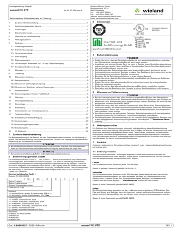 Montageanleitung (Original) sensorPRO STS Art.Nr. R1.400.xxxx.0 Berührungsloser Sicherheitsschalter mit Codierung 1 Zu dieser Betriebsanleitung ......................................................................................... 1 2 Bestimmungsgemäßer Einsatz .................................................................................... 1 3 Zulassungen ............................................................................................................... 1 4 Sicherheitshinweise .................................................................................................... 1 5 Warnung vor Fehlanwendung ..................................................................................... 1 6 Haftungsauschluss...................................................................................................... 1 7 Wieland Electric GmbH Brennerstrasse 10-14 96052 Bamberg Tel.: +49 (951) 9324-0 Fax: +49 (951) 9324-198 Internet: www.wieland-electric.com Email: [email protected] 3 Zulassungen [Proximity Switch] E477003 Testmedien: - Destilliertes Wasser - P3 topax66 - P3 topactive 200 - P3 topax 52 - P3 topax 990 Funktion ..................................................................................................................... 1 7.1 Codierungsvarianten ................................................................................................... 1 7.2 Sicherheitsausgänge ................................................................................................... 2 7.3 Sicherheitseingänge.................................................................................................... 2 7.4 EDM-Eingang ............................................................................................................. 2 7.5 Diagnoseausgang ....................................................................................................... 2 7.6 LED Anzeigen, Blinkcodes und Taktung Diagnoseausgang.......................................... 2 7.7 Grenzbereichsüberwachung........................................................................................ 2 8 Montage ..................................................................................................................... 2 9 Justierung................................................................................................................... 2 10 Elektrischer Anschluss ................................................................................................ 3 10.1 Reihenschaltung ......................................................................................................... 3 10.2 Hinweis zur Spannungsversorgung ............................................................................. 3 10.3 Hinweis zum Betrieb an sicheren Steuerungen............................................................ 3 11 Inbetriebnahme........................................................................................................... 3 11.1 Einlernvorgang bei Variante "Vollcodiert" .................................................................... 3 12 Wartung ..................................................................................................................... 3 13 Störungsbeseitigung ................................................................................................... 3 14 Demontage ................................................................................................................. 3 15 Entsorgung ................................................................................................................. 3 16 Informationen zum Herstellungsdatum ....................................................................... 3 17 Technische Daten……………………………………………………………………………….17 17.1 Schaltbild und Kontaktbelegung……………………………………………………………...20 17.2 Abmessungen…………………………………………………………………………………...20 17.3 Ansteuerungsmöglichkeiten……………………………………………………………….….21 17.4 Schaltbeispiele………………………………………..…………………………………………22 18 1 CE-Erklärung…………………………………………………………………………...………..24 Zu dieser Betriebsanleitung Die Betriebsanleitung ist der Person, die den Sicherheitsschalter installiert, zur Verfügung zu stellen. Die Betriebsanleitung ist in einem leserlichen Zustand und zugänglich aufzubewahren. Bedeutung der verwendeten Symbolik: (geprüft nach ECOLAB-Standard) 4 Sicherheitshinweise VORSICHT • Stellen Sie sicher, dass die Sicherheitsschalter nur von speziell ausgebildetem, autorisiertem Fachpersonal montiert und in Betrieb genommen werden. • Installieren und nehmen Sie das Gerät nur dann in Betrieb, wenn Sie die Betriebsanleitung gelesen und verstanden haben und Sie mit den geltenden Vorschriften über Arbeitssicherheit und Unfallverhütung vertraut sind. • Die Betätigung des Sicherheitsschalters darf ausschließlich durch den korrekt an der Schutzeinrichtung montierten Betätiger erfolgen. Eine Betätigung durch einen nicht an der Schutzeinrichtung montierten Betätiger ist verboten. • Betreiben Sie die Sicherheitsschalter nur in unversehrtem Zustand. • Stellen Sie sicher, dass die Sicherheitsschalter ausschließlich zum Schutz vor Gefährdungen eingesetzt werden. • Stellen Sie sicher, dass alle geltenden Sicherheitsbestimmungen der entsprechenden Maschine eingehalten werden. • Stellen Sie sicher, dass alle geltenden Gesetze und Richtlinien eingehalten werden. • Restrisiken sind bei Beachtung aller Hinweise in dieser Betriebsanleitung nicht bekannt. 5 Warnung vor Fehlanwendung VORSICHT • Bei nicht sachgerechtem oder nicht bestimmungsgemäßem Einsatz oder Manipulation können durch den Einsa