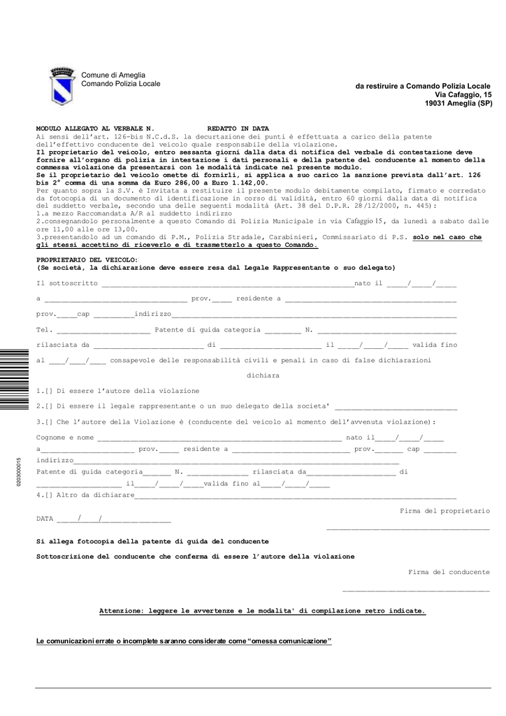 Ë!!9!!!8!Ì Comune di Ameglia Corpo Intercomunale di Polizia Locale di Sarzana Ameglia Comune di Ameglia Distaccamento di Ameglia Comando Polizia Locale 0000240000002300 da restiruire a Comando Polizia Locale Via Cafaggio, 15 Da restituire al Comando Distaccamento di AMEGLIA 19031 Ameglia (SP) Via Maestà 30 19031 AMEGLIA Tel. 0187-609262 0187-609263 MODULO ALLEGATO AL VERBALE N. 1021/2015/V REDATTO IN DATA 22/03/2015 Ai sensi dell’art. 126-bis N.C.d.S. la decurtazione dei punti è effettuata a carico della patente dell’effettivo conducente del veicolo quale responsabile della violazione. Il proprietario del veicolo, entro sessanta giorni dalla data di notifica del verbale di contestazione deve fornire all’organo di polizia in intestazione i dati personali e della patente del conducente al momento della commessa violazione da presentarsi con le modalità indicate nel presente modulo. Se il proprietario del veicolo omette di fornirli, si applica a suo carico la sanzione prevista dall’art. 126 bis 2° comma di una somma da Euro 286,00 a Euro 1.142,00. Per quanto sopra la S.V. è Invitata a restituire il presente modulo debitamente compilato, firmato e corredato da fotocopia di un documento dl identificazione in corso di validità, entro 60 giorni dalla data di notifica del suddetto verbale, secondo una delle seguenti modalità (Art. 38 del D.P.R. 28 /12/2000, n. 445): 1.a mezzo Raccomandata A/R al suddetto indirizzo 2.consegnandolo personalmente a questo Comando di Polizia Municipale in via Cafaggio Maestà 30, 15 da lunedì a sabato dalle ore 11,00 alle ore 13,00. 3.presentandolo ad un comando di P.M., Polizia Str adale, Carabinieri, Commissariato di P.S. solo nel caso che gli stessi accettino di riceverlo e di trasmetterlo a questo Comando. PROPRIETARIO DEL VEICOLO:ROSSETTI PIETRO FRANCESCO (Se società, la dichiarazione deve essere resa dal Legale Rappresentante o suo delegato) Il sottoscritto ______________________________________________________________nato il _____/_____/_____ a ___________________________________ prov._____ residente a __________________________________________ prov._____cap __________indirizzo______________________________________________________________________ Ë#$!!0Ì Tel. _______________________ Patente di guida categoria _________ N. __________________________________ rilasciata da ___________________________ di _________________________ il _____/_____/_____ valida fino al ____/____/____ consapevole delle responsabilità civili e penali in caso di false dichiarazioni dichiara 1.[] Di essere l’autore della violazione 2.[] Di essere il legale rappresentante o un suo delegato della societa' ______________________________ 3.[] Che l’autore della Violazione è (conducente del veicolo al momento dell’avvenuta violazione): Cognome e nome ____________________________________________________________ nato il_____/_____/_____ 0203000015 a_______________________ prov._____ residente a _____________________________ prov._______ cap ________ indirizzo________________________________________________________________________________ Patente di guida categoria_______ N. _______________ rilasciata da______________________ di _____________________ il_____/_____/_____valida fino al_____/_____/_____ 4.[] Altro da dichiarare_______________________________________________________________________________ Firma del proprietario DATA ____________________________ / / ________________________________________ Si allega fotocopia della patente di guida del conducente Sottoscrizione del conducente che conferma di essere l’autore della violazione Firma del conducente ____________________________________ Attenzione: leggere le avvertenze e le modalita' di compilazione retro indicate. Le comunicazioni errate o incomplete saranno considerate come “omessa comunicazione” Pagina 3 del v erbale N.1021/2015/V Pr. 1352/2015/V DEL 22/03/2015 Comunicaz ione obbligatoria per la decurtazione dei punti dalla patente In riferimento al verbale, di cui il presente atto costituisce parte integrante, si comunica che la violazione in esso accertata comporta la decurtazione dei punti sulla patente di guida a carico del conducente del veicolo come indicato a verbale. Per le patenti ril asciate successivamente al 1° ottobre 2003 a soggetti che non siano già titolari di altra patente di categoria B o superiore, i punti per ogni singola violazione, sono raddoppiati qualora le violazioni siano commesse entro i primi tre anni dal rilascio. Qualora vengan o accertate contemporaneamente più violazioni, possono essere decurtati un massimo di quindici punti. Tali disposizioni non si applicano nei casi in cui è prevista la sospensione o la revoca della patente. Pertanto ai sensi dell’art. 126-bis C.d.S. la decurtazione dei punti è effettuata a carico della patente dell’effettivo conducente del veicolo quale responsabile della violazione. Il proprietario del veicolo o altro responsabile in solido ai sensi dell’art.196 del C.d.S, sia esso persona fisica o giuridica, è tenuto a fornire all’organo di polizia che procede, entro 60 giorni dalla notifica del presente verbale, i dati personali e quelli della patente di guida del conducente del veicolo stesso al momento della commessa violazione. In caso di omissione, o comunicazione incompleta o tardiva o comunque insuffici ente, sarà soggetto alla san zione prevista dall’ art. 126/bis comma 2 del codice della strada (secondo gli importi attualmente in vigore). Ai sensi dell’ articolo 219 bis C.d.S, si applicano, altresì, le disposizioni dell’articolo 126 bis anche ai conducenti maggiorenni muniti d i certificato di idoneità alla guida (CIGC). Ai sensi dell’ art 23 commi 1 e 2 del D.L.vo 286/2005 la decurtazione punti si app lica alla Carta di Qualificazione del Conducente (CQC trasporto cose o persone) ovvero il C.A.P. di tipo KB (anziché la patente d i guida), se la violazione è stata commessa alla guida di un autoveicolo per cui l