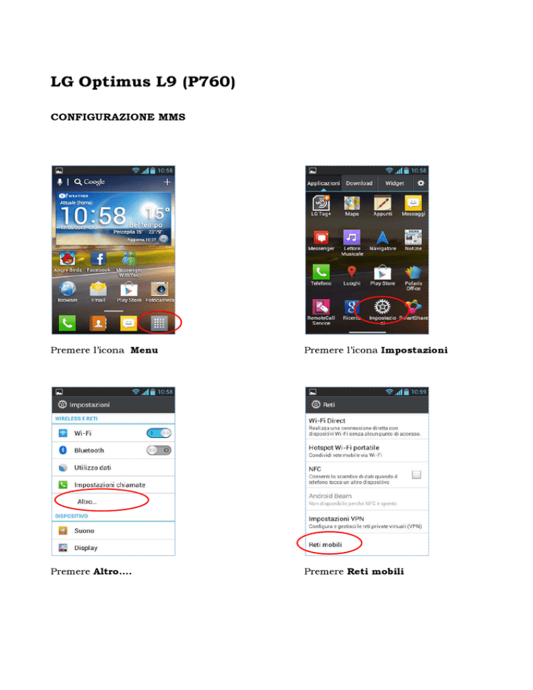 LG Optimus L9 (P760) CONFIGURAZIONE MMS Premere l’icona Menu Premere l’icona Impostazioni Premere Altro…. Premere Reti mobili Premere Nomi punti di accesso Se è presente MMS WIND verificare l’esattezza dei dati come da figure 2a,3a e 4a ; altrimenti seguire le istruzioni come da esempio fig. 1a) , 2a),3a) ,4a) e 5a). 1a)Premere Menu e di seguito Nuovo APN 2a) Nome: MMS WIND APN: mms.wind 3a) MMSC: http://mms.wind.it Proxy MMS: 212.245.244.100 Porta MMS: 8080 4a) Tipo APN: mms 5a) Dopo aver premuto l’icona Menu selezionare Salva A questo punto il terminale è configurato per l’utilizzo del profilo MMS WIND.