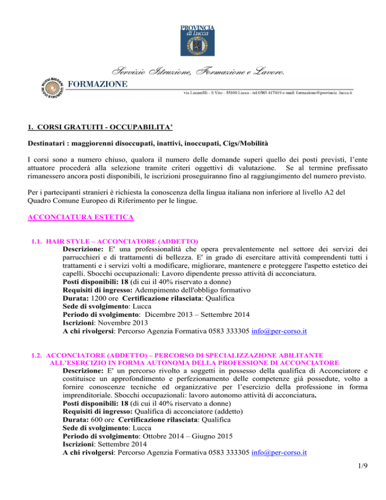 Servizio Istruzione, Formazione e Lavoro. 1. CORSI GRATUITI - OCCUPABILITA’ Destinatari : maggiorenni disoccupati, inattivi, inoccupati, Cigs/Mobilità I corsi sono a numero chiuso, qualora il numero delle domande superi quello dei posti previsti, l’ente attuatore procederà alla selezione tramite criteri oggettivi di valutazione. Se al termine prefissato rimanessero ancora posti disponibili, le iscrizioni proseguiranno fino al raggiungimento del numero previsto. Per i partecipanti stranieri è richiesta la conoscenza della lingua italiana non inferiore al livello A2 del Quadro Comune Europeo di Riferimento per le lingue. ACCONCIATURA ESTETICA 1.1. HAIR STYLE – ACCONCIATORE (ADDETTO) Descrizione: E' una professionalità che opera prevalentemente nel settore dei servizi dei parrucchieri e di trattamenti di bellezza. E' in grado di esercitare attività comprendenti tutti i trattamenti e i servizi volti a modificare, migliorare, mantenere e proteggere l'aspetto estetico dei capelli. Sbocchi occupazionali: Lavoro dipendente presso attività di acconciatura. Posti disponibili: 18 (di cui il 40% riservato a donne) Requisiti di ingresso: Adempimento dell'obbligo formativo Durata: 1200 ore Certificazione rilasciata: Qualifica Sede di svolgimento: Lucca Periodo di svolgimento: Dicembre 2013 – Settembre 2014 Iscrizioni: Novembre 2013 A chi rivolgersi: Percorso Agenzia Formativa 0583 333305 [email protected] 1.2. ACCONCIATORE (ADDETTO) – PERCORSO DI SPECIALIZZAZIONE ABILITANTE ALL’ESERCIZIO IN FORMA AUTONOMA DELLA PROFESSIONE DI ACCONCIATORE Descrizione: E' un percorso rivolto a soggetti in possesso della qualifica di Acconciatore e costituisce un approfondimento e perfezionamento delle competenze già possedute, volto a fornire conoscenze tecniche ed organizzative per l’esercizio della professione in forma imprenditoriale. Sbocchi occupazionali: lavoro autonomo attività di acconciatura. Posti disponibili: 18 (di cui il 40% riservato a donne) Requisiti di ingresso: Qualifica di acconciatore (addetto) Durata: 600 ore Certificazione rilasciata: Qualifica Sede di svolgimento: Lucca Periodo di svolgimento: Ottobre 2014 – Giugno 2015 Iscrizioni: Settembre 2014 A chi rivolgersi: Percorso Agenzia Formativa 0583 333305 [email protected] 1/9 1.3. SLOW BEATY – ESTETISTA (ADDETTO) Descrizione: E’ una professionalità che si occupa di trattamenti estetici sulla superficie del corpo volti alla eliminazione e/o attenuazione degli inestetismi, utilizzando tecniche manuali ed apparecchi elettromeccanici per uso estetico, con una intera unità formativa rivolta all’analisi e utilizzo di prodotti biologici. Sbocchi occupazionali: Lavoro dipendente presso centri di estetica. Posti disponibili: 18 (di cui il 90% riservato a donne) Requisiti di ingresso: Adempimento dell'obbligo formativo Durata: 1800 ore Certificazione rilasciata: Qualifica Sede di svolgimento: Barga (LU ) e Castenuovo G.na. Periodo di svolgimento: Novembre 2013 – Ottobre 2015 Iscrizioni: Novembre 2013 (Scadenza 15 Novembre 2013) A chi rivolgersi: CSA Centri Servizi per l’Artigianato – 0583 4301114 [email protected] AGRICOLTURA 1.4. AGRI–COM - FORMAZIONE PER LA TRASFORMAZIONE E COMMERCIALIZZAZIONE DEI PRODOTTI AGRICOLI Descrizione: Il progetto si rivolge ad un’utenza esclusivamente femminile, prevede di formare 12 donne, fornendo loro le competenze professionali principali per il trattamento e la commercializzazione dei prodotti agricoli (incluso il pescato). Le allieve saranno formate su competenze fortemente mancanti sul territorio che valorizzino le tipicità e la filiera corta in un ottica di sviluppo sostenibile. Posti disponibili: 12 (di cui il 100% riservato a donne) Requisiti di ingresso: Donne maggiorenni Durata: 150 ore Certificazione rilasciata: Attestato di frequenza Sede di svolgimento: Viareggio (LU) Periodo di svolgimento: Gennaio 2014 – Aprile 2014 Iscrizioni : Novembre 2013 (Scadenza 25 Novembre 2013) A chi rivolgersi: Ial Toscana 0583 508811 - 055 3215240 [email protected] INDUSTRIA ALBERGHIERA E RISTORAZIONE 1.5. ADDETTO ALL’APPROVVIGIONAMENTO DELLA CUCINA, CONSERVAZIONE E TRATTAMENTO DELLE MATERIE PRIME E ALLA PREPARAZIONE DEI PASTI Descrizione: Una figura che opera in aziende della ristorazione commerciale e collettiva. Si occupa di acquistare, ricevere e controllare la merce e i cibi freschi, di collaborare alla preparazione di piatti semplici, a supporto dell'attività del cuoco, di preparare semilavorati trattando le materie prime necessarie alla preparazione dei piatti. Si occupa inoltre della gestione della dispensa, della cura di ambienti, macchinari, attrezzature ed utensili della cucina. Posti disponibili: 15 (di cui il 40% riservato a donne) Requisiti d’ingresso: Adempimento dell'obbligo formativo. Durata: 900 ore Certificazione rilasciata: Qualifica Sede di svolgimento: Pietrasanta (LU) Periodo di svolgimento: Novembre 2013 – Giugno 2014 Iscrizioni: Ottobre - Novembre 2013 ( Scadenza 11 Novembre 2013) A chi rivolgersi: Versilia Format 0584 791455 [email protected] 2/9 1.6. GOURMET - ADDETTO ALL’APPROVVIGIONAMENTO DELLA CUCINA, CONSERVAZIONE E TRATTAMENTO DELLE MATERIE PRIME E ALLA PREPARAZIONE E DISTRIBUZIONE DI PIETANZE E BEVANDE Descrizione: Il progetto forma una figura professionale del Repertorio Regionale che svolge la funzione di raccordo tra la cucina e la sala, con la possibilità di essere impiegato sia nella parte della preparazione di cibi e bevande, che nella fase di servizio dei medesimi: da un lato dunque collabora con lo staff della cucina, dall’altro si rapporta direttamente con la clientela. Posti disponibili: 15 ( di cui il 50% riservato a donne e il 20% a soggetti svantaggiati) Requisiti d’ingresso: Adempimento dell'obbligo formativo Durata: 900 ore Certificazione rilasciata: Qualifica Sede di svolgimento: Lido di Camaiore (LU) Periodo di svolgimento: Dicembre 2013 – Dicembre 2014 Iscrizioni: Novembre 2013 (Scadenza 18 Novembre 2013) A chi rivolgersi: Ce