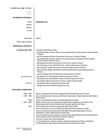 CURRICULUM VITAE INFORMAZIONI PERSONALI Nome GORRONE LUCA Indirizzo Telefono E-mail Nazionalità Italiana Data e luogo di nascita ESPERIENZA LAVORATIVA • dal 29 dicembre 1984 (dal 2000 al 2010) (dal 2014) Funzionario della Polizia di Stato • già Responsabile di Nucleo, Ufficio corsi e programmazione e Mensa presso il Reparto Mobile di Napoli • già Vice dirigente del Nucleo Prevenzione Crimine per la Campania (Napoli) • già Responsabile di Nucleo, Ufficio corsi e programmazione e Reparto Soccorso Pubblico presso il Reparto Mobile di Firenze • già Dirigente del Nucleo Prevenzione Crimine per la Toscana (Firenze) • già Funzionario di turno all’UPG-SP (le cd. “volanti”) della Questura di Firenze • già Funzionario addetto alla Divisione Anticrimine della Questura di Firenze • già Funzionario addetto alla Divisione Polizia Amministrativa e Sociale della Questura di Firenze • già Vice Dirigente del Commissariato di Empoli Questura di Firenze • già Dirigente del Commissariato di Oltrarno Questura di Firenze • già Dirigente del Commissariato di Sesto Fiorentino Questura di Firenze • già Dirigente Ufficio del personale e Tecnico Logistico Questura Prato • già Dirigente Ufficio Immigrazione Questura Prato • Dirigente Divisione Anticrimine Questura di Lucca ISTRUZIONE E FORMAZIONE • 1982 - 1984 • 1984 - 1989 • 1996 • 2007 - 2008 Altro Pagina 1 - Curriculum vitae di GORRONE Luca Biennio di Ingegneria alla Facoltà di Ingegneria dell’Università degli studi di Firenze Corso di formazione per funzionari della Polizia di Stato presso l’Istituto Superiore della Polizia di Stato di Roma Laurea in Giurisprudenza presso l’Università degli Studi di Catania Master di primo livello per il coordinamento delle attività di protezione civile presso il Polo Biotecnologico della Facoltà di Medicina dell’Università degli Studi di Firenze Corso propedeutico alla carriera dirigenziale della Polizia di Stato Corso di formazione ai servizi di Polizia Scientifica della Polizia di Stato per direttivi Corso di formazione per qualificati alla Difesa NBCR (Nucleare Batteriologica Chimica e Radiologica) e relativo aggiornamento quinquennale Corso di formazione per le procedure di riconoscimento della protezione internazionale presso la Scuola Superiore dell’Amministrazione dell’Interno (Roma) Corso per l’accesso alla carriera dirigenziale 5° ciclo del Seminario “Violenza di genere” della Scuola Superiore di Polizia e del Servizio Centrale Operativo della Direzione Centrale Anticrimine della polizia di Stato CAPACITÀ E COMPETENZE PERSONALI MADRELINGUA ITALIANO ALTRE LINGUE INGLESE CAPACITÀ E COMPETENZE ORGANIZZATIVE CAPACITÀ E COMPETENZE : Livello Specialist presso Berlitz School • già Socio fondatore dell’Associazione musicale “Black&White Ensemble” di Prato • già Socio fondatore dell’Associazione musicale “Vocimania” di Firenze • già Collaboratore del sito “www.salaoperativa.it ” di Protezione Civile (zona FI-PO) • già Responsabile coordinatore delle attività del “Gruppo operativo per la tutela delle fasce vulnerabili” della Questura di Firenze • già Presidente Probiviri Croce Viola - Pubblica Assistenza Sesto Fiorentino • Presidente dell’Associazione Volontari Italiana Sangue di Sesto Fiorentino (FI) • Vice Presidente della “Filarmonica P.Mascagni” di Iolo (PO) • Consigliere, Coordinatore volontari e Istruttore della Croce Viola - Pubblica Assistenza Sesto Fiorentino • Diploma di programmatore di Computer (anni ’80) TECNICHE CAPACITÀ E COMPETENZE DIDATTICHE Pagina 2 - Curriculum vitae di GORRONE Luca • già Docente per la formazione decentrata della Scuola Superiore dell’Amministrazione dell’Interno (Roma) in materia di immigrazione • già Docente supplente e membro di commissione d’esame per i Corsi di formazione per funzionari della Polizia di Stato presso l’Istituto Superiore della Polizia di Stato di Roma • già Istruttore Croce Rossa Italiana per gli aspetti giuridici e legali del servizio internazionale • già Insegnante di musica e strumento (ance) presso la “Filarmonica P.Mascagni” di Iolo (PO) • Istruttore e formatore area giuridica e area ordine pubblico ai corsi di formazione per Steward (accreditato presso l’Osservatorio Nazionale per le manifestazioni sportive di Roma) • Formatore volontari presso la Croce Viola – Pubblica Assistenza Sesto Fiorentino CONVEGNI E PUBBLICAZIONI RECENTI (10 ANNI) CAPACITÀ E COMPETENZE ARTISTICHE ALTRE CAPACITÀ E COMPETENZE PATENTE O PATENTI • Relatore al Convegno “Minori difficili, dalla devianza all’utilità sociale: proposte operative”, Massa (MS) 28-29 ottobre 2005, organizzato dalla Provincia di Massa-Carrara, Università degli Studi di Firehnze e Associazione nazionale Pedagogisti Toscana • Organizzatore e relatore del Convegno “Bullismo e diversità. L’educazione alla legalità nelle scuole della Toscana”, Seminari della “Festa della Legalità” organizzata dalla Regiona Toscana, Firenze 19 dicembre 2007 • Organizzatore e relatore del Convegno “Reati vigliacchi”, organizzato dal Comune e dalla Questura di Firenze, Firenze 29 aprile 2008 • Relatore del Convegno “Sicurezza e legalità nella società contemporanea”, oranizzato da Confederazione nazionale Artigianato della Toscana e di Firenze, Firenze 28 giugno 2008 • Organizzatore e relatore del Convegno “Vivisicuro- il soccorso integrato: metodologie innovative per l’educazione e la formazione”, organizzato dell’Università degli Studi di Firenze, dall’Agenzia Regionale di Sanità della Toscana e dalla Regione Toscana, Firenze 11 giugno 2009 • Autore di “Crescere in viola”, pubblicato da Le Lettere 2009, scritto con Luciano Artusi e Giuseppe Lefebvre • Relatore al Convegno “NATO advanced trainig course – integrated emergency management for mass casualty emergencies”, organizzato dall’Università degli Studi di