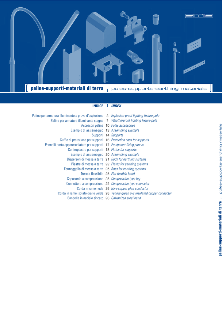 [ paline-supporti-materiali di terra l poles-supports-earthing materials ] 3 7 10 13 14 16 17 18 20 21 22 25 25 25 25 26 26 26 Explosion-proof lighting fixture pole Weatherproof lighting fixture pole Poles accessories Assembling example Supports Protection caps for supports Equipment fixing panels Plates for supports Assembling example Rods for earthing systems Plates for earthing systems Boss for earthing systems Flat flexible braid Compression type lug Compression type connector Bare copper plait conductor Yellow-green pvc insulated copper conductor Galvanized steel band paline-supporti-materiali di terra Paline per armatura illuminante a prova d’esplosione Paline per armatura illuminante stagna Accessori paline Esempio di assiemaggio Supporti Cuffie di protezione per supporti Pannelli porta apparecchiature per supporti Contropiastre per supporti Esempio di assiemaggio Dispersori di messa a terra Piastre di messa a terra Formaggella di messa a terra Treccia flessibile Capocorda a compressione Connettore a compressione Corda in rame nuda Corda in rame isolato giallo verde Bandella in acciaio zincato poles-supports-earthing materials INDICE l INDEX [ paline-supporti-materiali di terra l poles-supports-earthing materials ] [ palina per armatura illuminante a prova d’esplosione | explosion-proof lighting fixture pole ] 2 1 Ø 1.1/2" CODICE | CODE ELEMENTO | ELEMENT 1 1 2 2 Ø 1.1/2" Descr. L PI-64 PI-65 PI-66 PI-67 1050 1650 1050 1650 PES30011 PES30012 PES30013 PES30014 Tubo in acciaio zincato a caldo UNI 7683. Per accessori vedere pagine 10 - 11 - 12. - Pipe UNI 7683 made of hot dip galvanized steel. For accessories see pages 10 - 11 - 12. [ palina per armatura illuminante a prova d’esplosione 600 30° 1900 R500 l explosion-proof lighting fixture pole ] R500 L 30° L 3 [ palina per armatura illuminante a prova d’esplosione | explosion-proof lighting fixture pole 4 180° ° 135 R2 50 R2 50 Ø 1" L L Ø 1" [ palina per armatura illuminante a prova d’esplosione 2000 [“A”] 2000 l explosion-proof lighting fixture pole ] [“A”] 2 1 Ø 1.1/2" CODICE | CODE ELEMENTO | ELEMENT 1 1 2 2 Ø 1.1/2" Descr. L PI-68 PI-69 P I -7 0 P I -7 1 500 700 500 700 PES00053 PES0005 4 PES00055 PES00056 Tubo in acciaio zincato a caldo UNI 7683. Per accessori vedere pagine 10 - 11- 12. - Pipe UNI 7683 made of hot dip galvanized steel. For accessories see pages 10 - 11 - 12 [“A”] Riduzione REM 1.1/2” - 1”. - 1.1/2” - 1” REM reduction . ] [ palina per armatura illuminante a prova d’esplosione | explosion-proof lighting fixture pole ] 30° L Ø1 .1/ 2" R500 600 5 Ø 2.1/2" CODICE | CODE ELEMENTO | ELEMENT Descr. L P I -7 2 P I -7 3 1050 1650 PE T30052 PE T30053 Tubo in acciaio zincato a caldo UNI 7683. Per accessori vedere pagine 10 - 11 - 12. - Pipe UNI 7683 made of hot dip galvanized steel. For accessories see pages 10 - 11 - 12 . [“A”] Riduzione REM 2.1/2” - 1.1/2”. - 2.1/2” - 1.1/2” REM reduction. [“B”] Manicotto Ø 3/4”. - Ø 3/4” coupling. [“C”] Vite M8x25. - M8x25 screw. l explosion-proof lighting fixture pole [“C”] 700 1300 [“B”] [ palina per armatura illuminante a prova d’esplosione 3000 ] [“A”] [ palina per armatura illuminante a prova d’esplosione 180° 135 R2 50 6 | explosion-proof lighting fixture pole ° R2 50 Ø 1" L L Ø 1" [“A”] [ palina per armatura illuminante a prova d’esplosione 3000 3000 700 Ø 2.1/2" 2 2 Ø 2.1/2" CODICE | CODE ELEMENTO | ELEMENT 1 [“C”] 2 1 1 [“B”] [“C”] 700 1300 [“B”] 1300 l explosion-proof lighting fixture pole ] [“A”] Descr. L P I -7 4 P I -7 5 P I -7 6 P I -7 7 500 700 500 700 PE T00055 PE T00056 PE T00057 PE T00058 Tubo in acciaio zincato a caldo UNI 7683. Per accessori vedere pagine 10 - 11 - 12. - Pipe UNI 7683 made of hot dip galvanized steel. For accessories see pages 10 - 11 - 12. [“A”] Riduzione REM 2.1/2” - 1”. - 2.1/2” - 1” REM reduction. [“B”] Manicotto Ø 3/4”. - Ø 3/4” coupling. [“C”] Vite M8x25 - M8x25 screw. ] [ palina per armatura illuminante stagna | weatherproof lighting fixture pole ] [“D”] Ø 1.1/2" 1 2 2 100 [“F”] 2 Ø 1.1/2" CODICE | CODE ELEMENTO | ELEMENT 1 R500 Descr. L PI-5 PI-29 P I -11 PI-6 1050 1650 1050 1650 PSS30001 PSS30004 PSS30003 PSS30002 Tubo in acciaio zincato a caldo. Per accessori vedere pagine 10 - 11 - 12. - Pipe made of hot dip galvanized steel. For accessories see pages 10 - 11 - 12. [“D”] Foro Ø22. - Ø22 hole. [“F”] Arresto palina. - Pole stop. l weatherproof lighting fixture pole [“F”] 1 [“D”] 600 30° 1900 L ] R500 [ palina per armatura illuminante stagna 100 30° L 7 [ palina per armatura illuminante stagna | weatherproof lighting fixture pole 16 50 Ø1 .1/ 2" 100 [“D”] R500 [ palina per armatura illuminante stagna 2450 l weatherproof lighting fixture pole ] 30° 22 5 8 [“F”] Ø 2.1/2" ELEMENTO | ELEMENT CODICE | CODE Descr. PI-3 PSS30051 Tubo in acciaio zincato a caldo. Per accessori vedere pagine 10 - 11 - 12. - Pipe made of hot dip galvanized steel. For accessories see pages 10 - 11 - 12. [“D”] Foro Ø22. - Ø22 hole. [“F”] Arresto palina. - Pole stop. ] [ palina per armatura illuminante stagna | weatherproof lighting fixture pole ] 16 50 Ø1 .1/ 2" [“D”] 100 30° 22 5 9 700 1300 [“E”] Ø 2.1/2" ELEMENTO | ELEMENT CODICE | CODE Descr. PI-2 PST30051 Tubo in acciaio zincato a caldo. Per accessori vedere pagine 10 - 11 - 12. - Pipe made of hot dip galvanized steel. For accessories see pages 10 - 11 - 12. [“D”] Foro Ø22. - Ø22 hole. [“E”] Piastra 40x40x5. - 40x40x5 plate [ palina per armatura illuminante stagna 2700 [“D”] l weatherproof lighting fixture pole ] R500 [ piastre | plates ] 60 60 Ø10 100 ELEMENTO | ELEMENT 6 CODICE | CODE Descr. Materiali / Materials Acciaio zincato a caldo / Hot dip galvanized steel PA000001 AP-1 Adatto per paline tipo - Suitable for poles type: PI-64 - PI-65 - PI-66 - PI-67 - PI-68 - PI-69 - PI-70 - PI-71 - PI-5 - PI-
