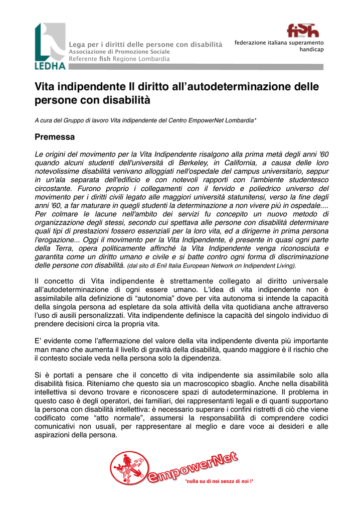 Lega per i diritti delle persone con disabilità Associazione di Promozione Sociale federazione italiana superamento handicap Referente fish Regione Lombardia Vita indipendente Il diritto allʼautodeterminazione delle persone con disabilità A cura del Gruppo di lavoro Vita indipendente del Centro EmpowerNet Lombardia* !"#$%&'&&!()*&+(,&-&.-,-//-&.(00(&+(,123(&423&.-1*5-0-/6& Premessa 722,.-3*8(3/2&9(.(,*/-:2&.-&;;&*1124-*<-23-&=&>23.*/*&3(0&?@A@& & Le origini del movimento per la Vita Indipendente risalgono alla prima metà degli anni '60 Vita indipendente quando alcuni studenti dell'università di Berkeley, in California, a causa delle loro Il diritto all’autodeterminazione delle persone con disabilità notevolissime disabilità venivano alloggiati nell'ospedale del campus universitario, seppur A cura del Gruppo di lavoro Vita indipendente del Centro EmpowerNet Lombardia* in un'ala separata dell'edificio e con notevoli rapporti con l'ambiente studentesco circostante. Furono proprio i collegamenti con il fervido e poliedrico universo del Premessa movimento perdel i diritti civili per legato alle maggiori risalgono università verso Le origini movimento la Vita Indipendente allastatunitensi, prima metà degli annila '60fine degli quando alcuni studenti dell'università di Berkeley, in California, a causa delle loro anni '60, a far maturare in quegli studenti la determinazione a non vivere più in ospedale.... notevolissime disabilità venivano alloggiati nell'ospedale del campus universitario, seppur Per colmare le lacune nell'ambito dei servizi fu concepito un nuovo metodo di in un'ala separata dell'edificio e con notevoli rapporti con l'ambiente studentesco organizzazione stessi, secondo cui spettava persone con disabilità circostante. degli Furono proprio i collegamenti con ilalle fervido e poliedrico universo determinare del movimento per i diritti civili legato alle maggiori università statunitensi, verso lain fine degli persona quali tipi di prestazioni fossero essenziali per la loro vita, ed a dirigerne prima anni '60, aOggi far maturare in quegli studenti la determinazione a non più inin ospedale.... l'erogazione... il movimento per la Vita Indipendente, è vivere presente quasi ogni parte Per colmare le lacune nell'ambito dei servizi fu concepito un nuovo metodo di della organizzazione Terra, opera degli politicamente affinché la Vita Indipendente venga riconosciuta e stessi, secondo cui spettava alle persone con disabilità determinare garantita un diritto fossero umanoessenziali e civile per e si contro ogni forma di persona discriminazione qualicome tipi di prestazioni la batte loro vita, ed a dirigerne in prima l'erogazione... Oggi il movimento la Vita Indipendente, è presente in quasi ogni parte delle persone con disabilità. (dal sitoper di Enil Italia European Network on Indipendent Living). della Terra, opera politicamente affinché la Vita Indipendente venga riconosciuta e garantita di come un diritto umano e civile si batte contro ogni forma di al discriminazione Il concetto Vita indipendente è estrettamente collegato diritto universale delle persone con disabilità. (dal sito di Enil Italia European Network on Indipendent Living). allʼautodeterminazione di ogni essere umano. Lʼidea di vita indipendente non è assimilabile alla definizione di “autonomia” dove per vita autonoma si intende la capacità Il concetto di Vita indipendente è strettamente collegato al diritto universale all’autodeterminazione di ogni essere umano. L’idea vitaquotidiana indipendente non attraverso è della singola persona ad espletare da sola attività delladivita anche assimilabile alla definizione di “autonomia” dove per vita autonoma si intende la capacità lʼuso didella ausili personalizzati. Vita indipendente definisce la capacità del singolo individuo di singola persona ad espletare da sola attività della vita quotidiana anche attraverso prendere decisioni circa la propria vita. l’uso di ausili personalizzati. Vita indipendente definisce la capacità del singolo individuo di prendere decisioni circa la propria vita. Eʼ evidente come lʼaffermazione del valore della vita indipendente diventa più importante E’ evidente come l’affermazione del valore della vita indipendente diventa più importante man mano che aumenta il livello di gravità della disabilità, quando maggiore è il rischio che man mano che aumenta il livello di gravità della disabilità, quando maggiore è il rischio che il contesto sociale veda nella sololaladipendenza. dipendenza. il contesto sociale veda nellapersona persona solo Si è portati a pensareche cheil il concetto concetto didivita sia assimilabile solo allasolo alla Si è portati a pensare vitaindipendente indipendente sia assimilabile disabilità fisica. Riteniamo che questo sia un macroscopico sbaglio. Anche nella disabilità disabilità fisica. Riteniamo che questo sia un macroscopico sbaglio. Anche nella disabilità intellettiva si devono trovare e riconoscere spazi di autodeterminazione. Il problema in intellettiva devono riconoscere di autodeterminazione. Il problema in questosicaso è deglitrovare operatori,e dei familiari, dei spazi rappresentanti legali e di quanti supportano questolacaso è degli operatori, dei familiari, dei rappresentanti supportano persona con disabilità intellettiva: è necessario superare i confinilegali ristrettiedidi ciòquanti che viene codificato come “attointellettiva: normale”, assumersi la responsabilità di comprendere la persona con disabilità è necessario superare i confini ristretti di codici ciò che viene comunicativi non usuali, per rappresentare al meglio e dare voce ai desideri e alle codificato come “atto normale”, assumersi la responsabilità di comprendere codici aspirazioni della persona. comunicativi non usuali, per rappresentare al meglio e dare voce ai desideri e alle aspirazioni della persona. Lega per i diritti delle persone con disabilità Associazione di Prom