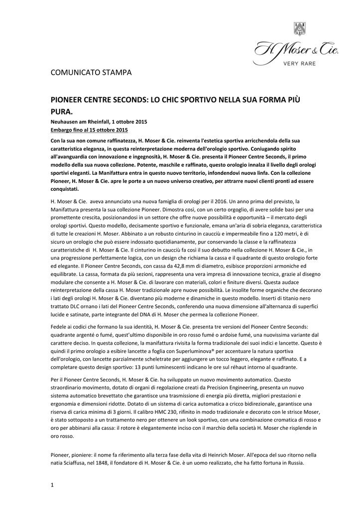 COMUNICATO STAMPA PIONEER CENTRE SECONDS: LO CHIC SPORTIVO NELLA SUA FORMA PIÙ PURA. Neuhausen am Rheinfall, 1 ottobre 2015 Embargo fino al 15 ottobre 2015 Con la sua non comune raffinatezza, H. Moser & Cie. reinventa l'estetica sportiva arricchendola della sua caratteristica eleganza, in questa reinterpretazione moderna dell'orologio sportivo. Coniugando spirito all'avanguardia con innovazione e ingegnosità, H. Moser & Cie. presenta il Pioneer Centre Seconds, il primo modello della sua nuova collezione. Potente, maschile e raffinato, questo orologio innalza il livello degli orologi sportivi eleganti. La Manifattura entra in questo nuovo territorio, infondendovi nuova linfa. Con la collezione Pioneer, H. Moser & Cie. apre le porte a un nuovo universo creativo, per attrarre nuovi clienti pronti ad essere conquistati. H. Moser & Cie. aveva annunciato una nuova famiglia di orologi per il 2016. Un anno prima del previsto, la Manifattura presenta la sua collezione Pioneer. Dimostra così, con un certo orgoglio, di avere solide basi per una promettente crescita, posizionandosi in un settore che offre nuove possibilità e opportunità – il mercato degli orologi sportivi. Questo modello, decisamente sportivo e funzionale, emana un'aria di sobria eleganza, caratteristica di tutte le creazioni H. Moser. Abbinato a un robusto cinturino in caucciù e impermeabile fino a 120 metri, è di sicuro un orologio che può essere indossato quotidianamente, pur conservando la classe e la raffinatezza caratteristiche di H. Moser & Cie. Il cinturino in caucciù fa così il suo debutto nella collezione H. Moser & Cie., in una progressione perfettamente logica, con un design che richiama la cassa e il quadrante di questo orologio forte ed elegante. Il Pioneer Centre Seconds, con cassa da 42,8 mm di diametro, esibisce proporzioni armoniche ed equilibrate. La cassa, formata da più sezioni, rappresenta una vera impresa di innovazione tecnica, grazie al disegno modulare che consente a H. Moser & Cie. di lavorare con materiali, colori e finiture diversi. Questa audace reinterpretazione della cassa H. Moser tradizionale apre nuove possibilità. Le insolite forme organiche che decorano i lati degli orologi H. Moser & Cie. diventano più moderne e dinamiche in questo modello. Inserti di titanio nero trattato DLC ornano i lati del Pioneer Centre Seconds, conferendo una nuova dimensione all'alternanza di superfici lucide e satinate, parte integrante del DNA di H. Moser che permea la collezione Pioneer. Fedele ai codici che formano la sua identità, H. Moser & Cie. presenta tre versioni del Pioneer Centre Seconds: quadrante argenté o fumé, quest’ultimo disponibile in oro rosso fumé o ardoise fumé, una nuovissima variante dal carattere deciso. In questa collezione, la manifattura rivisita la forma tradizionale dei suoi indici e lancette. Questo è quindi il primo orologio a esibire lancette a foglia con Superluminova® per accentuare la natura sportiva dell'orologio, con lancette parzialmente scheletrate per aggiungere un tocco leggero, elegante e raffinato. E a completare questo design sportivo: 13 punti luminescenti indicano le ore sul réhaut intorno al quadrante. Per il Pioneer Centre Seconds, H. Moser & Cie. ha sviluppato un nuovo movimento automatico. Questo straordinario movimento, dotato di organi di regolazione creati da Precision Engineering, presenta un nuovo sistema automatico brevettato che garantisce una trasmissione di energia più diretta, migliori prestazioni e ergonomia e dimensioni ridotte. Dotato di un sistema di carica automatica a cricco bidirezionale, garantisce una riserva di carica minima di 3 giorni. Il calibro HMC 230, rifinito in modo tradizionale e decorato con le strisce Moser, è stato sottoposto a un trattamento nero per ottenere un look sportivo, con una combinazione cromatica di rosso e oro per abbinarsi alla cassa: il rotore è elegantemente inciso con il marchio della società H. Moser che risplende in oro rosso. Pioneer, pioniere: il nome fa riferimento alla terza fase della vita di Heinrich Moser. All'epoca del suo ritorno nella natia Sciaffusa, nel 1848, il fondatore di H. Moser & Cie. è un uomo realizzato, che ha fatto fortuna in Russia. 1 COMUNICATO STAMPA Dimostrando spirito visionario, un'ambizione ben ponderata e un'innegabile ingegnosità, Heinrich Moser si adopera per sviluppare la città in cui è cresciuto, trasformandola in una città industriale all'avanguardia della tecnologia. È quindi lui l'uomo dietro la più grande diga idromeccanica svizzera, che fornisce energia alle industrie della regione e la cui costruzione ha richiesto tre inverni, sotto la direzione dello stesso Heinrich. Nell’intento di stabilire una continuità con il fondatore di H. Moser & Cie., Edouard Meylan e la sua famiglia hanno investito personalmente nella nuova struttura che stavano sviluppando. Ci sono voluti tre anni di duro lavoro per presentare il Pioneer Centre Seconds. Audace e moderno, simbolo di uno spirito pionieristico e avventuroso, con un design deciso che fa riferimento al mondo industriale, il Pioneer Centre Seconds è uno straordinario omaggio all'ultima fase della vita di Heinrich Moser. CARATTERISTICHE TECNICHE Referenza 3230-0900, modello in oro rosso e titanio nero trattato DLC, quadrante argenté e cinturino in caucciù Referenza 3230-0901, modello in oro rosso e titanio nero trattato DLC, quadrante oro rosso fumé e cinturino in caucciù Referenza 3230-0902, modello in oro rosso e titanio nero trattato DLC, quadrante ardoise fumé e cinturino in caucciù Cassa Cassa in più sezioni, oro rosso 18 carati e titanio nero trattato DLC Diametro: 42,8 mm Spessore: 15,0 mm Vetro zaffiro bombato e fondello trasparente Corona avvitata ornata da una “M” in titanio nero trattato DLC Impermeabile fino a 120 metri Quadranti Argenté, fumé oro rosso o ardoise, con motivo soleil Indici applicati in oro rosso, con indici ore in Superluminova® Réhaut con finitura scanalata Lan