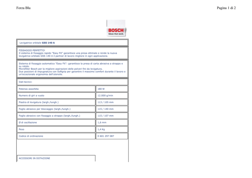 Forza Blu Pagina 1 di 2 Levigatrice orbitale GSS 140 A FISSAGGIO PERFETTO! Il sistema di fissaggio rapido "Easy Fit" garantisce una presa ottimale e rende la nuova levigatrice orbitale GSS 140 A il partner di lavoro migliore in ogni applicazione. Sistema di fissaggio automatico "Easy Fit": garantisce la presa di carta abrasiva a strappo e su rotolo. Microfilter Bosch per la migliore aspirazioni delle polveri fini da levigatura. Due posizioni di impugnatura con Softgrip per garantire il massimo comfort durante il lavoro e un'eccezionale ergonomia dell'utensile. Dati tecnici: Potenza assorbita 180 W Numero di giri a vuoto 12.000 g/min Piastra di levigatura (largh./lungh.) 113 / 105 mm Foglio abrasivo per bloccaggio (largh./lungh.) 115 / 140 mm Foglio abrasivo con fissaggio a strappo (largh./lungh.) 115 / 107 mm Ø di oscillazione 1,6 mm Peso 1,4 Kg Codice di ordinazione 0 601 297 087 ACCESSORI IN DOTAZIONE Forza Blu Pagina 2 di 2 Valigetta codice Piastra foracarta codice 2 fogli abrasivi ... codice Scatola Microfilter codice Garanzia Bosch Per tutti gli elettroutensili, utensili ad aria compressa e strumenti di misura Bosch è prevista una garanzia di 24 mesi per i consumatori privati (non soggetti a Partita I.V.A.). Per tutti gli impieghi professionali, essi hanno invece una garanzia di 12 mesi. La garanzia è valida dalla data dell'acquisto riportata sul documento fiscale. Si escludono dalla garanzia: - le parti soggette a normale consumo dovuto all'uso, nonch è i difetti riconducibili all'uso o alla natura stessa degli oggetti. - i difetti dovuti alla mancata osservanza delle indicazioni riportate sul manuale d'uso, all'uso non conforme alle prescrizioni, a condizioni ambientali anomale, al sovraccarico o alla mancata manutenzione e cura. - i difetti riconducibili all'uso di ricambi non originali - gli utensili modificati o manomessi. Robert Bosch S.p.A. © Copyright 2003 Modifiche Ci riserviamo il diritto di modificare i dati tecnici. Le illustrazioni non hanno valore vincolante. Si declina ogni responsabilità per errori di stampa. Aggiornato al 01-07-2003.