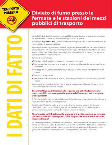I DATI DI FATTO TRASPORTO PUBBLICO Divieto di fumo presso le fermate e le stazioni dei mezzi pubblici di trasporto L’articolo 6A della Smoke-free Environment Act 2000 (legge sul divieto di fumo in ambienti pubblici del 2000) impone il divieto di fumo in vari luoghi pubblici all’aperto. A partire dal 7 gennaio 2013, vigerà il divieto di fumare presso tutte le fermate e le stazioni dei mezzi pubblici di trasporto nel NSW. È già vietato fumare negli ambienti al chiuso degli spazi pubblici nel NSW, compresi alcuni spazi presso le fermate e le stazioni dei mezzi pubblici. La legge estende il divieto di fumo alle zone all’aperto di fermate dell’autobus, marciapiedi delle stazioni ferroviarie, attracchi dei traghetti, posteggi dei taxi e stazioni del tram. Il divieto di fumo vale per: 4 Marciapiedi delle stazioni ferroviarie per passeggeri e dei tram; 4 Fermate dell’autobus, comprese le zone in cui i passeggeri fanno la fila o attendono l’arrivo del mezzo; 4 Posteggi dei taxi, comprese le zone in cui i passeggeri fanno la fila o attendono l’arrivo del mezzo; 4 Attracchi dei traghetti; e 4 Fermate del tram, comprese le zone in cui i passeggeri fanno la fila o attendono l’arrivo del mezzo. Il divieto vige a prescindere dal fatto che la zona in cui i passeggeri fanno la fila o attendono l’arrivo del mezzo sia o meno al coperto. Si commetterà un’infrazione alla legge se si è soli alla fermata dei mezzi pubblici, ad esempio alla fermata dell’autobus, e ci si accende una sigaretta? Sì. Se si fuma alla fermata del tram, alla fermata dell’autobus o al posteggio dei taxi si infrange la legge anche se si è l’unica persona presente. Ciò è dovuto al fatto che anche se un fumatore è l’unica persona presente alla fermata dell’autobus quando accende una sigaretta, è improbabile che continui ad essere la sola persona presente durante il tempo che impiega a fumare la sigaretta. Si commette un’infrazione alla legge se si transita presso una fermata dei mezzi pubblici di trasporto, ad esempio una fermata dell’autobus, mentre si fuma? No. La legge prevede apposite esenzioni per evitare che si commetta un’infrazione se si transita presso una zona in cui vige il divieto di fumo, ad esempio una fermata dell’autobus, una fermata del tram o un posteggio dei taxi, mentre si fuma. La finalità della legge è di impedire che la gente fumi mentre fa la fila per prendere un mezzo pubblico o attende il suo arrivo. Vi sarà una segnaletica per indicare dove vige il divieto di fumo? La diversità dei vari mezzi pubblici di trasporto rende difficile avere delle norme uniformi in materia di segnaletica. Poiché la stragrande maggioranza dei marciapiedi delle stazioni del tram e delle stazioni ferroviarie nonché degli attracchi dei traghetti hanno una zona ben designata, vigerà l’obbligo di esporre la segnaletica di divieto di fumo (‘No Smoking’). Di norma non esiste una zona chiaramente designata come fermata del tram, fermata dell’autobus o posteggio di taxi, e pertanto non vigerà l’obbligo di approntare apposita segnaletica presso le fermate dei mezzi pubblici e presso i posteggi dei taxi nel NSW. La legge consente al Ministero della salute di collaborare con le amministrazioni locali e con altri organi della pubblica amministrazione per realizzare segnaletica che sia consona ai diversi tipi di fermate dei mezzi pubblici di trasporto. Come verrà sanzionato il divieto? Il NSW Health ha la competenza per l’amministrazione e il sanzionamento della Smoke-free Environment Act 2000. Gli ispettori del NSW Health sono autorizzati a sanzionare il divieto presso le fermate e le stazioni dei mezzi pubblici di trasporto. Sono previste sanzioni pecuniarie di importo fino a $550 a carico di chiunque non rispetti la legge. Perché è stata varata questa nuova legge? Le fermate e le stazioni dei mezzi pubblici sono spesso frequentate da un gran numero di persone. I pendolari hanno poche probabilità di evitare il fumo di tabacco di seconda mano in tali zone. Non esistono livelli sicuri di esposizione al fumo di tabacco di seconda mano. Questo è il fumo che i fumatori esalano dopo averlo inalato da una sigaretta accesa. Negli adulti, l’inalazione di fumo di tabacco di seconda mano può far aumentare il rischio di disturbi cardiovascolari, di tumore del polmone e di altre malattie polmonari. Inoltre può aggravare gli effetti di altre malattie quali asma e bronchite. L’esposizione di ex fumatori al fumo di tabacco altrui fa aumentare le probabilità di riprendere a fumare. Per i bambini, l’inalazione di fumo di tabacco di seconda mano è ancora più pericolosa. Ciò è dovuto al fatto che le vie respiratorie dei bambini sono più piccole e i loro sistemi immunitari sono meno sviluppati, il che aumenta le probabilità che subiscano le conseguenze dannose per la salute del fumo di tabacco di seconda mano, contraendo malattie quali bronchite, polmonite e asma. La creazione di spazi all’aperto in cui vige il divieto di fumo, ad esempio le fermate e le stazioni dei mezzi pubblici di trasporto, può offrire un ambiente che aiuta coloro che hanno smesso e rendere il fumo meno visibile ai bambini e ai giovani. Molte amministrazioni comunali nel NSW, ai sensi delle norme della Local Government Act 1993 (legge di disciplina delle amministrazioni locali del 1993), hanno gradualmente varato propri divieti relativi al fumo. Ove tali divieti esistono, possono continuare ad essere sanzionati dai ranger comunali. N.B.: Il divieto di fumo negli spazi all’aperto di esercizi pubblici e nel raggio di 4 metri da un ingresso o da un’uscita pedonale di bar, ristoranti e caffé non entrerà in vigore prima del 6 luglio 2015. Per maggiori informazioni Contattate la Tobacco Information Line al numero 1800 357 412 o visitate il sito del NSW Health: www.health.nsw.gov.au Le persone di estrazione non anglofona possono accedere alla Tobacco Information Line servendosi del servizio traduzioni e int