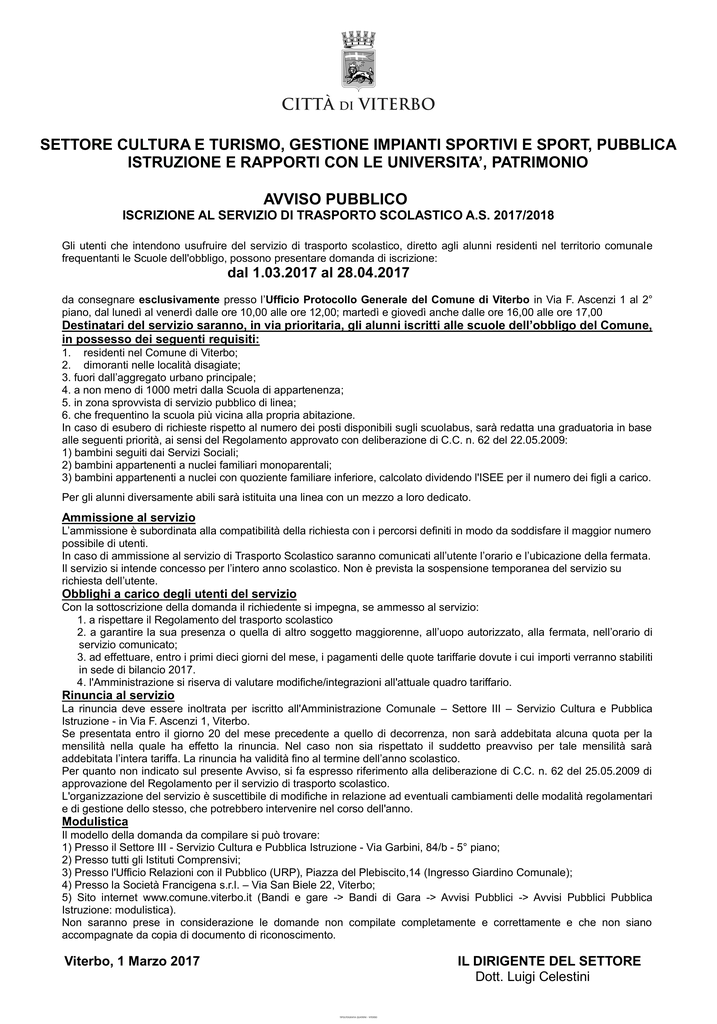 CITTÀ di Viterbo CITTÀ DI VITERBO CITTÀ DI VITERBO SETTORE CULTURA E TURISMO, GESTIONE IMPIANTI SPORTIVI E SPORT, PUBBLICA SETTORE CULTURA E TURISMO, GESTIONE IMPIANTI SPORTIVI E SPORT, PUBBLICA ISTRUZIONE E RAPPORTI LEUNIVERSITA’, UNIVERSITA’, PATRIMONIO ISTRUZIONE E RAPPORTICON CON LE PATRIMONIO AVVISOPUBBLICO PUBBLICO AVVISO ISCRIZIONE AL SERVIZIO DI TRASPORTO SCOLASTICO A.S. 2017/2018 ISCRIZIONE AL SERVIZIO DI TRASPORTO SCOLASTICO A.S. 2017/2018 Gli utenti che intendono usufruire del servizio di trasporto scolastico, diretto agli alunni residenti nel territorio comunale Gli utentifrequentanti che intendono usufruire del possono serviziopresentare di trasporto scolastico, diretto agli alunni residenti nel territorio comunale le Scuole dell'obbligo, domanda di iscrizione: frequentanti le Scuole dell'obbligo, possono presentareal domanda di iscrizione: dal 1.03.2017 28.04.2017 dal 1.03.2017 al 28.04.2017 da consegnare esclusivamente presso l’Ufficio Protocollo Generale del Comune di Viterbo in Via F. Ascenzi 1 al 2° piano, dal lunedì al venerdì dalle ore 10,00 alle ore 12,00; martedì e giovedì anche dalle ore 16,00 alle ore 17,00 da consegnare esclusivamente presso l’Ufficio Protocollo Generale del Comune di Viterbo in Via F. Ascenzi 1 al 2° Destinatari del servizio saranno, in via prioritaria, gli alunni iscritti alle scuole dell’obbligo del Comune, piano, dal lunedì al venerdì dalle ore 10,00 alle ore 12,00; martedì e giovedì anche dalle ore 16,00 alle ore 17,00 in possesso dei seguenti requisiti: Destinatari del servizio saranno, 1. residenti nel Comune di Viterbo;in via prioritaria, gli alunni iscritti alle scuole dell’obbligo del Comune, 2. dimoranti nelle località disagiate; in possesso dei seguenti requisiti: 3. fuorinel dall’aggregato principale; 1. residenti Comune diurbano Viterbo; 4. a non meno di 1000 metri dalla Scuola di appartenenza; 2. dimoranti nelle località disagiate; 5. in zona sprovvista di servizio pubblico di linea; 3. fuori dall’aggregato urbano principale; 6. che frequentino la scuola più vicina alla propria abitazione. 4. a non In meno metri dalla Scuola appartenenza; caso di di 1000 esubero di richieste rispetto di al numero dei posti disponibili sugli scuolabus, sarà redatta una graduatoria in base 5. in zona sprovvista di servizio pubblico di linea; approvato con deliberazione di C.C. n. 62 del 22.05.2009: alle seguenti priorità, ai sensi del Regolamento 1) bambini seguiti dai Servizi Sociali; 6. che frequentino la scuola più vicina alla propria abitazione. 2) esubero bambini appartenenti nuclei familiari monoparentali; In caso di di richiestea rispetto al numero dei posti disponibili sugli scuolabus, sarà redatta una graduatoria in base 3) bambini appartenenti nuclei con quoziente familiare inferiore, calcolato dividendo l'ISEE il numero dei figli a carico. alle seguenti priorità, ai sensi adel Regolamento approvato con deliberazione di C.C. n. 62perdel 22.05.2009: Perseguiti gli alunni abili sarà istituita una linea con un mezzo a loro dedicato. 1) bambini daidiversamente Servizi Sociali; 2) bambini appartenenti a nuclei familiari monoparentali; Ammissione al servizio 3) bambini appartenenti a nuclei con quoziente familiare inferiore, calcolato dividendo per il numero figli a carico. L’ammissione è subordinata alla compatibilità della richiesta con i percorsi definiti in modo l'ISEE da soddisfare il maggiordei numero possibile di utenti. Per gli alunni diversamente abili sarà istituita una linea con un mezzo a loro dedicato. In caso di ammissione al servizio di Trasporto Scolastico saranno comunicati all’utente l’orario e l’ubicazione della fermata. Il servizio si intende concesso per l’intero anno scolastico. Non è prevista la sospensione temporanea del servizio su Ammissione al servizio richiesta dell’utente. L’ammissione è subordinata alla compatibilità della richiesta con i percorsi definiti in modo da soddisfare il maggior numero Obblighi a carico degli utenti del servizio possibileCon di utenti. la sottoscrizione della domanda il richiedente si impegna, se ammesso al servizio: In caso di ammissione servizio di Trasporto Scolastico 1. a rispettareal il Regolamento del trasporto scolastico saranno comunicati all’utente l’orario e l’ubicazione della fermata. Il servizio si2.intende concesso per l’intero annodiscolastico. Non è prevista all’uopo la sospensione temporanea serviziodisu a garantire la sua presenza o quella altro soggetto maggiorenne, autorizzato, alla fermata,del nell’orario servizio comunicato; richiesta dell’utente. 3. ad effettuare, entro i primi dieci giorni del mese, i pagamenti delle quote tariffarie dovute i cui importi verranno stabiliti Obblighi a carico degli utenti del servizio in sede di bilancio 2017. Con la sottoscrizione della domanda si impegna, se ammesso al servizio: 4. l'Amministrazione si riserva ildirichiedente valutare modifiche/integrazioni all'attuale quadro tariffario. 1. a rispettare del trasporto scolastico RinunciailalRegolamento servizio 2. a garantire sua essere presenza o quella di altro soggetto maggiorenne, fermata, nell’orario di La rinuncialadeve inoltrata per iscritto all'Amministrazione Comunale all’uopo – Settoreautorizzato, III – Servizio alla Cultura e Pubblica Istruzione - in Via F. Ascenzi 1, Viterbo. servizio comunicato; presentata entroi primi il giorno 20 giorni del mese a quello didelle decorrenza, non sarà dovute addebitata alcuna quota per la stabiliti 3. ad Se effettuare, entro dieci delprecedente mese, i pagamenti quote tariffarie i cui importi verranno mensilità nella 2017. quale ha effetto la rinuncia. Nel caso non sia rispettato il suddetto preavviso per tale mensilità sarà in sede di bilancio addebitata l’intera tariffa. La rinuncia ha validità fino al termine dell’anno scolastico. 4. l'Amministrazione si riserva di valutare modifiche/integrazioni all'attuale quadro tariffario. Per quanto non indica